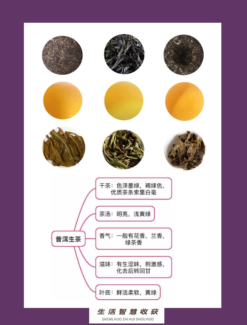 ①普洱生茶是以符合普洱茶产地环境条件下生长的云南大叶种茶树鲜叶为原料,经杀青、揉捻、日光干燥、蒸压成型等工艺制成的紧压茶。其品质特征为干茶色泽墨绿,汤色绿黄清亮,香气清纯持久,滋味浓厚回甘,叶底肥厚黄绿。