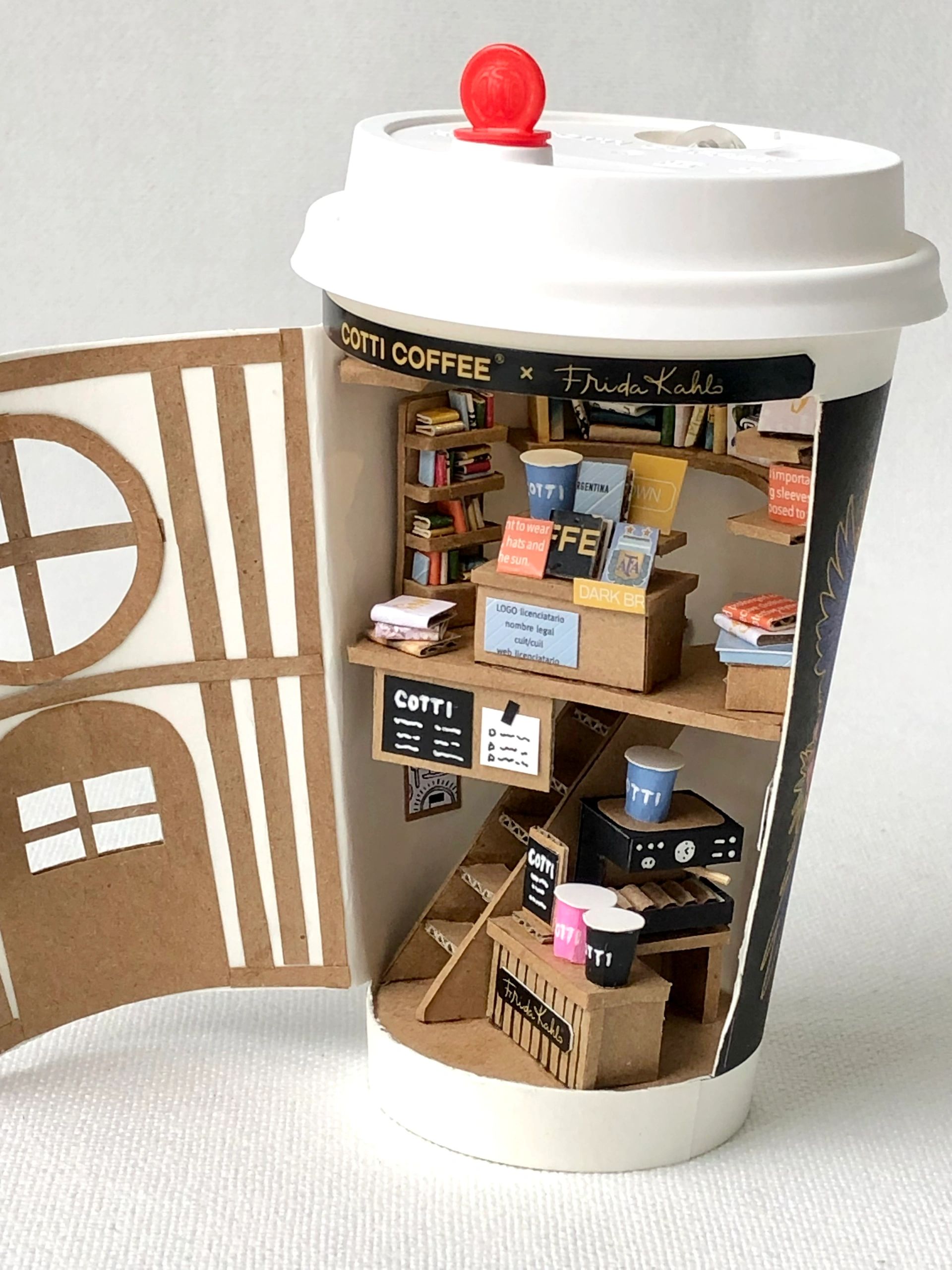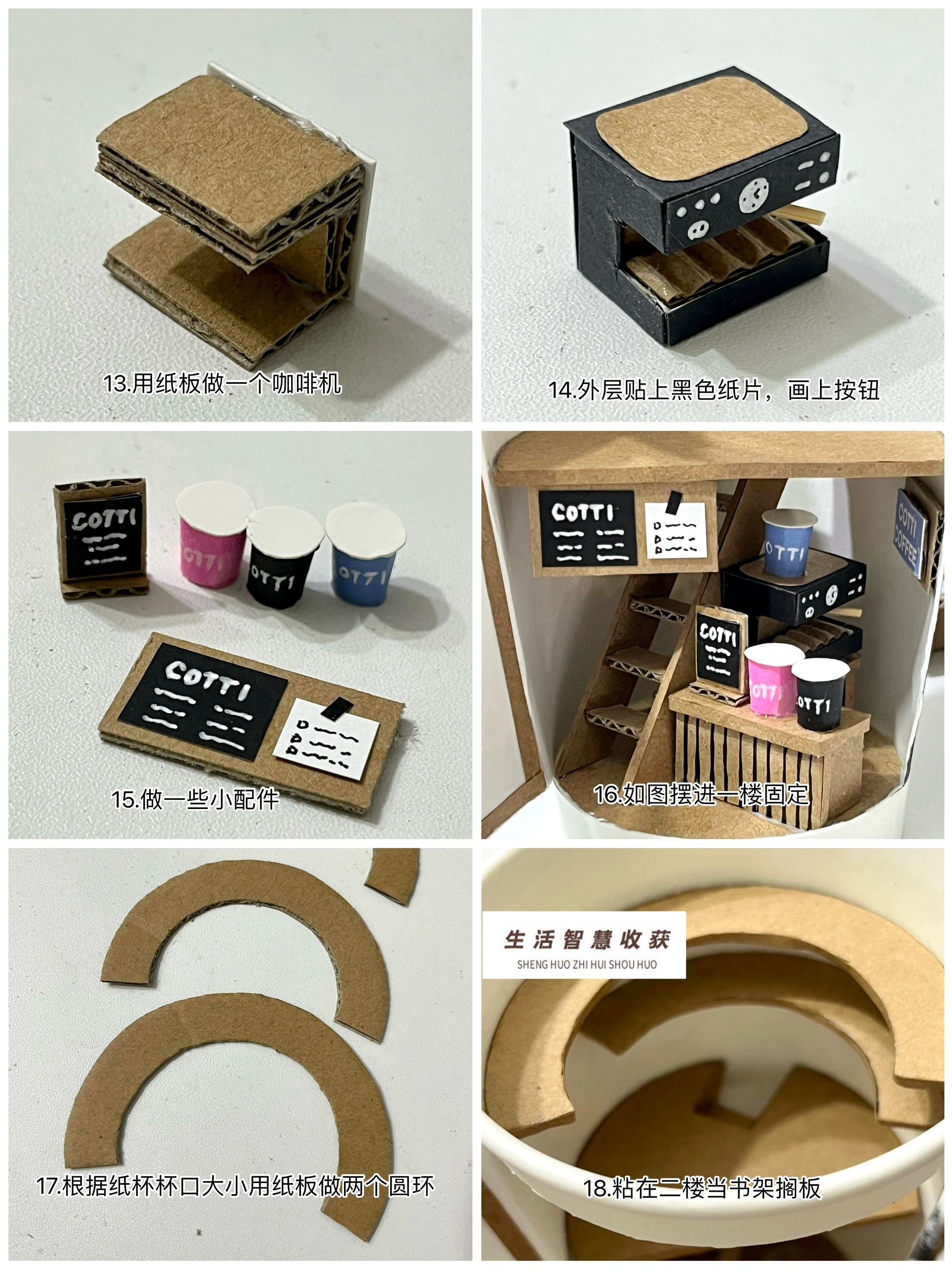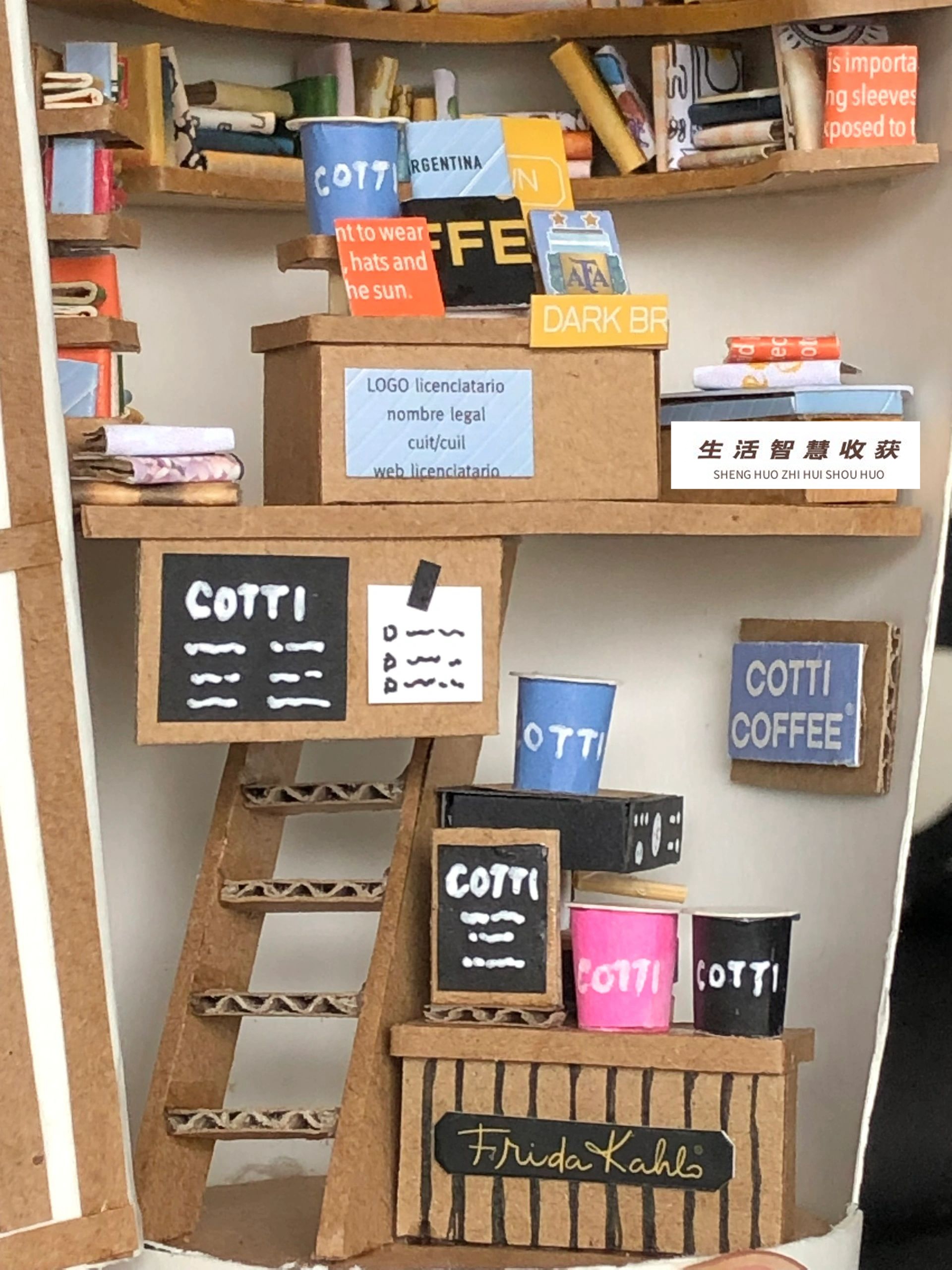 杯子里的小世界再添新成员,用库迪的新品咖啡纸杯做了一个迷你咖啡书屋,太可爱了!一楼是咖啡店,二楼是书吧,书架上摆满了琳琅满目的迷你小书,边喝咖啡边看书,惬意!保留了杯子开口部分,做了镂空的门窗,小屋里装上灯珠,打开灯,满满的温暖氛围感,爱了爱了!
