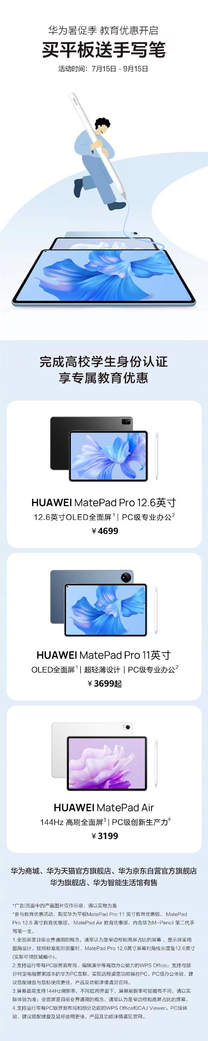 打算入手平板电脑的人这次终于等到了!华为在7月10日至9月15日期间开启教育优惠,完成教育认证后即可在购买华为MatePad Air、华为MatePad Pro 11英寸和华为MatePad Pro 12.6英寸教育优惠版套装时,获赠价值599元手写笔一支。 众所周知,华为MatePad 系列平板有着多个版本可供选择,如华为MatePad Pro 12.6英寸、华为MatePad Pro 11英寸、华为MatePad Air、华为MatePad 2023款、华为MatePad 11英寸 2023款、华为MateBook E Go等。 其中,华为MatePad Pro系列的整体实力强大且专业,比如它所配备的120Hz OLED原色全面屏,拥有10.7亿显示效果和P3广色域,能够呈现出细腻真实、色彩丰富的显示效果,很适合视频剪辑/音乐创作、绘画设计等专业创作人士。 如果正在实习或专业论文,那么可以选择华为MatePad Air。144Hz刷新率、3:2生产力屏幕比例、PC级WPS、PC级CAJViewer等,可为用户提供更好的助力,大大提升效率。大家感觉哪一款适合自己呢?