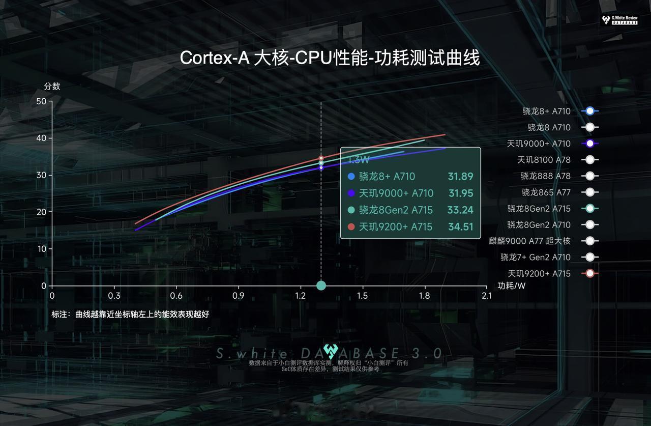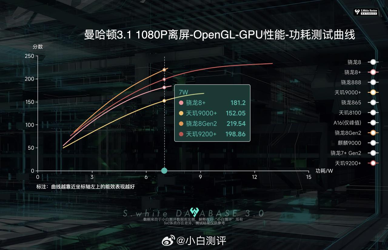 数据库新增 天玑9200+ SoC能效曲线 1、超大核X3与骁龙8Gen2 X3表现相比,2W以下低频下天玑9200+能效要好些,2W以上则8Gen2好些,峰值性能最高跑到57.41分(4 W); 2、A715大核峰值功耗最高能跑到40.9分(1.9 W),从能效曲线来看9200+表现稍微领先于骁龙8Gen2; 3、GPU方面,曼哈顿3.1 1080P离屏峰值性能跑到234 FPS,所需的功耗13W;实测872MHz频率能跑到212 FPS(8.15 W),也就是说从872到1150MHz,性能提升10%的同时,功耗增加了约60%。 SoC体质存在差异,测试仅供参考