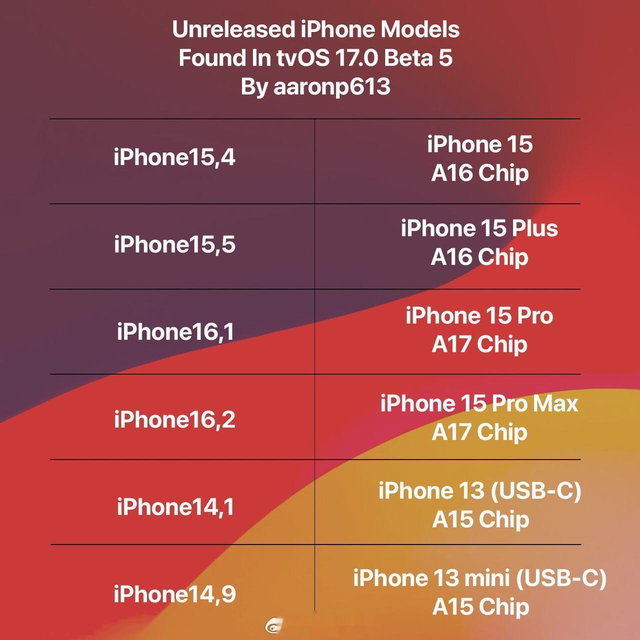 老款iPhone也会有C口版本?[欢乐熊出没]网友aaronp13在tvOV 17的代码中发现了iPhone 15系列的身影,而除了iPhone 15系列,还有两款未知机型(型号iPhone14,1和iPhone14,9),其猜测可能是iPhone 13/13 mini的USB-C版本。不知道有没有可能是新款SE?🤔