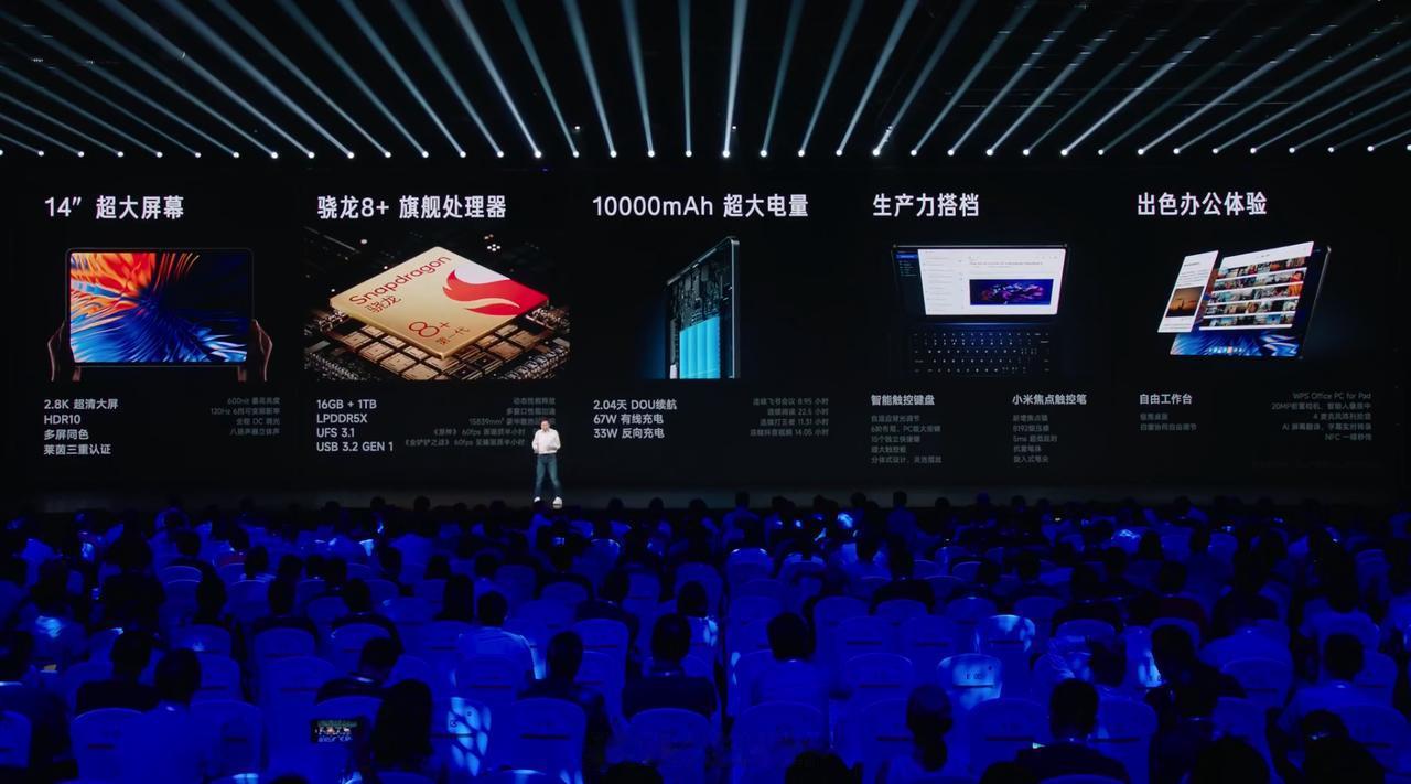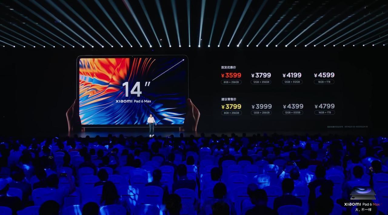 第二款新品:小米平板6 Max 14英寸 价格:8+256GB版首销3599元起,1TB版首发4599元 主要配置:14英寸2880*1800分辨率的LCD屏,120Hz刷新率,HBM 600nit,P3色域,支持HDR10、杜比视界等,指纹解锁+人脸解锁,全金属一体化外观,机身厚约6.53mm,重约750g,前置20MP,后置50MP+2MP,骁龙8+处理器,10000mAh电池,67W充电,33W反向充电,小米澎湃G1电池管理芯片,8扬声器、4麦克风,支持USB 3.2 Gen1、DP输出,内置MIUI Pad 4等。