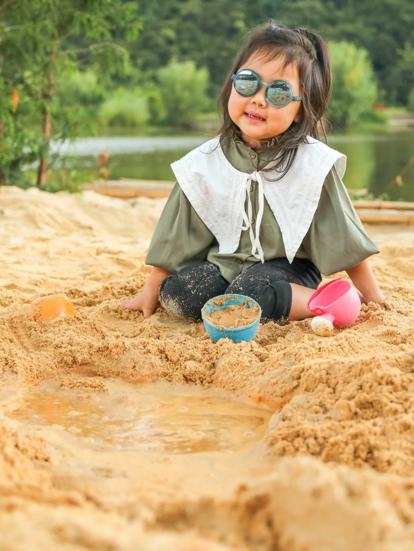 带上玩沙工具小朋友可以玩一整天,沙池前是一潭碧水,家长请注意。