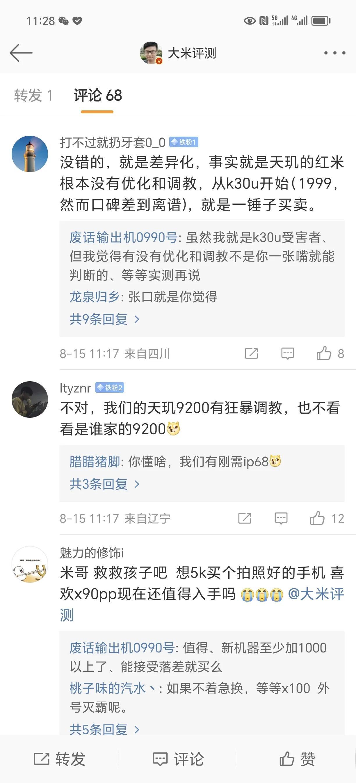 红米K60 Ultra和一加Ace2 Pro可以说是井水不犯河水的产品,但这两家来了波死缠烂打式互殴营销,官方和KOL都在明争暗斗,气氛到了这里大家不拿来比就不礼貌了。[尬笑] 一加大概率还是贵个几百块钱,但肯定各有各的好,都还是各自价位区间数一数二的好产品,到头来红米一加没怎么样,反正iQOO是被干碎了[吐舌][吐舌]