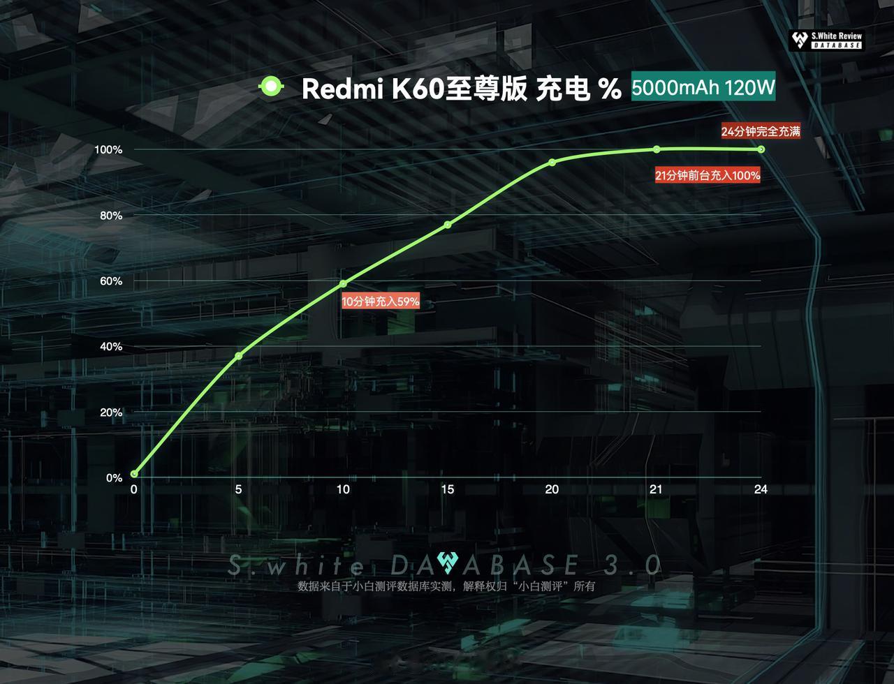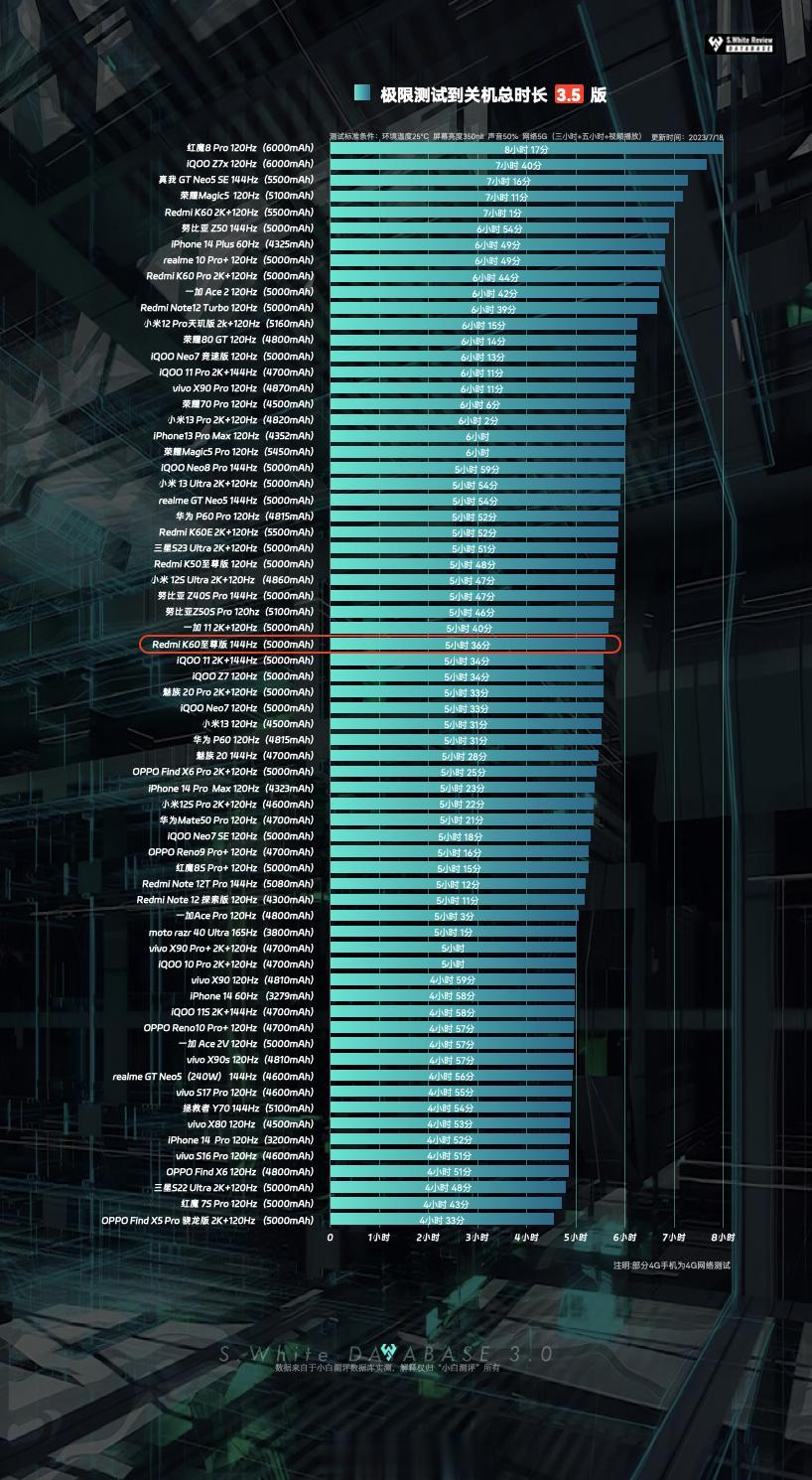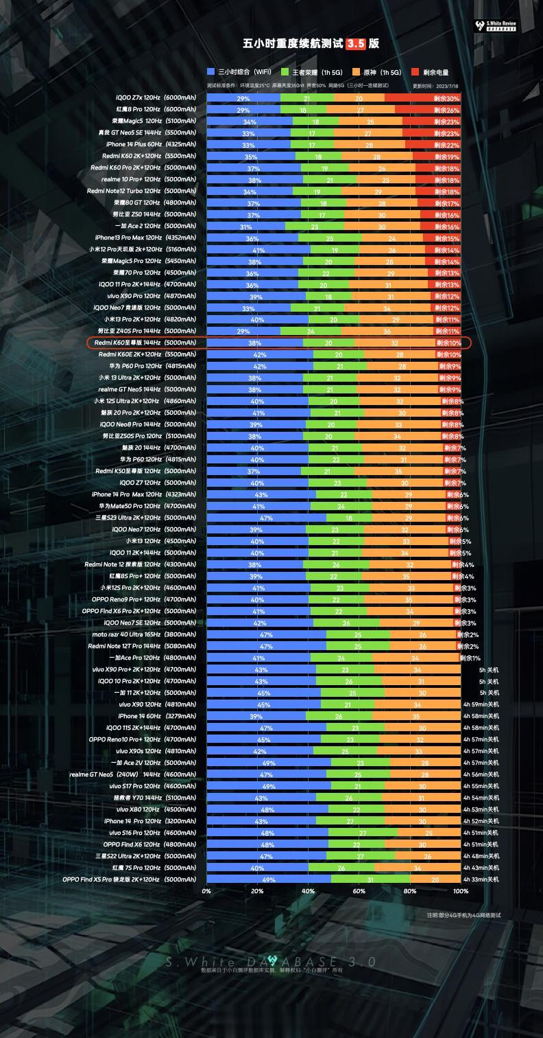 Redmi K60至尊版 续航充电表现如何?数据库实测👇🏻 1、5000mAh电池容量,144Hz刷新率,2712*1220屏幕分辨率,三小时轻度续航测试剩余62%,五小时重度续航测试剩余10%,极限续航测试直到关机,K60至尊版共坚持了5小时36分; 2、120W有线充电,10分钟充入59%,21分钟前台充入100%,24分钟完全充满; 环境温25℃±0.5℃,屏幕亮度350nit,声音50%(5小时重度续航、极限续航测试:性能模式) (数据基于 Redmi K60至尊版 测试时最新版 MIUI 14.0.5.0.TMLCNXM 系统测试)