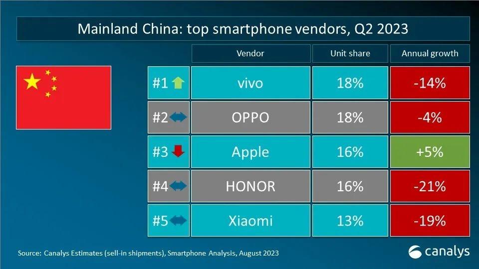 【2023年Q2手机市场全线大跌】据市场分析机构Canalys的最新数据,2023年第二季度全球智能手机市场同比下降10%,达2.58亿部。其中,三星以5300万部的出货量稳居榜首;苹果以17%的市场份额和4300万部出货量保持第二,小米以3320万部的出货量排名第三,OPPO排名第四。传音则以2270万部的出货量首次跃升至前五,年增长率达22%。国内市场方面,海外第一名的小米以13%份额排在第五,vivo则以18%的份额位列第一。