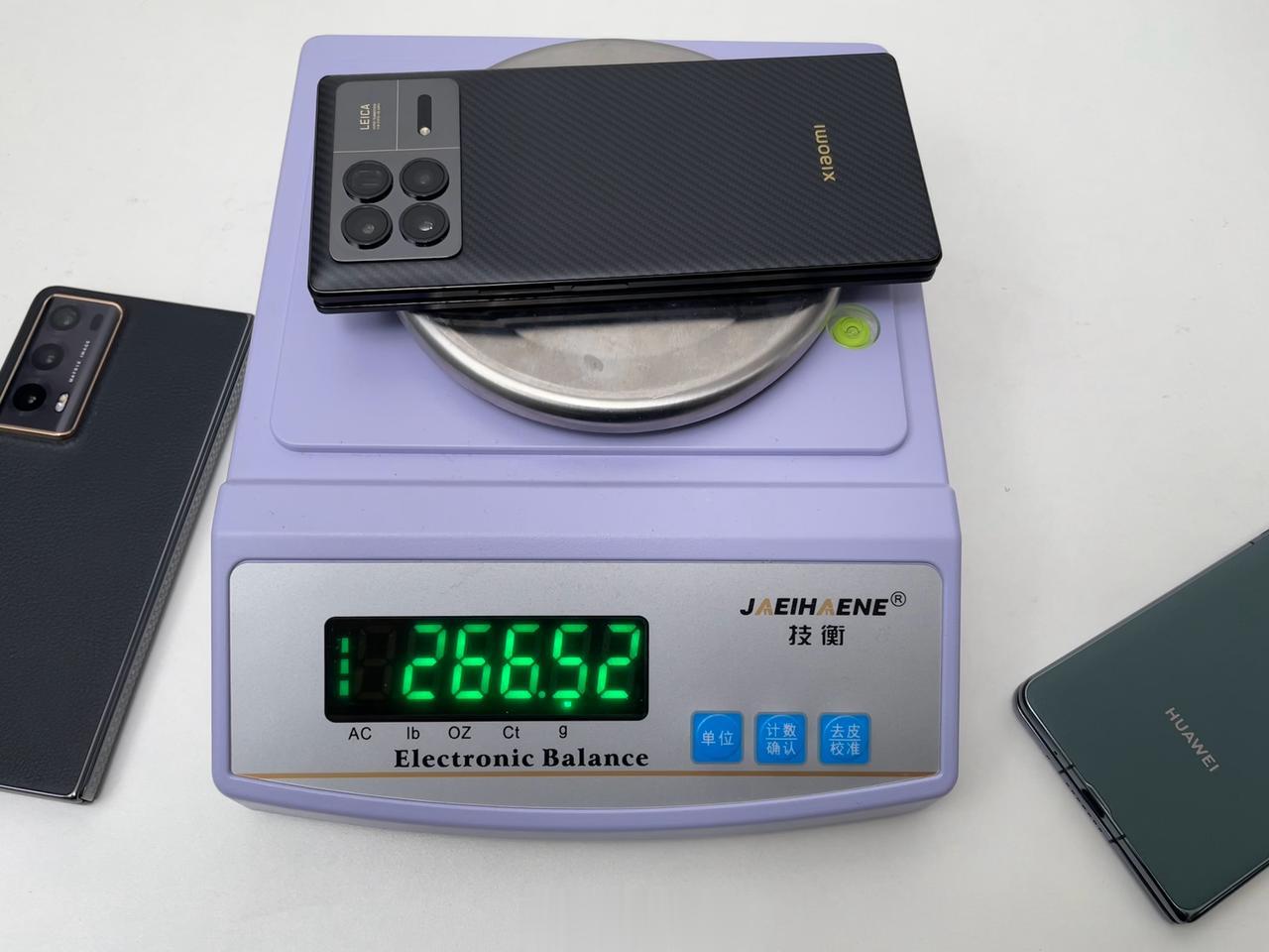 用工作室的秤随手称一下,两台都是16+512GB,内外屏都有出厂贴膜,不插SIM卡称重,荣耀Magic V2至臻版重约235.34g,小米MIX Fold3龙鳞纤维版重约266.52g。 前者更轻薄但取舍了部分配置,后者不牺牲配置但更重一些,荣耀小米这两台价格也差不多,怎么选择就看大家喜好了[微风]