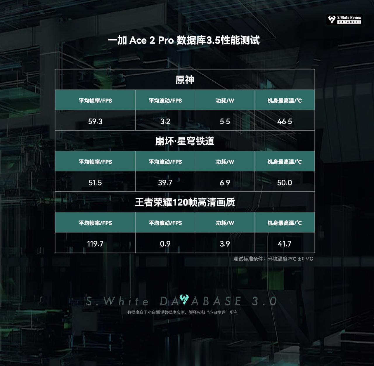一加Ace2 Pro性能表现如何?数据库实测 1、《原神》数据库3.5测试:平均帧率 59.3FPS,功耗 5.5 W,机身最高温度 46.5 ℃; 2、《星穹铁道》数据库3.5测试:平均帧率 51.5 FPS,功耗 6.9 W,机身最高50 ℃。 3、《王者荣耀》120帧+高清画质:平均帧率 119.7 FPS,功耗 3.9 W,机身最高41.7 ℃; 测试标准条件:环境温25℃±0.5℃,屏幕亮度350nit,声音50%,性能模式。(数据基于 一加 Ace 2 Pro 测试时最新版 PJA110_13.1.1.306(CN01) 系统测试)