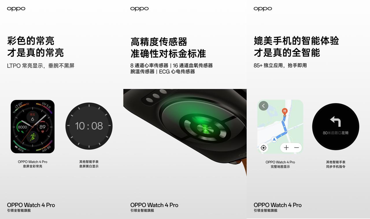 虽说都是智能手表,但是市面上的大部分智能表都可以说是假智能!智能手表在芯片制程、算力和APP数量支持等方面是有比较高要求的,像是QQ、微信、支付宝、百度地图等第三方APP,都能够随意安装。而苹果OPPO华为显然是做得比较好的三家厂商。 像是OPPO Watch 3 Pro上面就搭载了高通骁龙W5可穿戴芯片,带来了2倍的性能提升,同时功耗也大幅降低,日常使用很流畅。这款手表上面还能够安装85+的第三方APP,基本上能够覆盖各种使用场景。 如今OPPO Watch 4 Pro也会很快跟我们见面,从官方给出的数据来看,这款新手表将支持彩色LTPO常亮、ECG心电功能、85+独立应用以及旗舰双芯等等配置,相比于上代产品是有比较大的提升,值得期待一波。