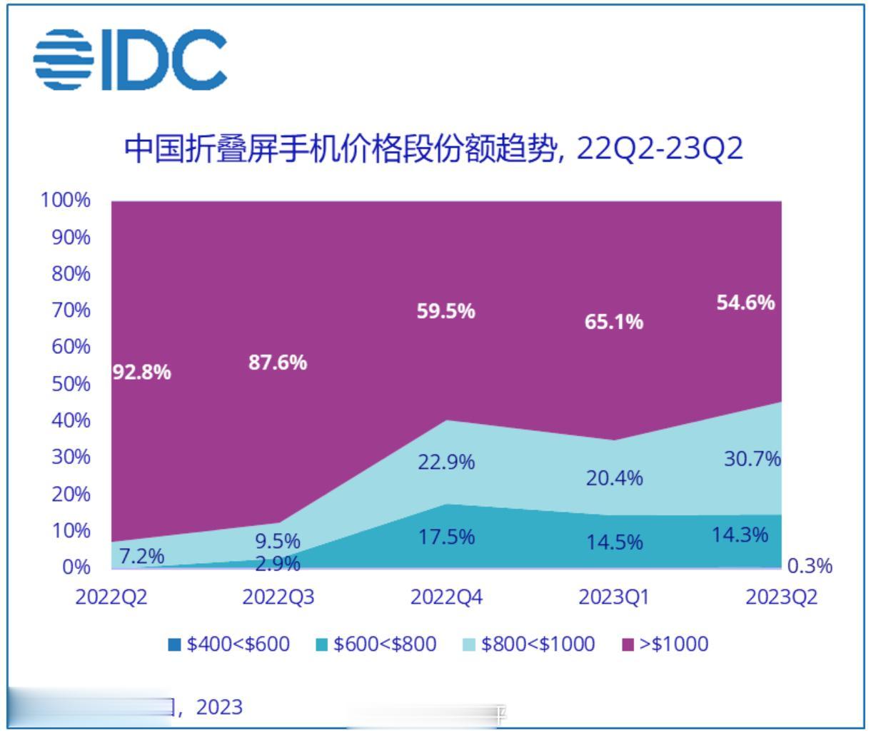 IDC发布的2023Q2国内折叠屏手机市场份额排名:①华为(43%) ②vivo(19.7%) ③OPPO(15.9%)④三星(8.9%)⑤荣耀(7.2%)⑥联想(3.3%) ⑦小米(2%)。 Q1和Q2一起统计的话,上半年华为第一,OPPO第二。折叠屏市场目前是持续增长中,价格也有下探,你产生过购买折叠屏的念头吗?[吐舌]