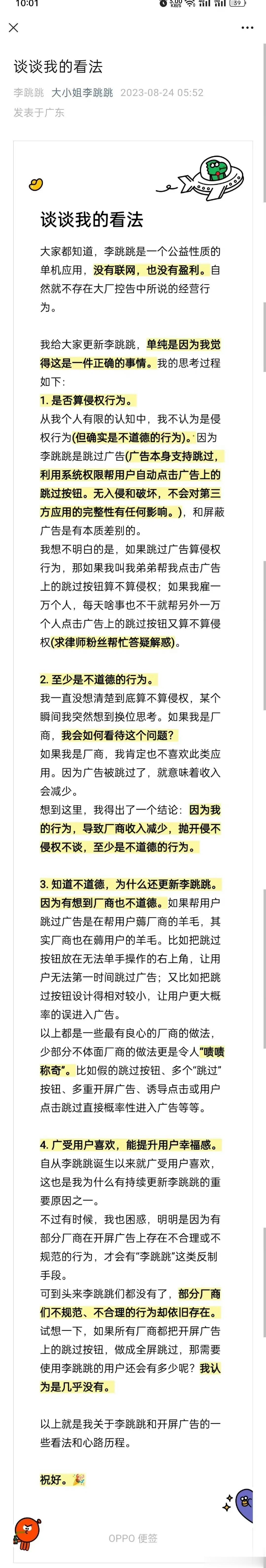 安卓手机广告收割机“李跳跳”,一个没有盈利的公益性APP,因为收到律师函,现在宣布无限期停更,安卓机恢复广告满天飞的模式,预测苹果销量又要涨一波,还有多少人没用过甚至没听过“李跳跳”的?