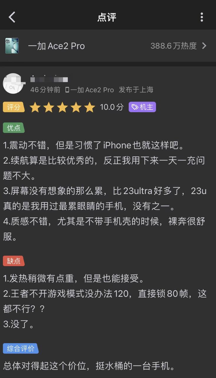 一加Ace2 Pro这次真的押对宝了,骁龙8Gen2卖到2999元,基本没什么对手,红米K60至尊版又是天玑9200+和直屏,配置和价钱相差大,4000元以上则是小米13、荣耀Magic5那些高定位的旗舰为主,3000价位基本就是和魅族20竞争,但这款魅族没多少人会入手吧? 目前一加Ace2 Pro已经开售,有不少用户已经上手体验了,翻了酷安几个评价,发现好评率还蛮高的,多数表示它的性能非常不错,裸机的质感也不错,同时振感甚至还能与iPhone相比,屏幕这次升级到了京东方Q9+材质,支持高频PWM调光,护眼表现得到不少用户认可的。 所以说,你们会买2999元就能拿下骁龙8Gen2、150W闪充、安卓体积最大的马达的一加Ace2 Pro吗?