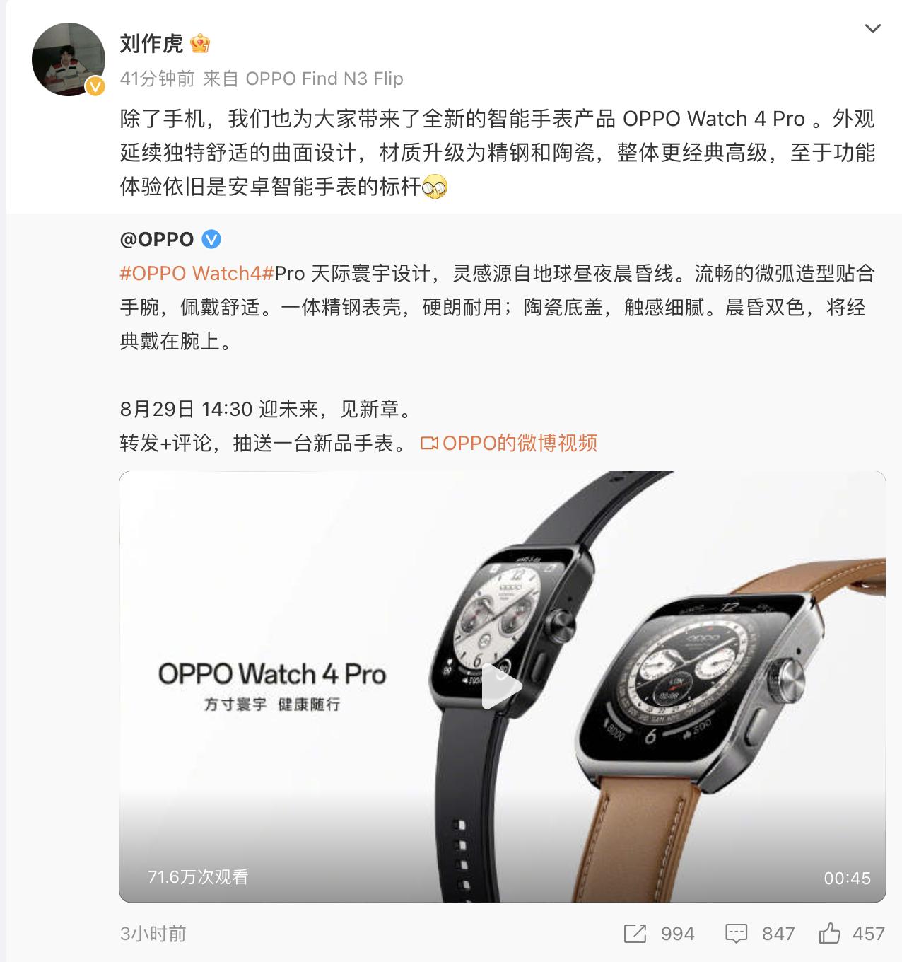 智能手表原来也可以这么商务啊,大老板戴上去也毫无违和感,OPPO Watch 4 Pro这次的设计走心了,感觉与华为那些不相上下啊! 为了更好贴合手腕,OPPO这次的设计不是那种非常方方正正的,而是采用3D弧面设计,加上平整的屏幕和陶瓷底壳,整体的质感看起来不错,感觉戴上去应该会很舒适。同时为了更加符合高端商务的定位,表冠采用了钻石纹理雕琢,搭配不锈钢中框,整体看起来很精致。 OPPO首席产品官刘作虎还提到OPPO Watch 4 Pro的材质是升级为精钢和陶瓷,这堆料丝毫不亚于智能手机啊,OPPO真舍得下成本!同时他还说功能体验依旧是安卓智能手表的标杆,估计性能、智能体验、健康这些有不小升级,期待~ 就不知道这次质感大升级的OPPO Watch 4 Pro会卖多少钱了,隔壁一样定位的华为Watch 4 Pro是卖3300多,OPPO这款卖2500?3000?期待一波8月29日的发布会~