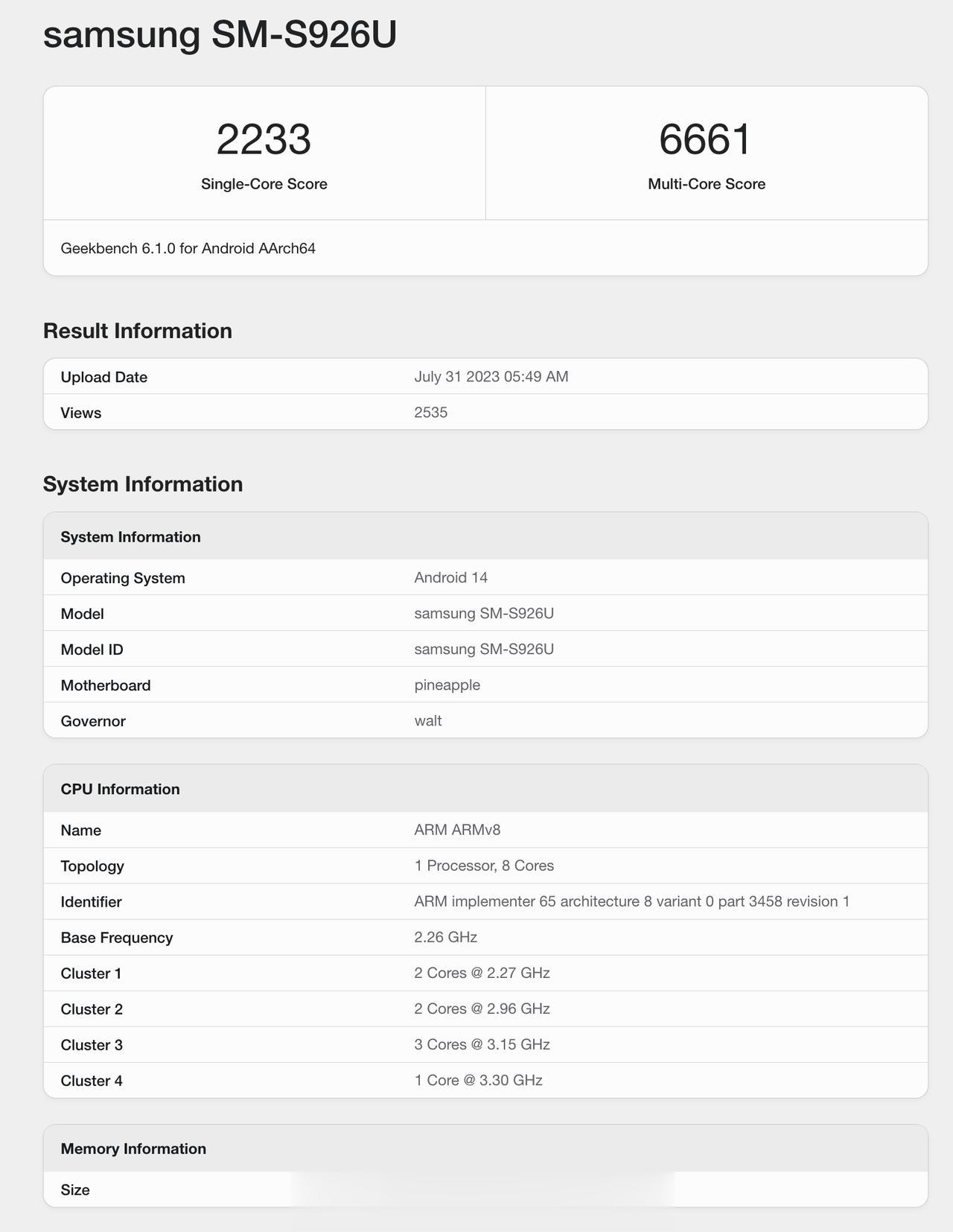 疑似「骁龙8 Gen3常规版」跑分曝光,来自努比亚新机,Geekbench 5单核1596,多核5977,CPU是1+5+2架构,1*3.19GHz➕5*2.96GHz➕2*2.27GHz,Adreno 750 GPU。 图3是骁龙8 Gen3 For Galaxy高频版在Geekbench 6.1下的跑分,来自三星S24+工程机,CPU是1+3+2+2架构,具体为1*3.3GHz X4超大核、3*3.15GHz A720大核、2*2.96GHz A720大核、2*2.27GHz A520小核,Adreno 750 GPU。