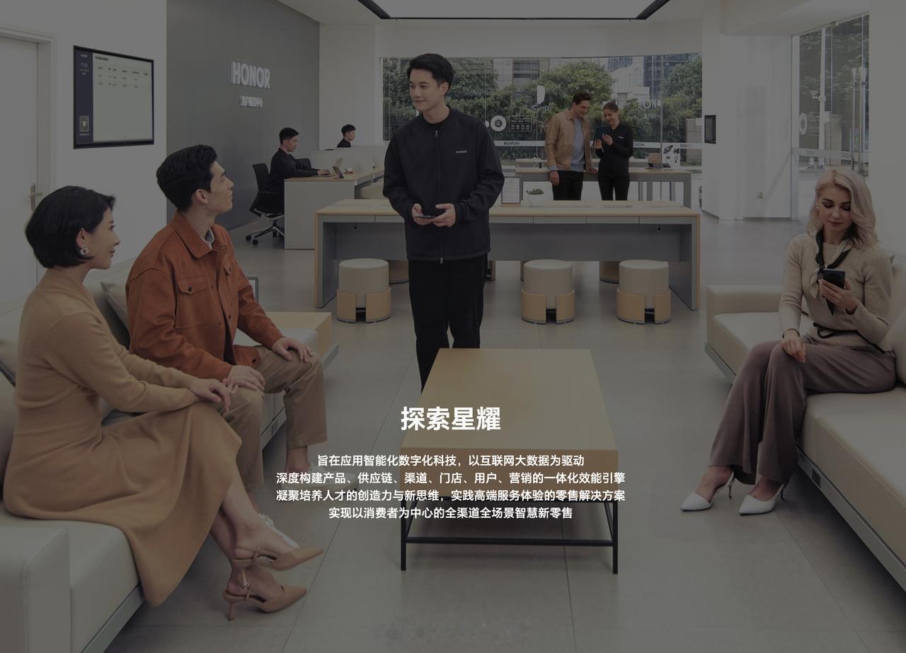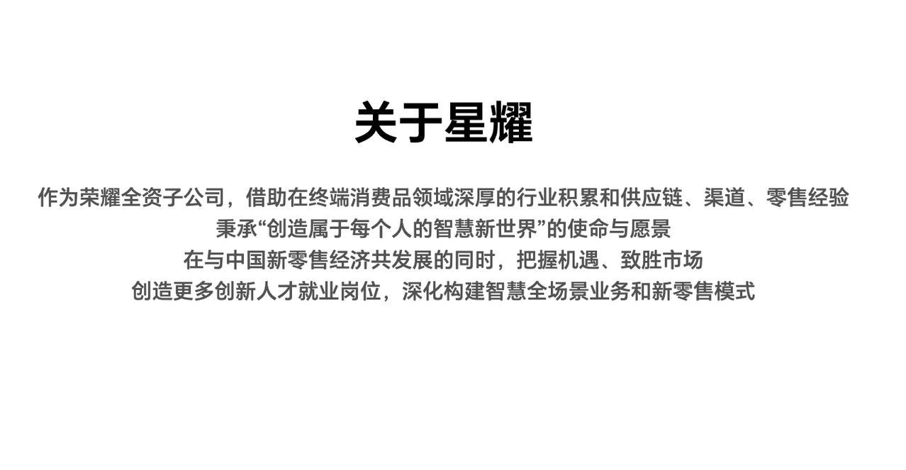 荣耀全资子公司:「星耀」官网上线[吃瓜群众] 官方介绍是:“旨在应用智能化数字化科技,以互联网大数据为驱动,深度构建产品、供应链、渠道、门店、用户、营销的一体化效能引擎,凝聚培养人才的创造力与新思维,实践高端服务体验的零售解决方案,实现以消费者为中心的全渠道全场景智慧新零售。”