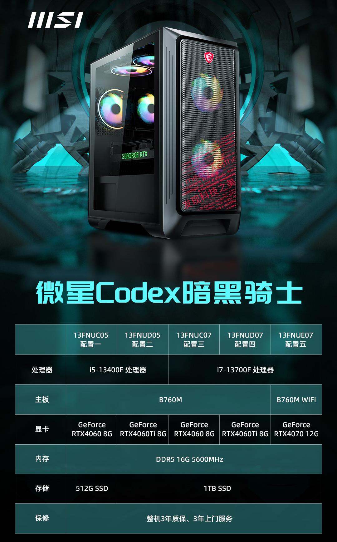 【微星发布暗黑骑士电脑主机】近日,微星新品电脑主机Codex暗黑骑士系列正式发布,据了解,Codex暗黑骑士系列电脑主机全线采用全新英特尔第13代i5/i7处理器,搭载RTX40系列全新光追显卡、B760M+DDR5内存,顶配可选i7-13700F+RTX 4070组合。此外,暗黑骑士机箱采用高效的风道设计,材质为SECC 0.6mm镀锌钢,具备抗锈特性。卡扣式可拆卸防尘设计有效隔离灰尘,维持内部清洁。水冷和风冷风道的优化确保高效冷却,满足用户对性能和散热的高要求。