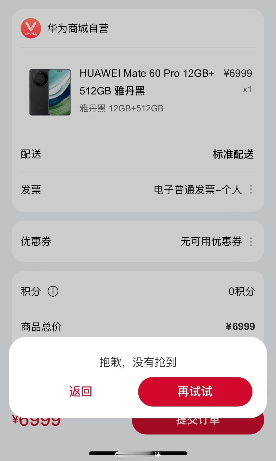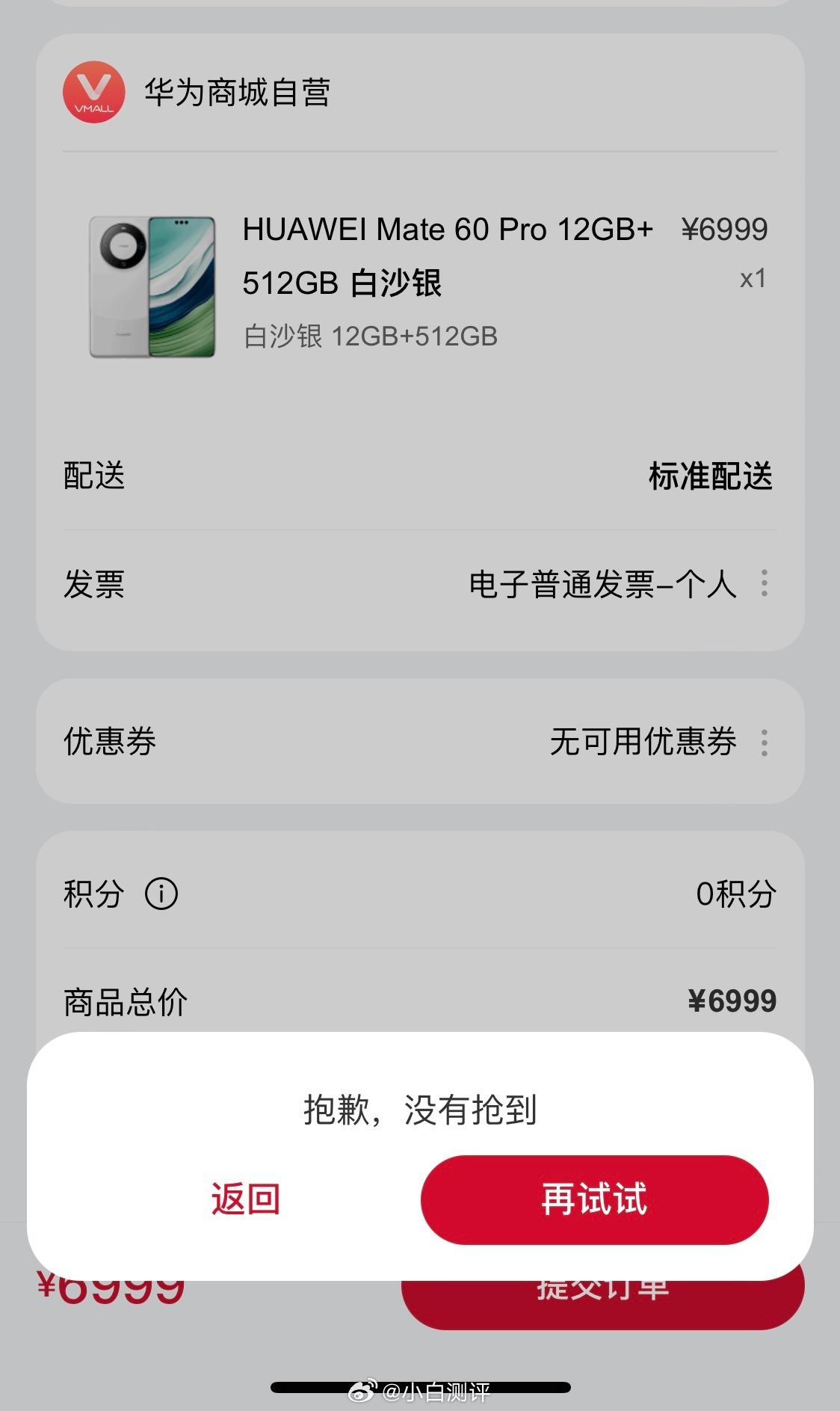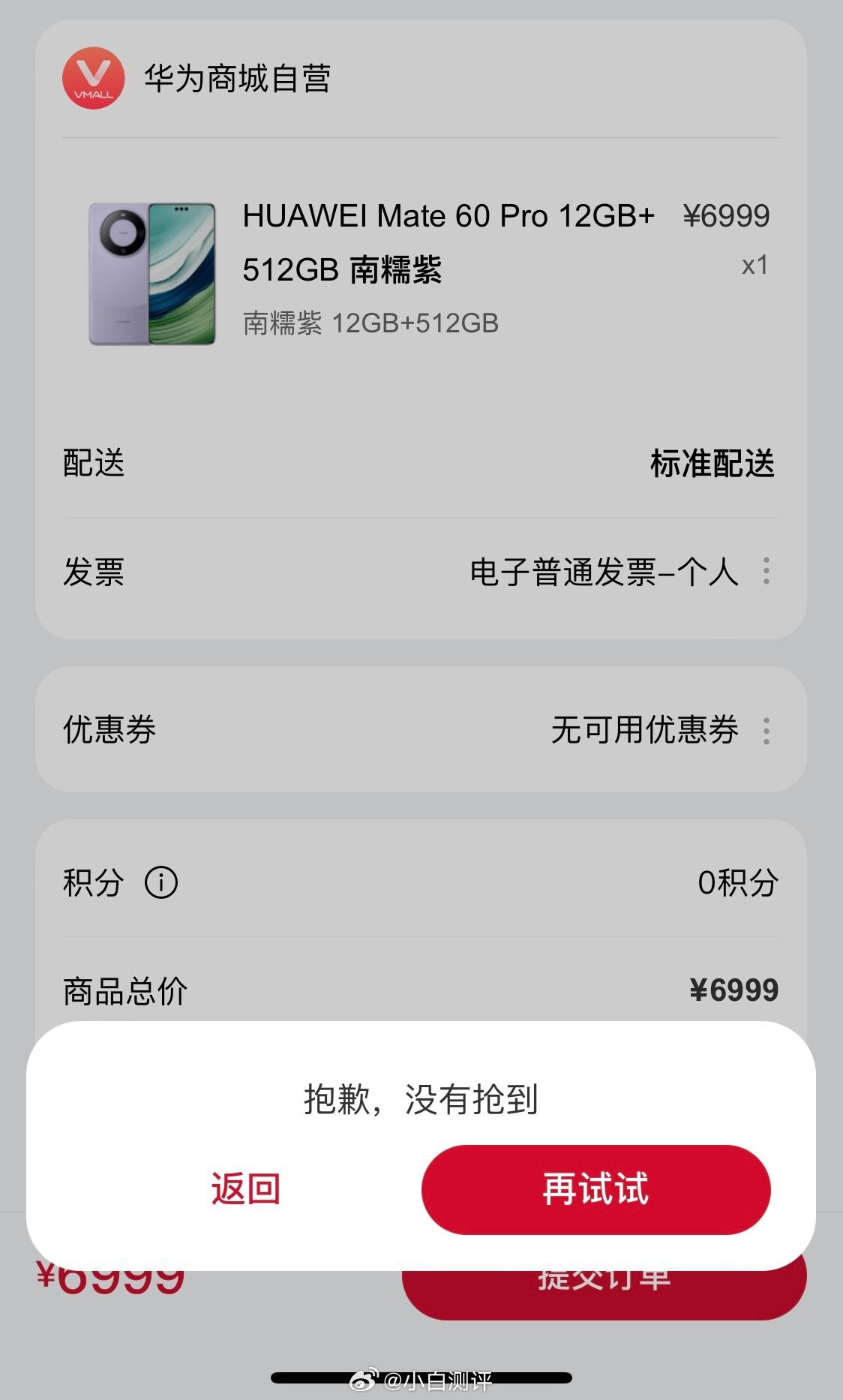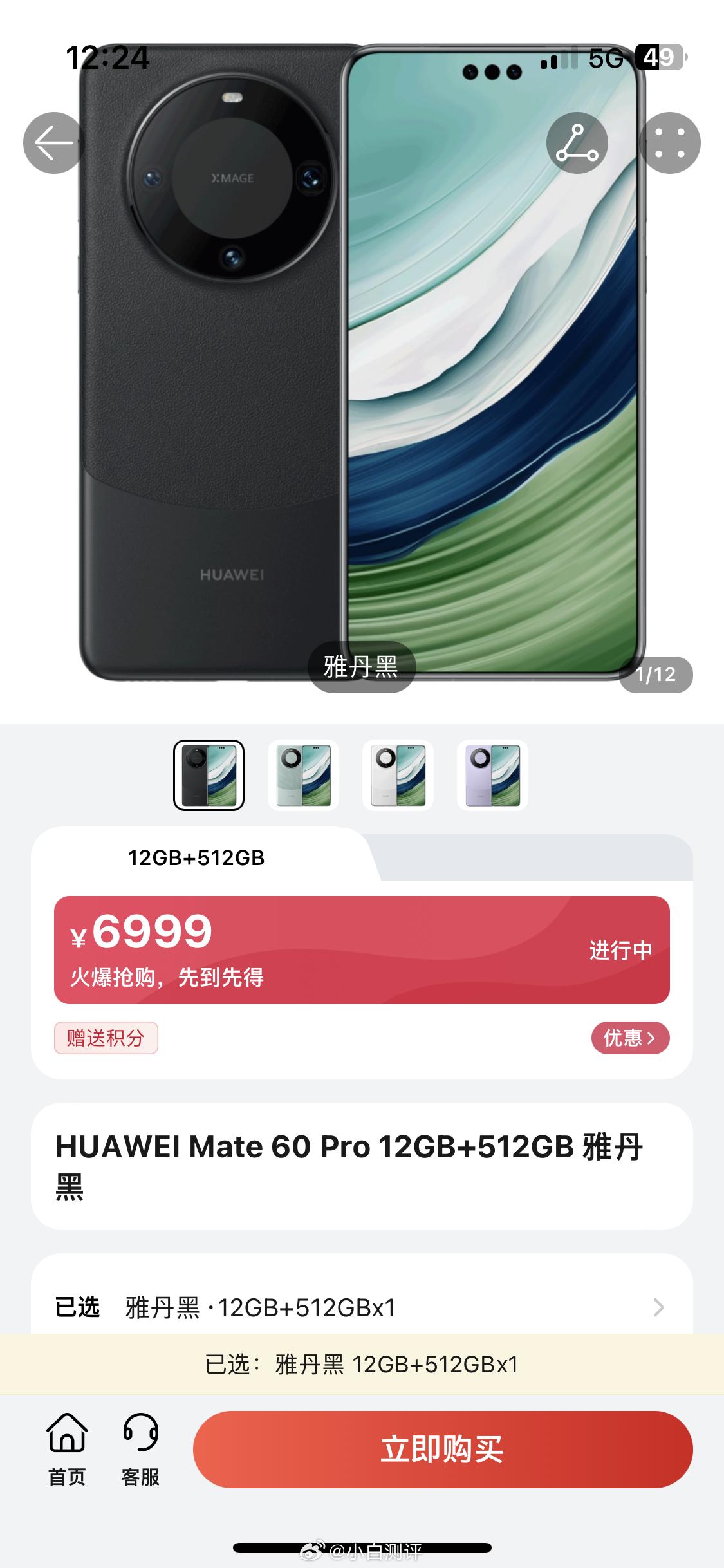 华为Mate 60 Pro直接开卖了 12+512GB版售价6999元 雅丹黑、雅川青、白沙银、南糯紫4个配色 下单抢不到[苦涩]