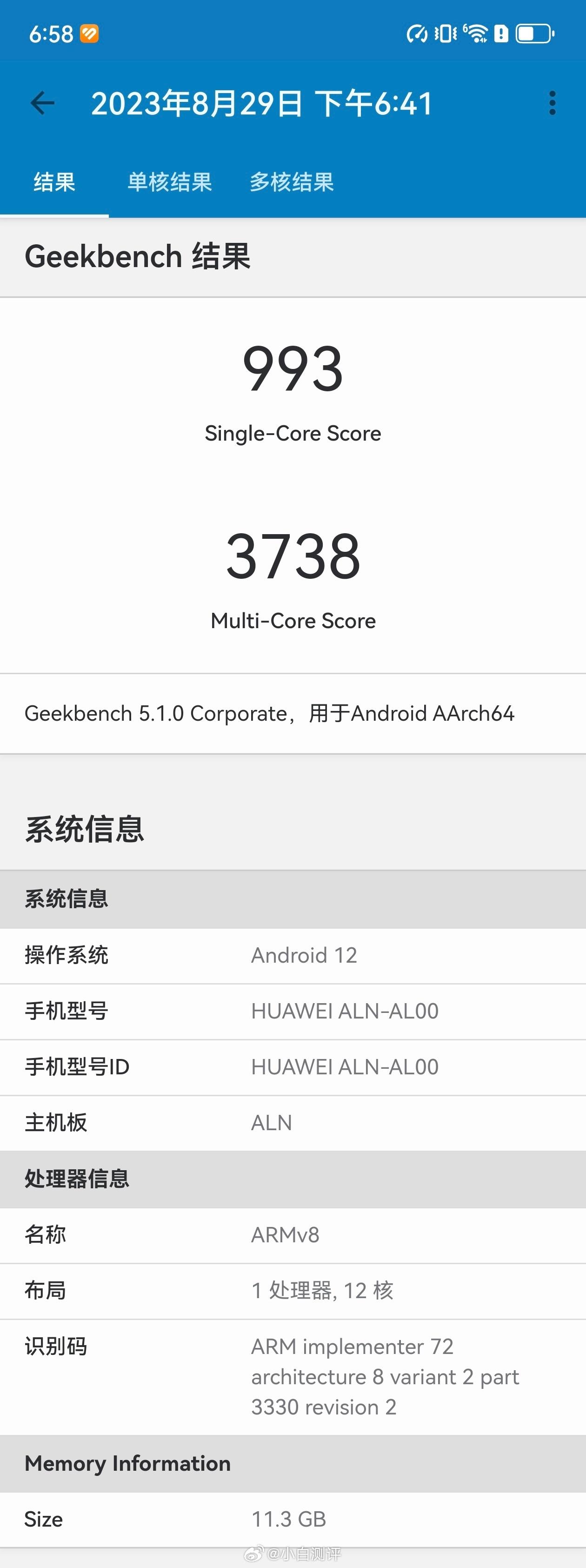 来给华为Mate 60 Pro跑个分 处理器识别显示麒麟9000s Geekbench5单核跑分993,多核3738。