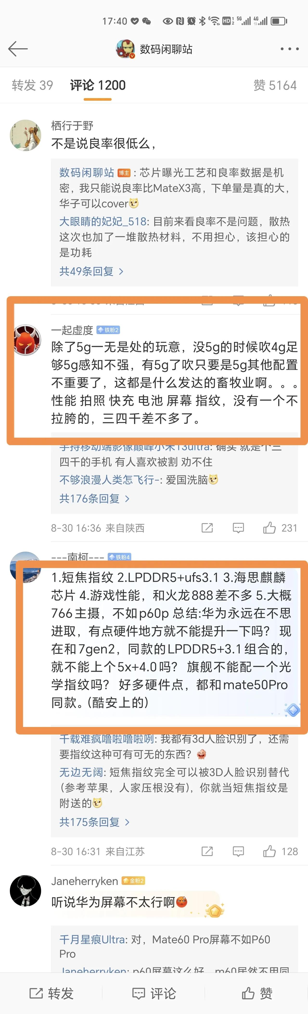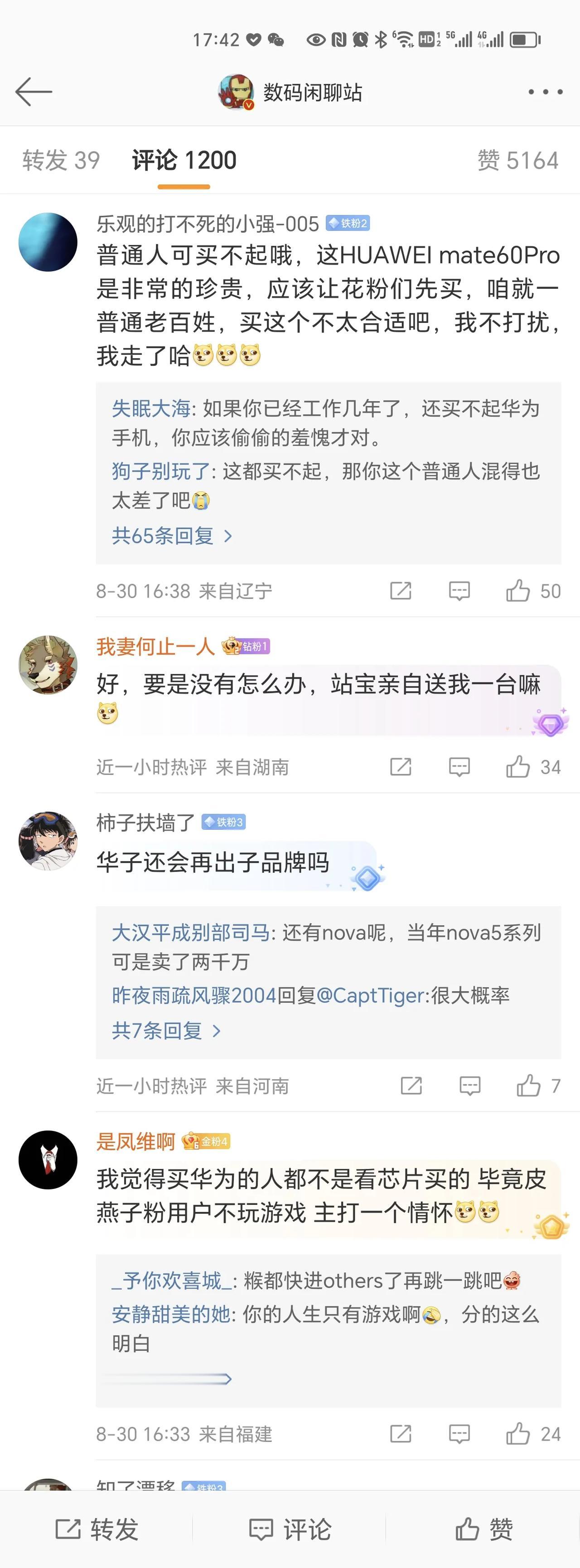 开始了,数码闲聊站下面关于华为Mate60 Pro的评论,“除了5G一无是处”,“三四千差不多了”,“华为永远在不思进取”。[尬笑] 就连华为都成为“不思进取”的企业了,可怕。还有骂5G的,当初说“4G手机卖9000”应该也是这一类人吧。 无所谓,华为给足压力,其他厂商想要有销量,机器也只会越来越香。