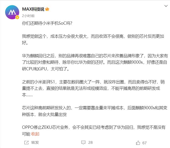 小米也有自研SOC和自研系统,明年落地。、 华为麒麟回归这个节点上,小米也曝光了自研的动作,而且成果看起来不小,有手机处理器,有MIOS,也会用在汽车上。 个人看法,难度非常大,但这也是小米不得不走的一条路。 难的地方在于,华为年投入研发1600亿,还在持续上涨,其他厂商呢?研发没有性价比,四舍五入,华为一年投入研发就领先友商10年了,多年积累下来差距只会越来越大。