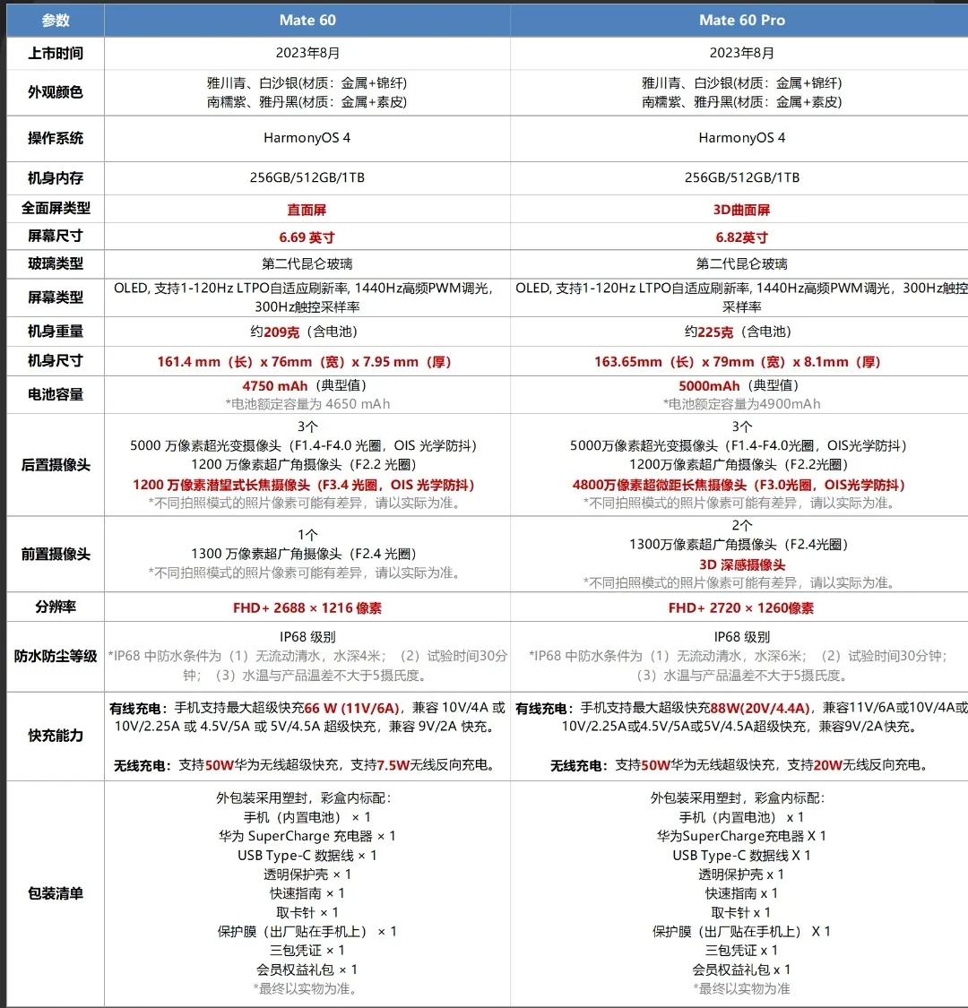 华为Mate60标准版和Pro版的区别,个人比较建议入手标准版[吃瓜群众]处理器一样是麒麟芯,影像上的区别就一个是潜望式长焦,一个是长焦微距,标准版还是单挖孔直屏,重量也低些,手感肯定更好,其他也有IP68、50W无线充电、第二代昆仑玻璃、可变光圈技术等。 华为Mate60 12+256GB 5499元,比Pro便宜1000块,个人觉得更香。
