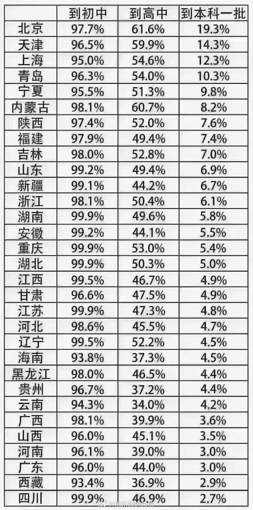 哪年的数据?别拿复读生凑数,拿18年前的出生人数当分母,本科率一本率北京都低于某高考大省。该省18年前出生110多万,18年后高考人数130多万😂把分母降到40万重新算一次。