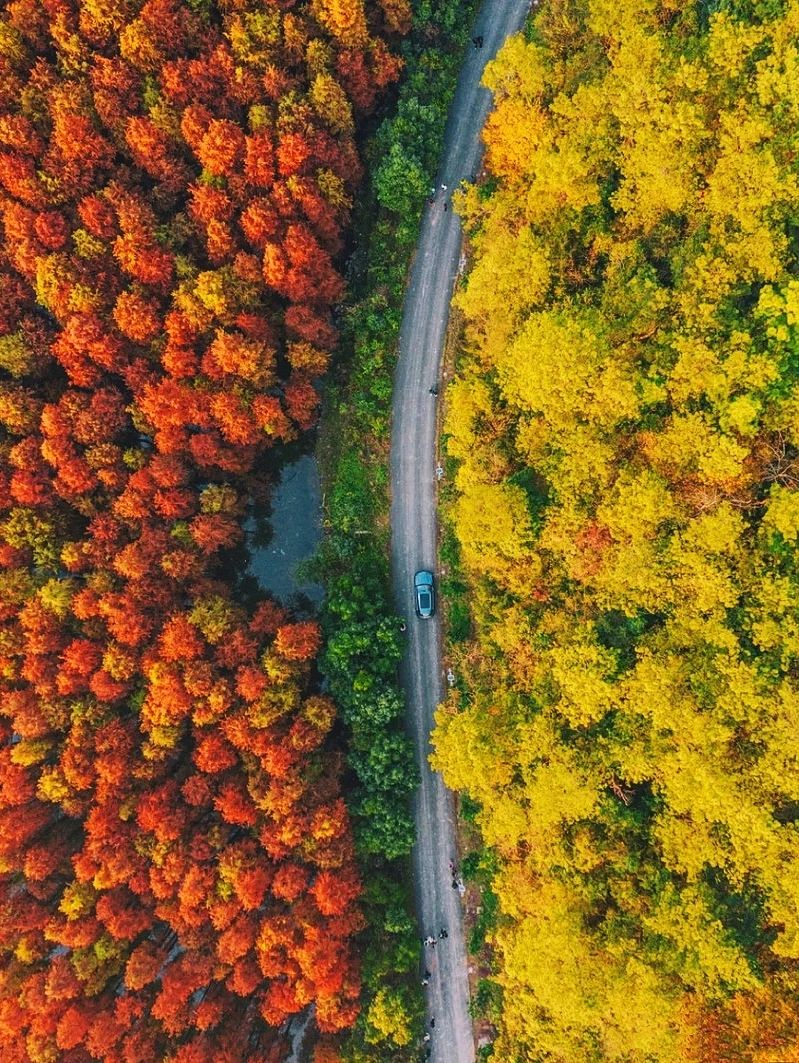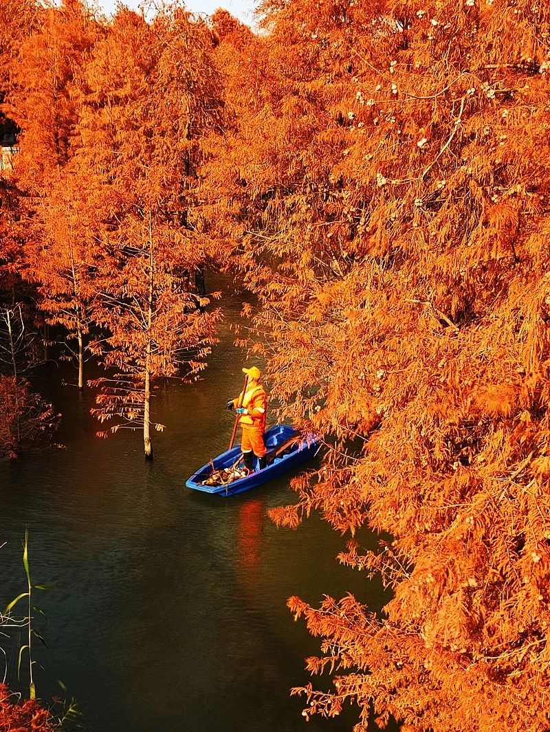 下午湖面像闪钻一样波光粼粼,再环顾一下四周围,被成片的橘红色水杉围绕着,感叹!这怕是仙境吧✨