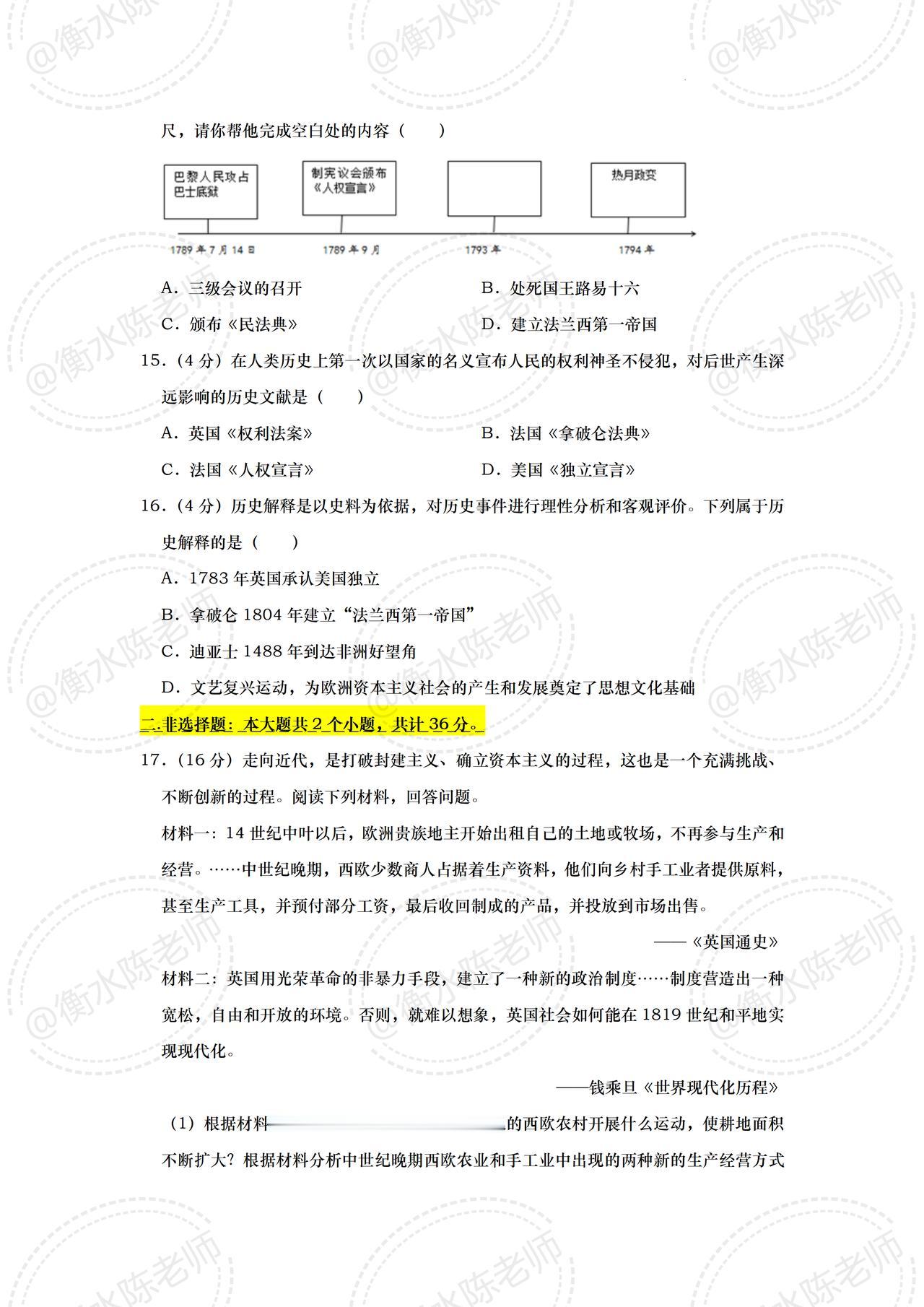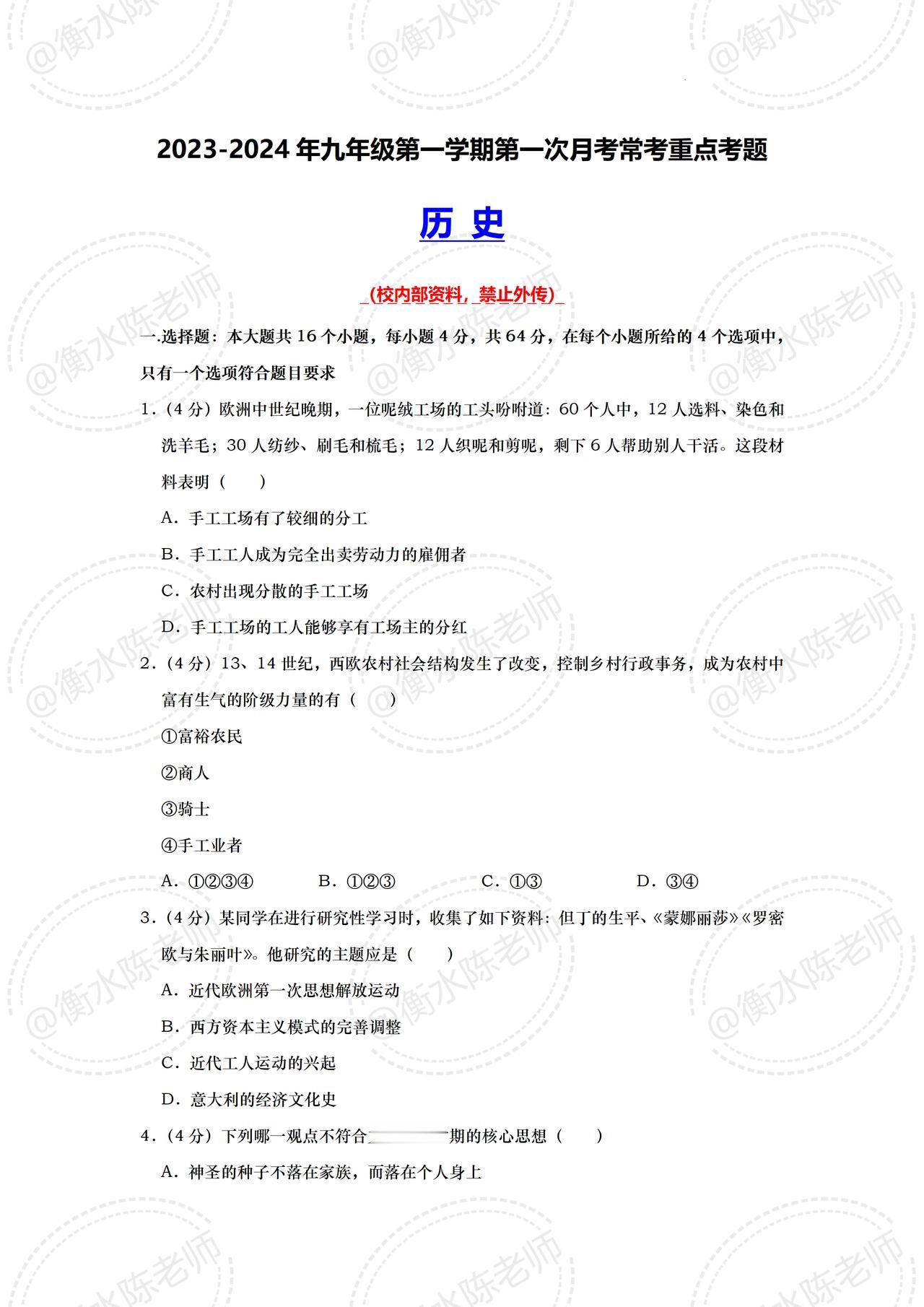 九年级开学已经很久了,暑假里各个科目都预习了,学习效率高一些的,上学期的内容已经过一遍了,毕竟九年级的学生面临中考升学考试,效率上还是要提高一些的,年前很多省份要进行一模考试,同学们一定要利用好、规划好自己的时间,提前学习,提前复习,做好复习。 今天老师把九年级上学期历史,第一次月考重点考题发给大家,根据各个城市、学校编写的试卷,临考前,大家认真做一遍哦。