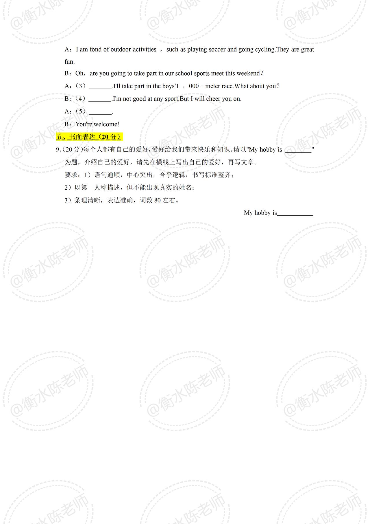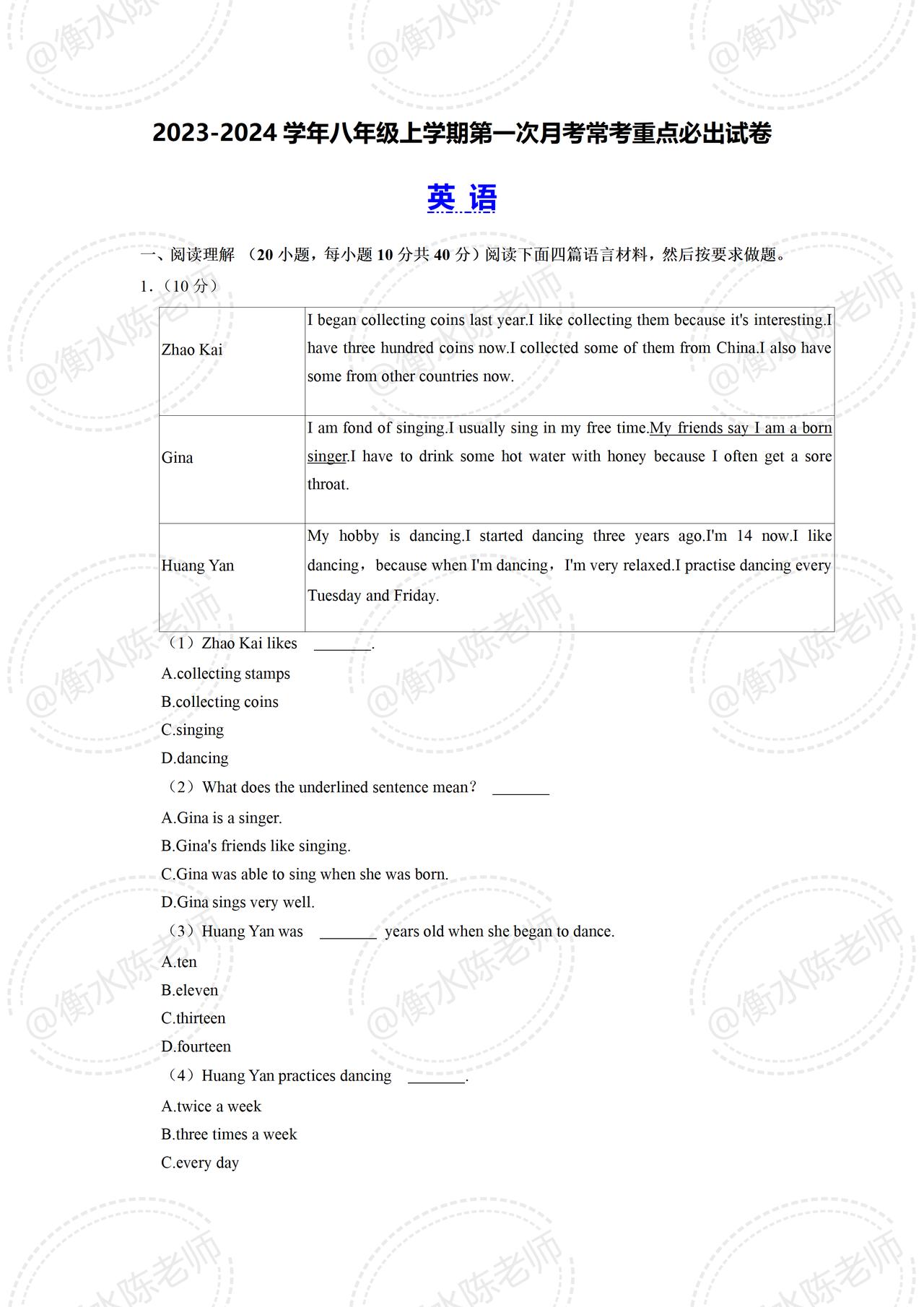 八年级上学期英语,第一次月考常考重点考题,都是平时考试中常考的题型,想要获得好成绩,考前做一遍自己城市的月考试卷,我们的月考试卷根据不同的城市本版编写的,全新热点必出考题,英语成绩比较弱的,考试之前一定要做一下哦,成绩会给你惊喜哦。