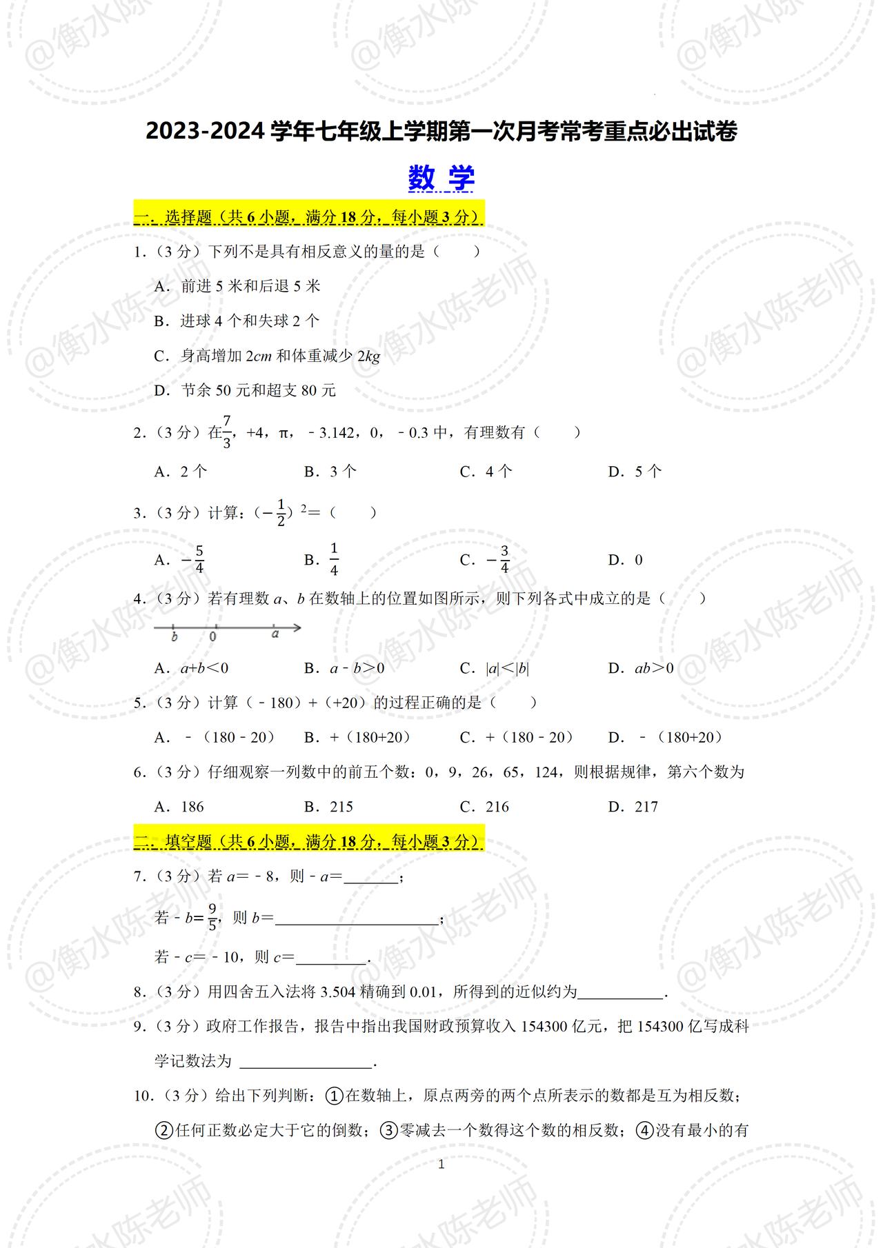 七年级上学期数学,第一次月考必出重点考题公布,根据不同城市和版本编写的全新考题,暑假2个多月的时间,把全国13个版本的月考卷,全部编写好了,都是平时考试中经常出错的热点考题,想要获取自己城市月考卷的,记得跟我沟通哦。