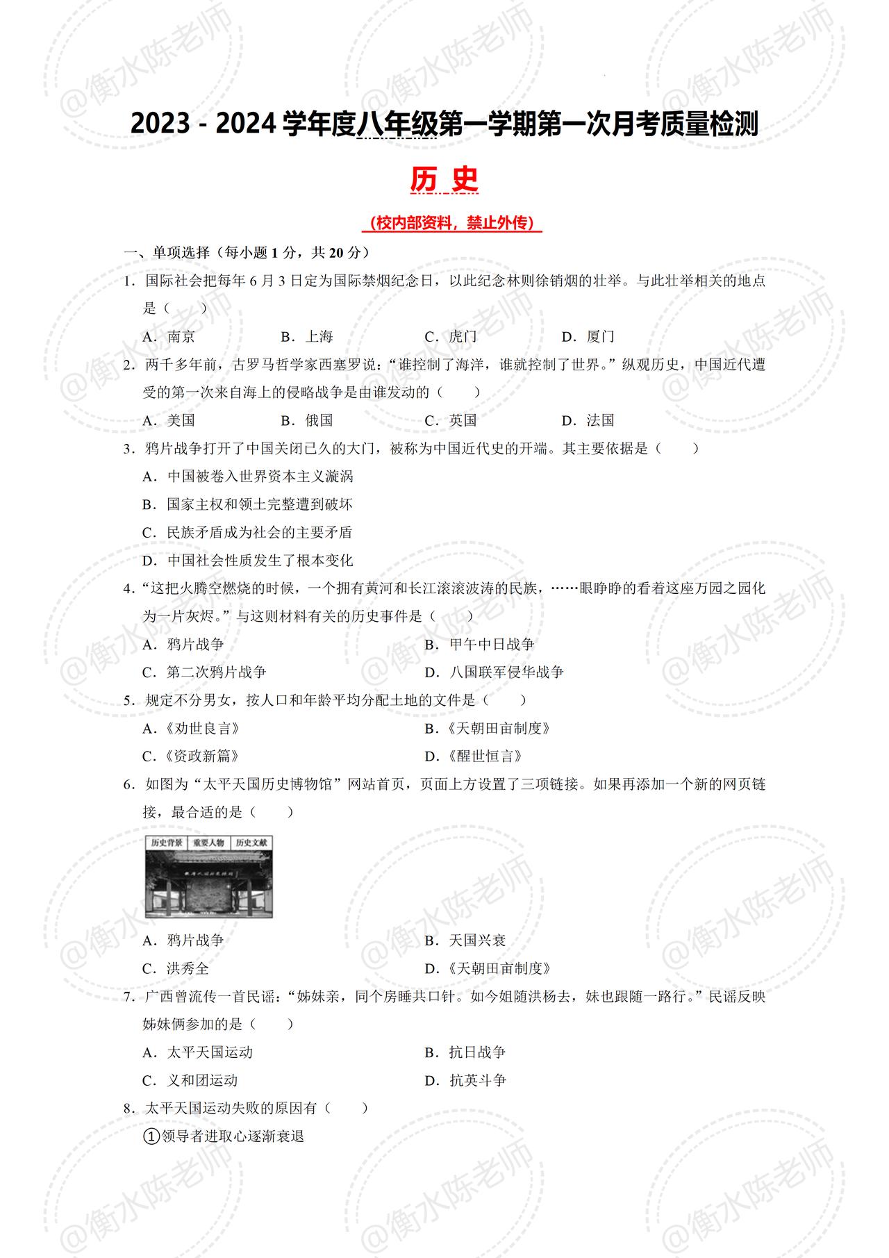 八年级上学期历史,第一次月考常考重点必出卷,历史成绩比较差,想要考出好成绩的同学,提前做一遍这套重点考卷,全是这学期回回必出的考题,月考卷根据不同的城市、版本编写的,想要获取自己城市月考卷的,记得跟我沟通哦。