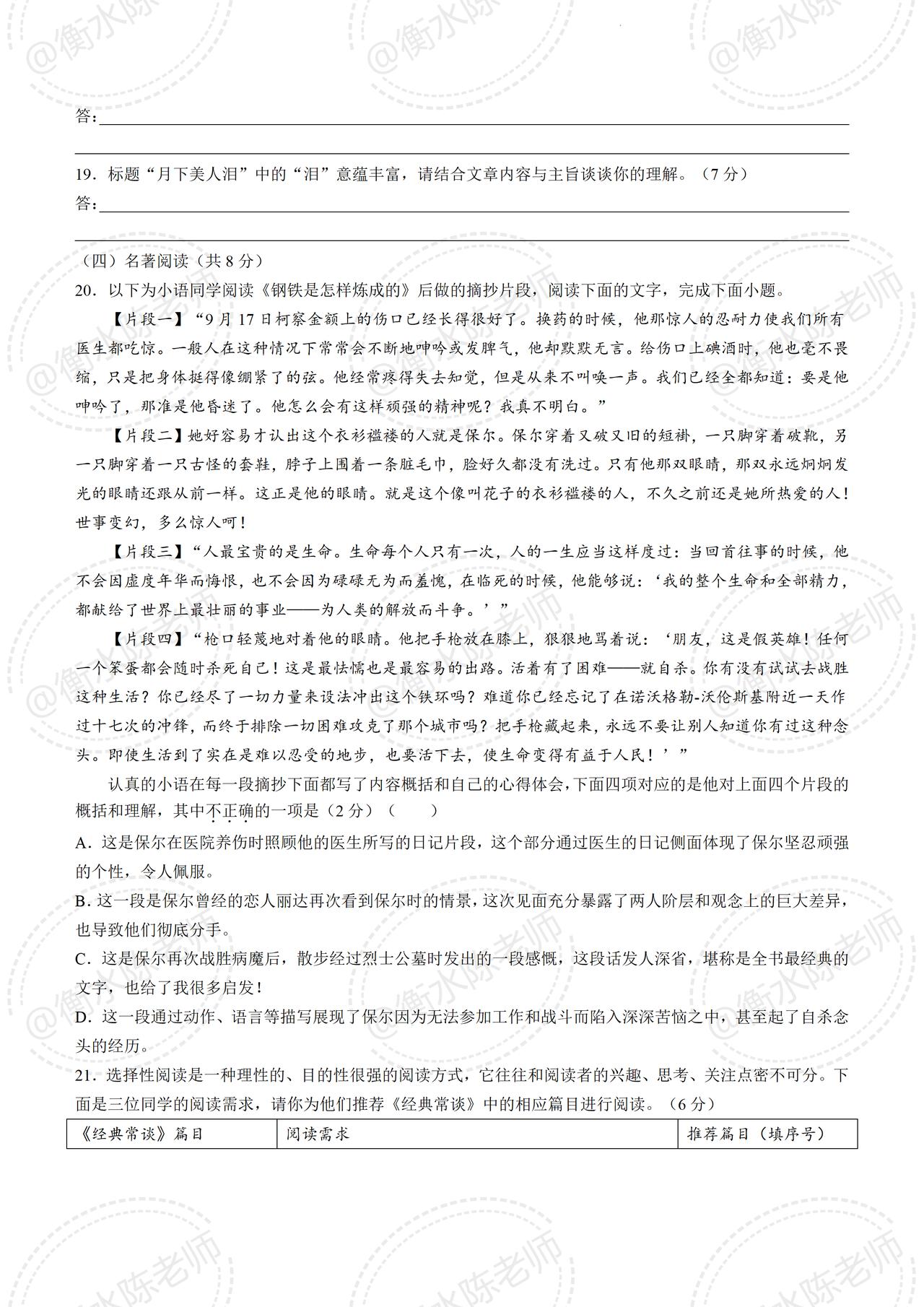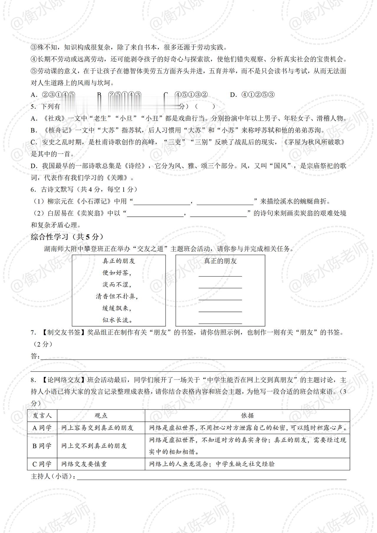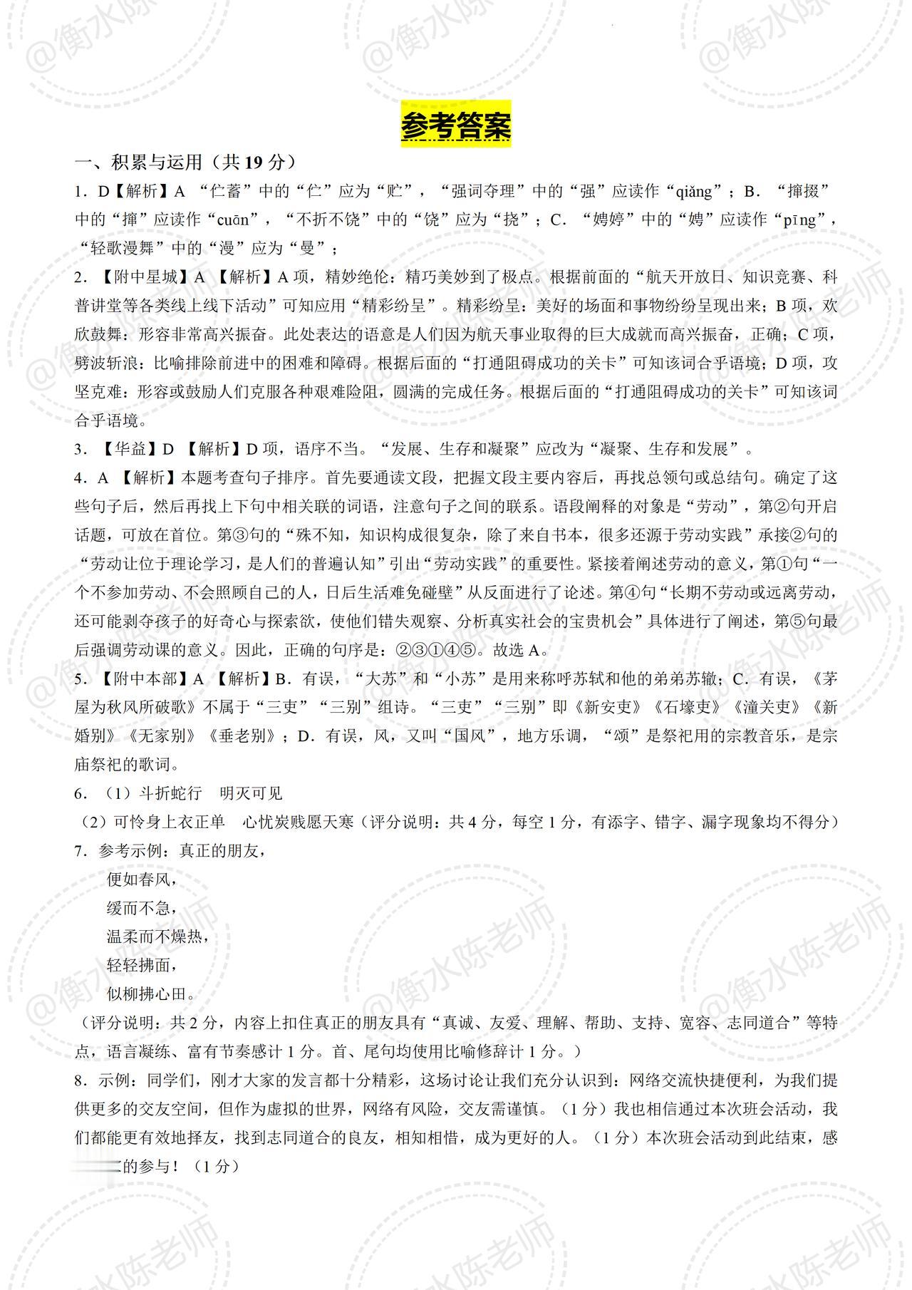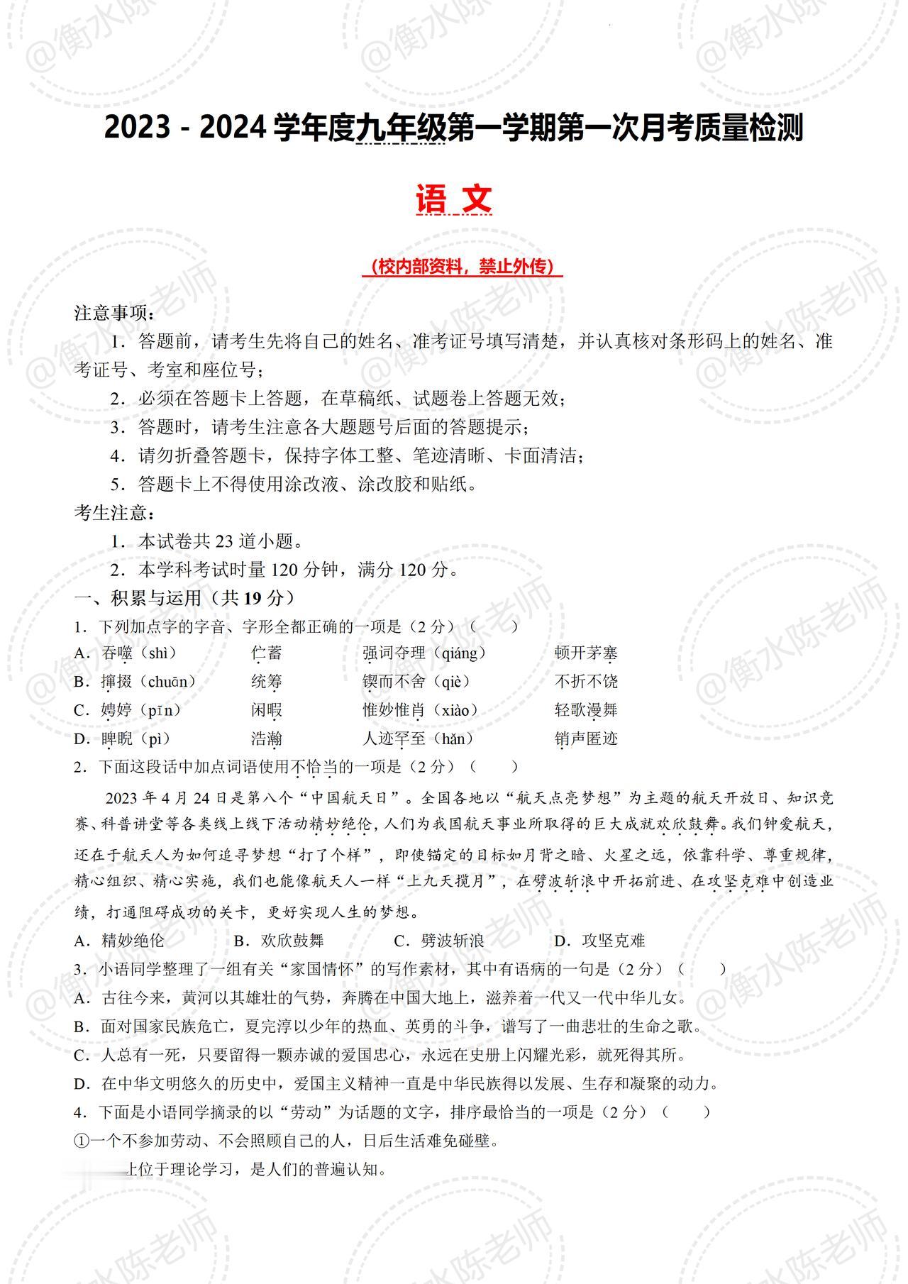 九年级上学期语文,第一次月考必出重点考卷,5校重点班联考卷,全是课内外常考题型,考前做一遍这套考题,语文成绩再差,让你多考30+以上哦。