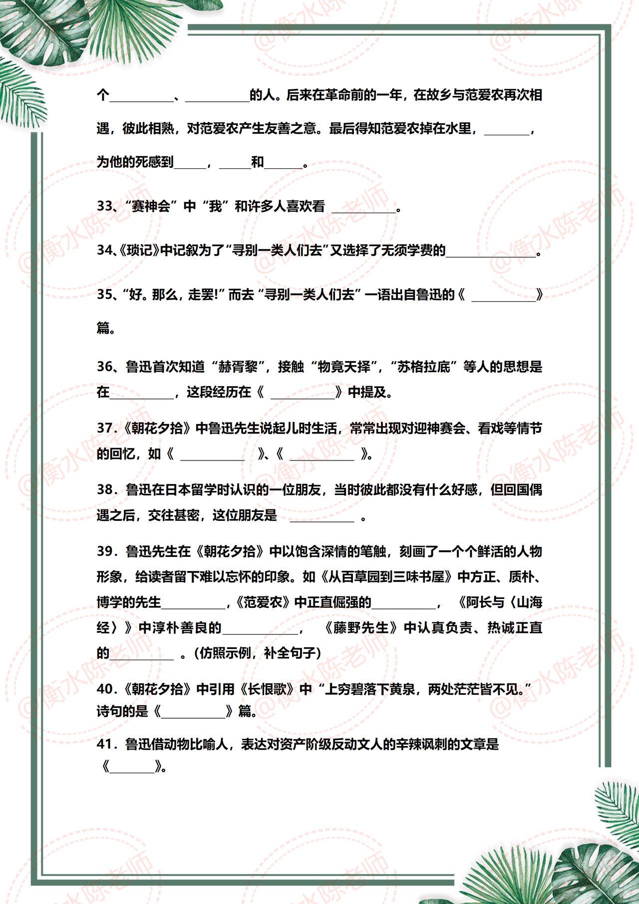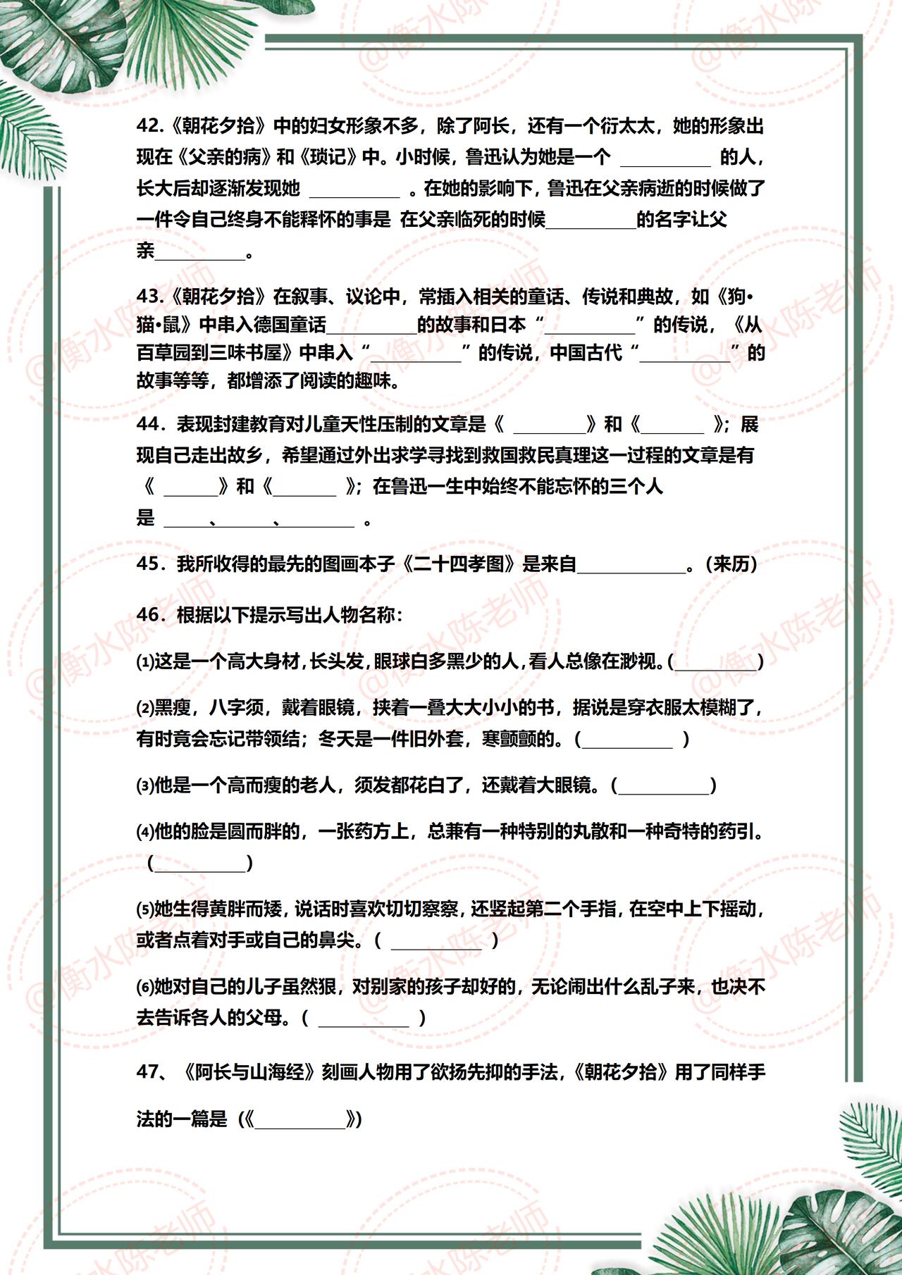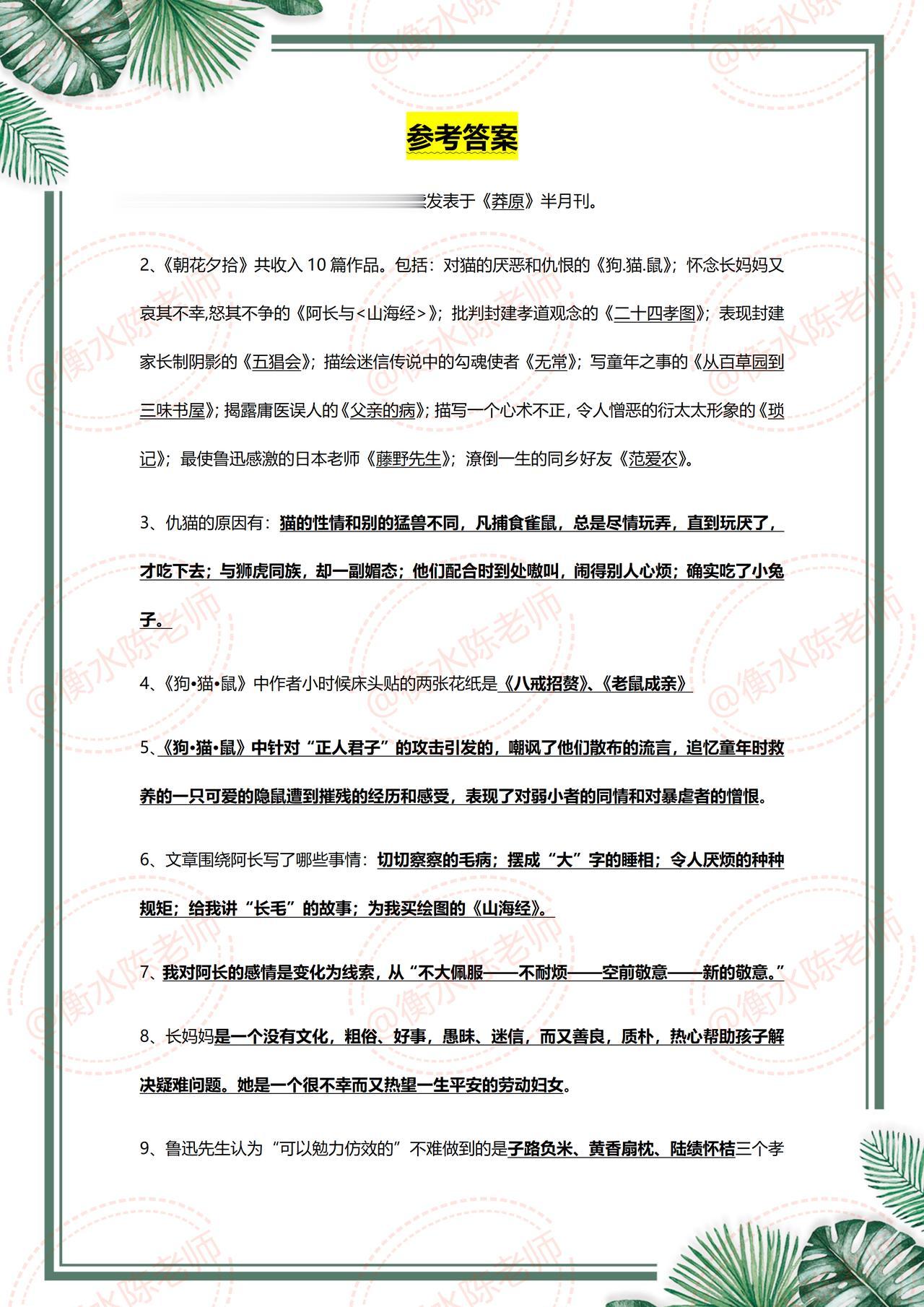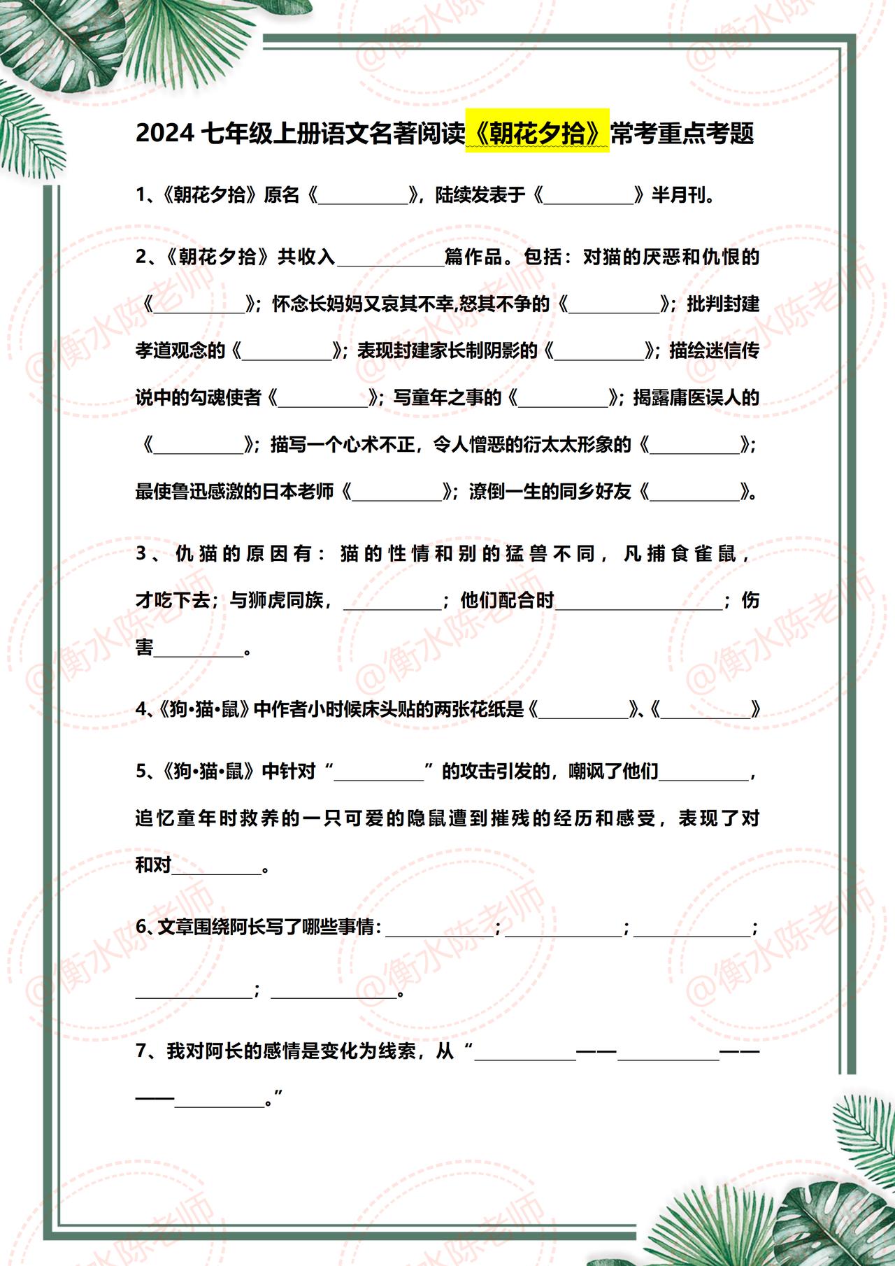 初一语文名著阅读《朝花夕拾》必考知识点,同学们提前做一遍,老师利用暑假2个多月的时间,终于把必出必考的考点、考题全部编写好了,吃透这33页纸,考试中让你不扣1分哦。