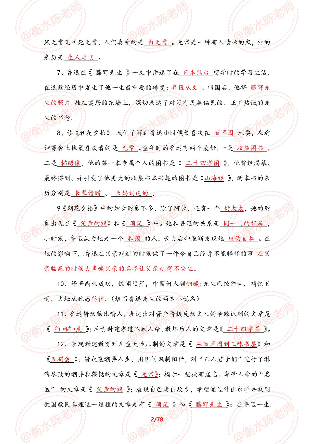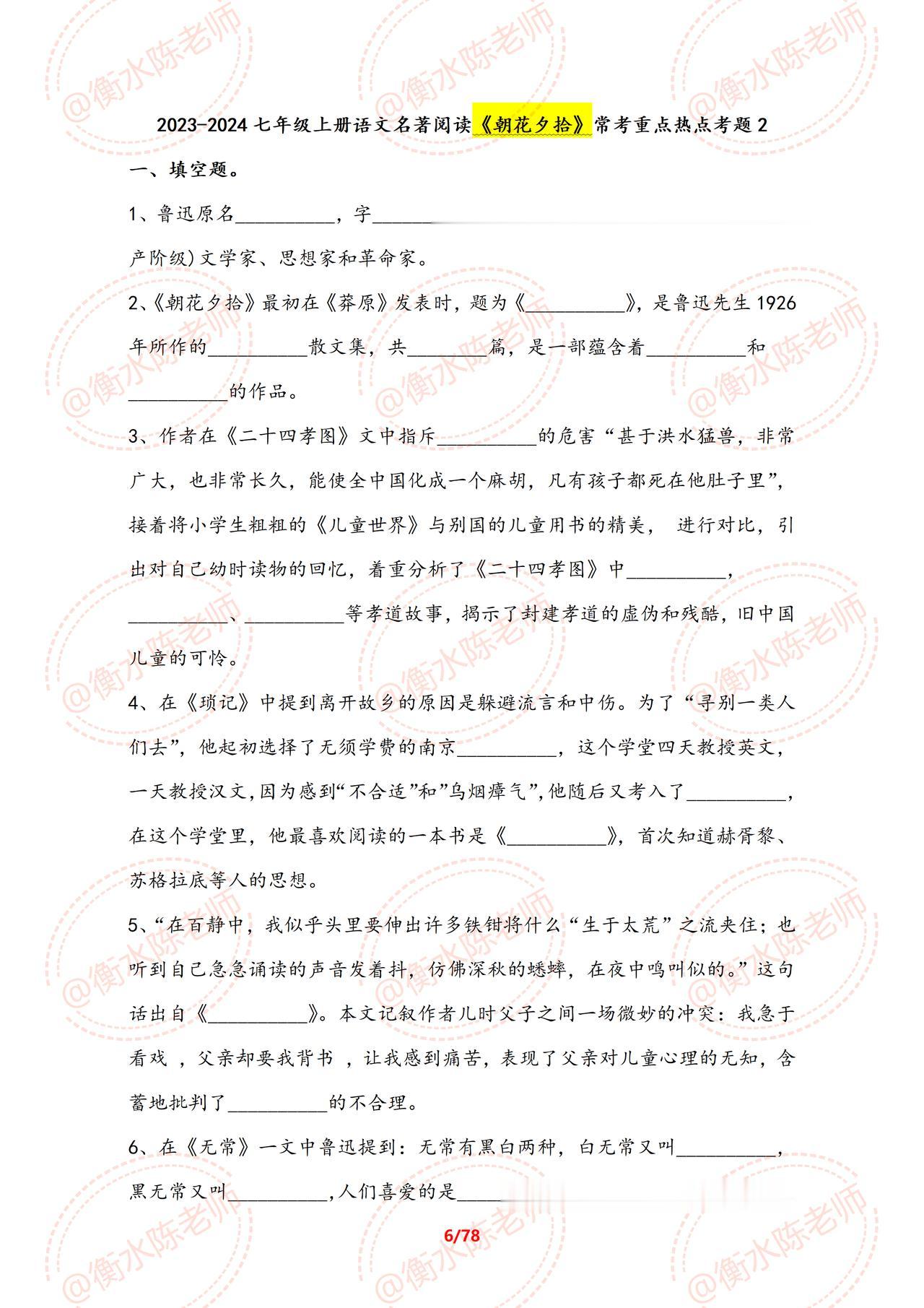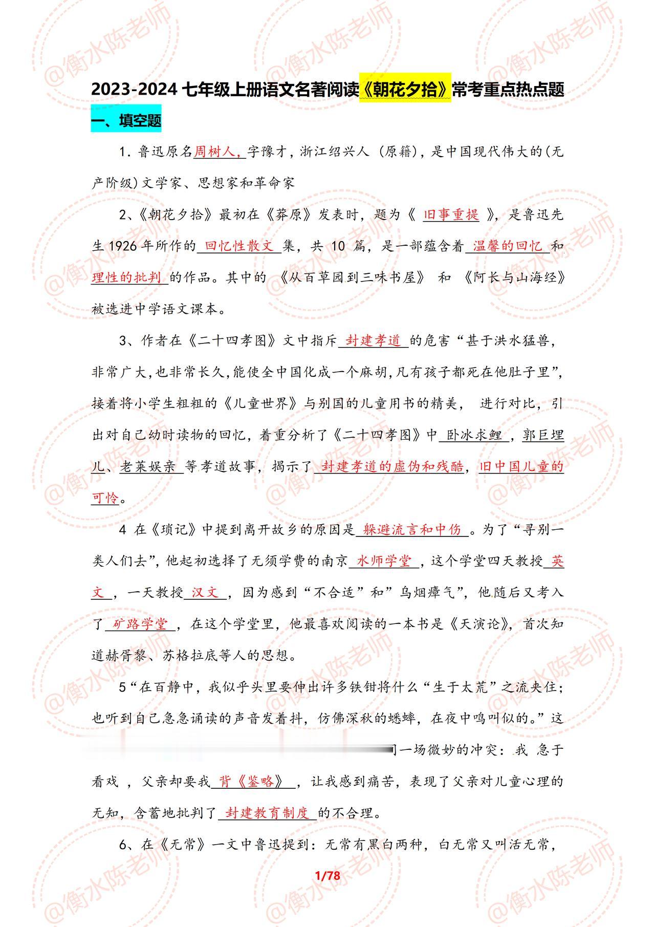 七年级上学期语文名著阅读《朝花夕拾》,耗费暑假2个多月的时间,终于把必考的知识点、重点考题全部编写好了,由于资料比较多,需要全部资料和我沟通哦。