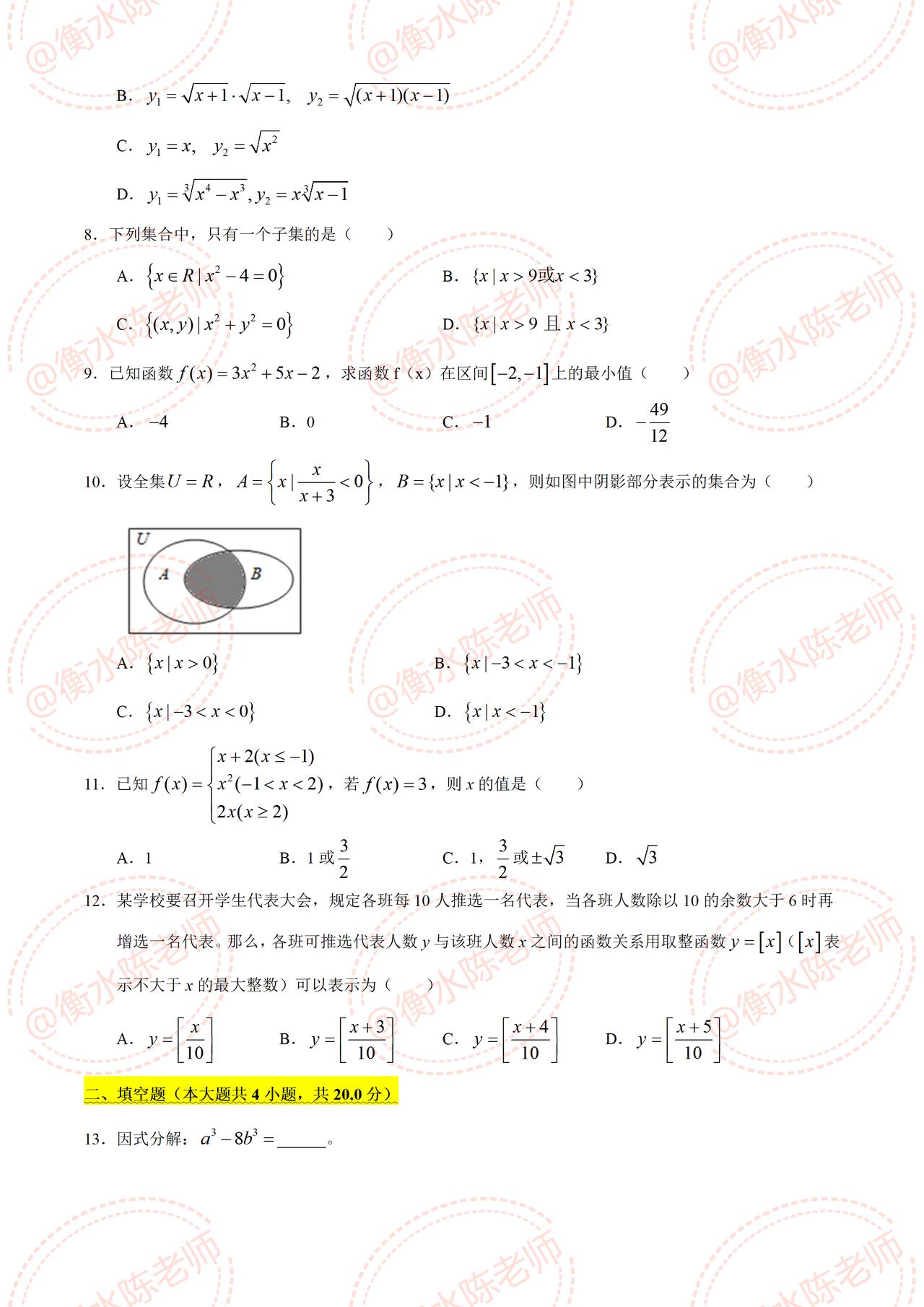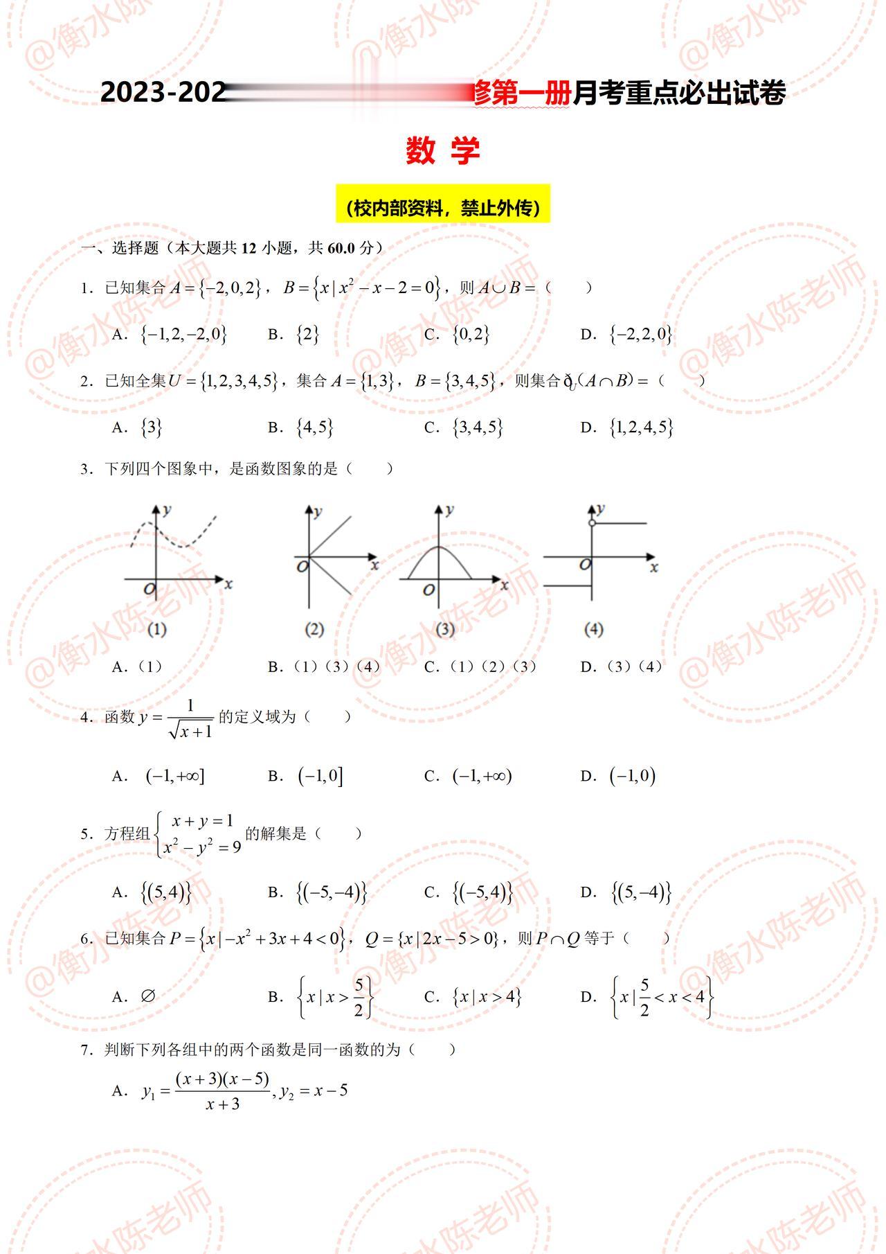 高中数学必修第一册,第一次月考试卷必出重点考题,月考试卷根据不同的省份、版本编写的,数学成绩比较差的,月考之前记得做一遍哦,都是常考热点考题,想要获取自己城市月考试卷的,记得跟我沟通哦。