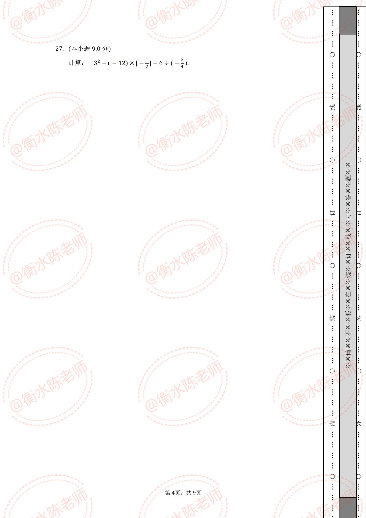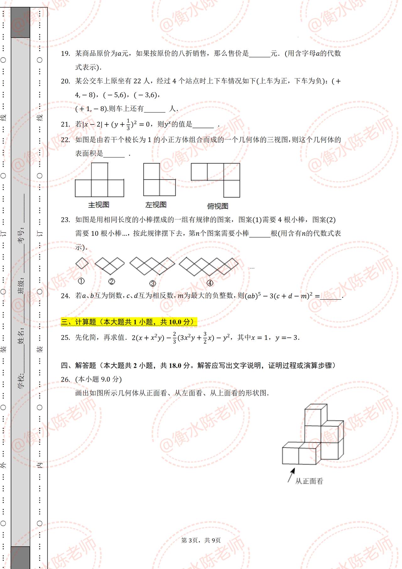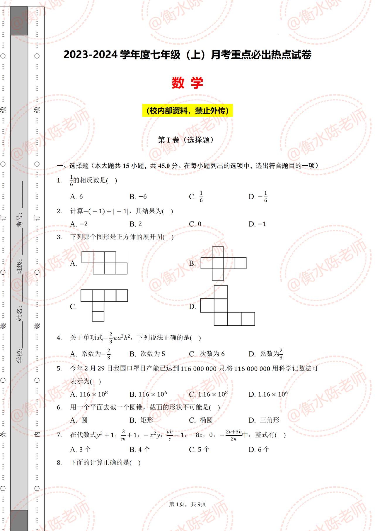 七年级上学期数学,第一次月考重点试卷,提前发给同学们,暑假开学到现在学了这么久了,究竟有没有沉下心认真学习,通过这次试卷的测试,就知道了,月考卷根据不同的城市和版本编写的,想要获取自己城市月考卷的,可以和我沟通哦。
