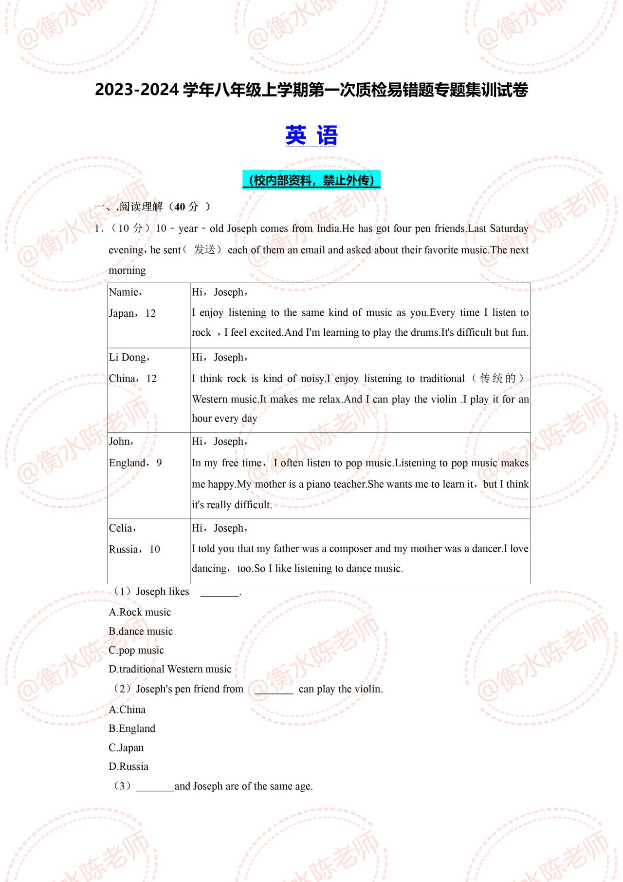 八年级上册英语,第一次月考真题卷,考题都是平时考试中,经常出现错误次数极多的考题,成绩差的,吃透这份资料,成绩给你惊喜哦,月考卷根据不同的城市和版本编写的,想要获取自己城市月考试卷的考生,和我沟通哦。