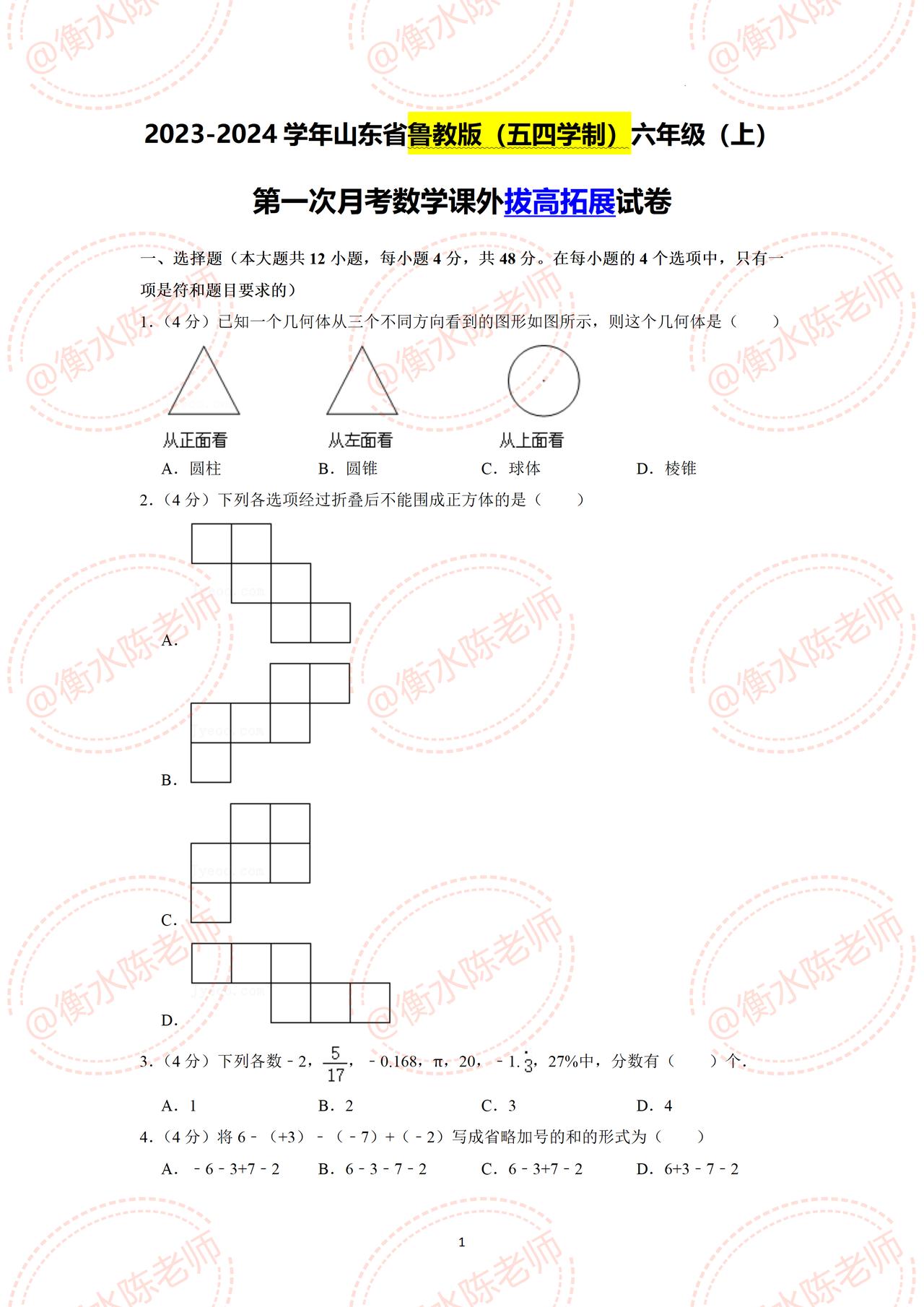 鲁教版(五四学制)六年级上册数学,第一次月考必出重点考题,6校重点班联考试卷,课内外易出错,拔高拓展全部包括,月考前,同学们认真做一遍,月考卷根据不同的城市和版本编写的,想要获取自己城市月考试卷的考生,记得跟我沟通哦。