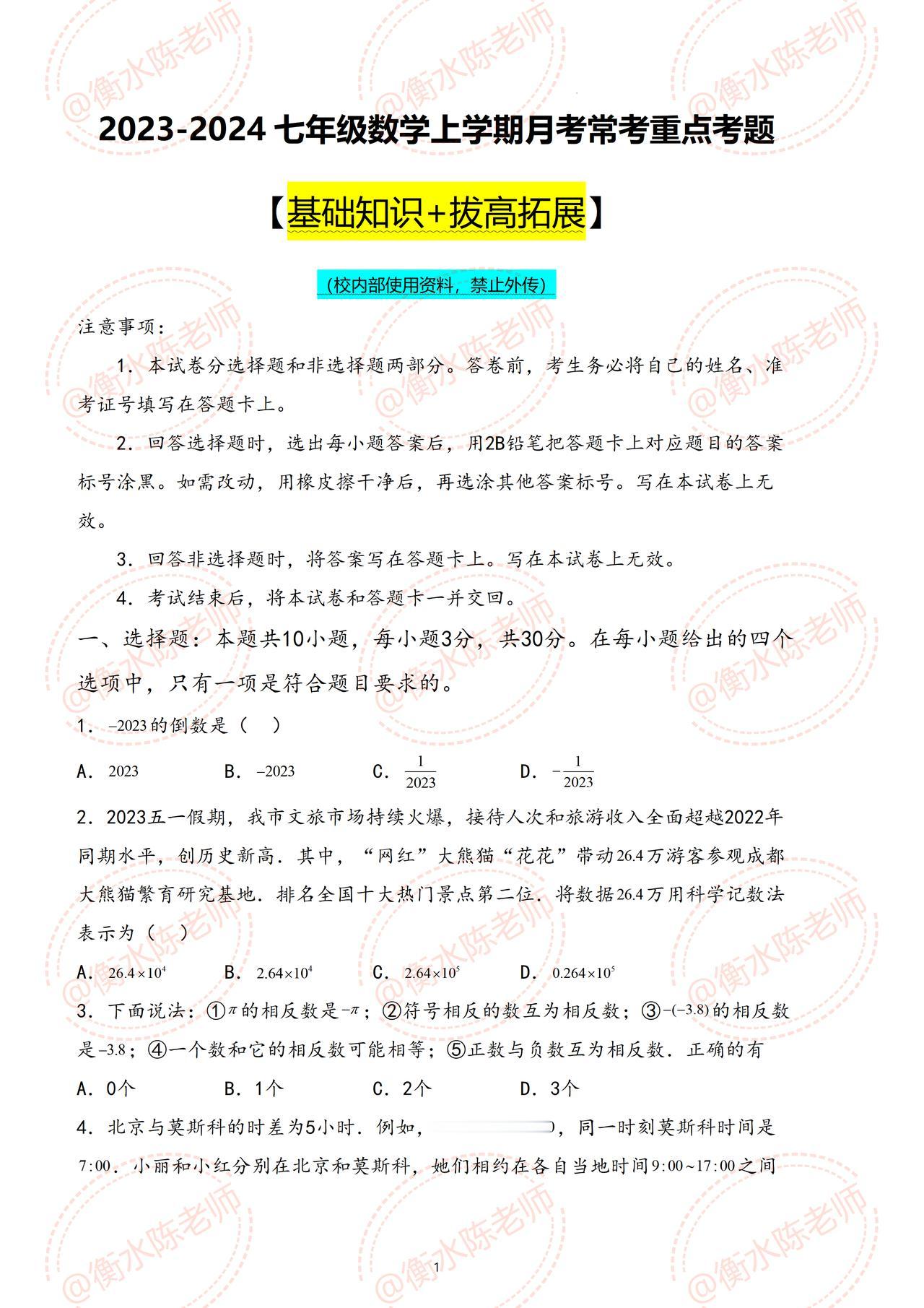七年级上册数学,根据不同的版本,城市、学校,编写的月考重点试卷,月考卷结合近3年考纲,学生做题掌握情况编写的试卷,月考之前做一遍,尤其成绩不太理想的,这些考题出现次数非常多,想要考到90以上,这套月考卷认真做完,想获取自己城市月考卷的,跟我沟通哦。