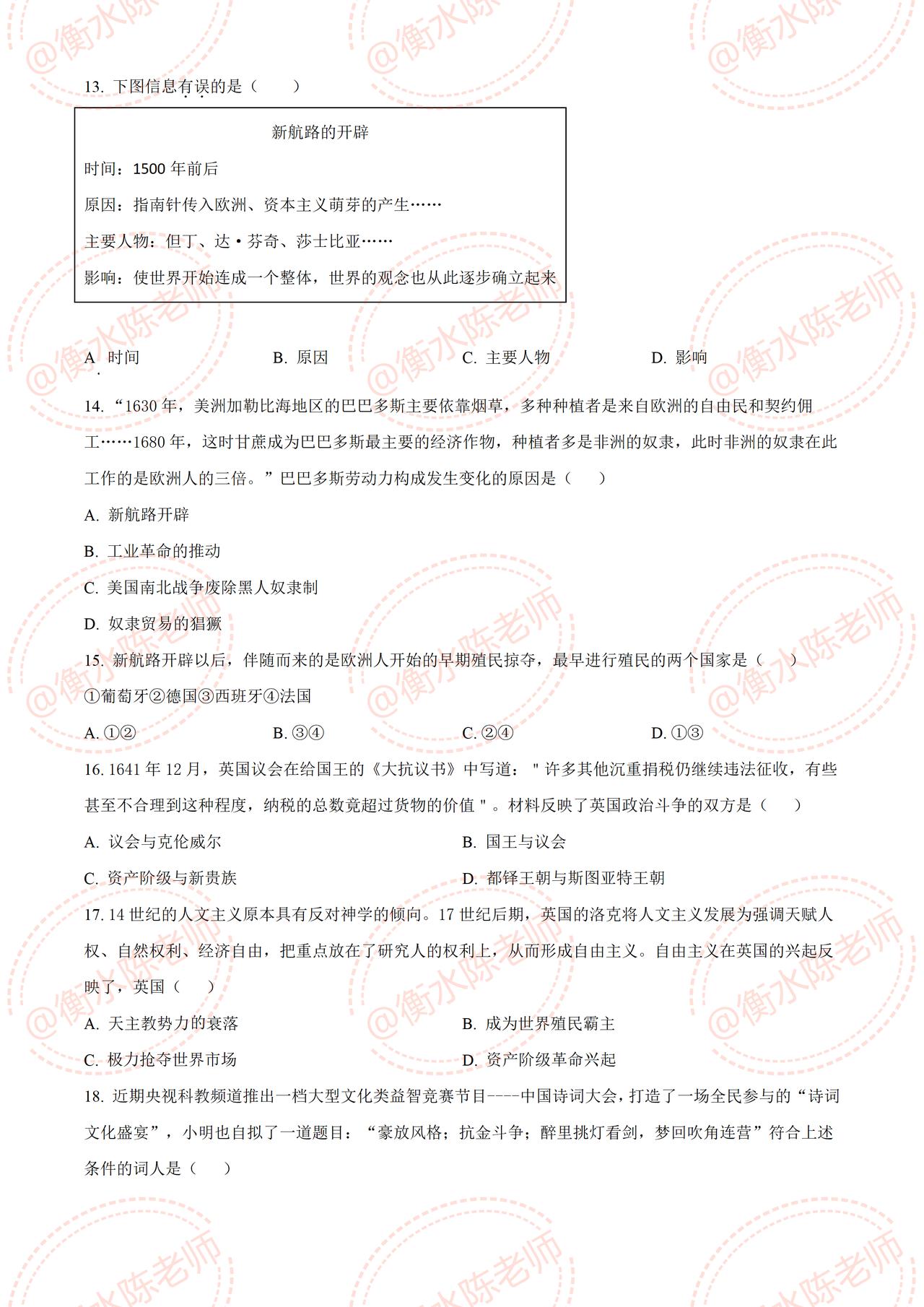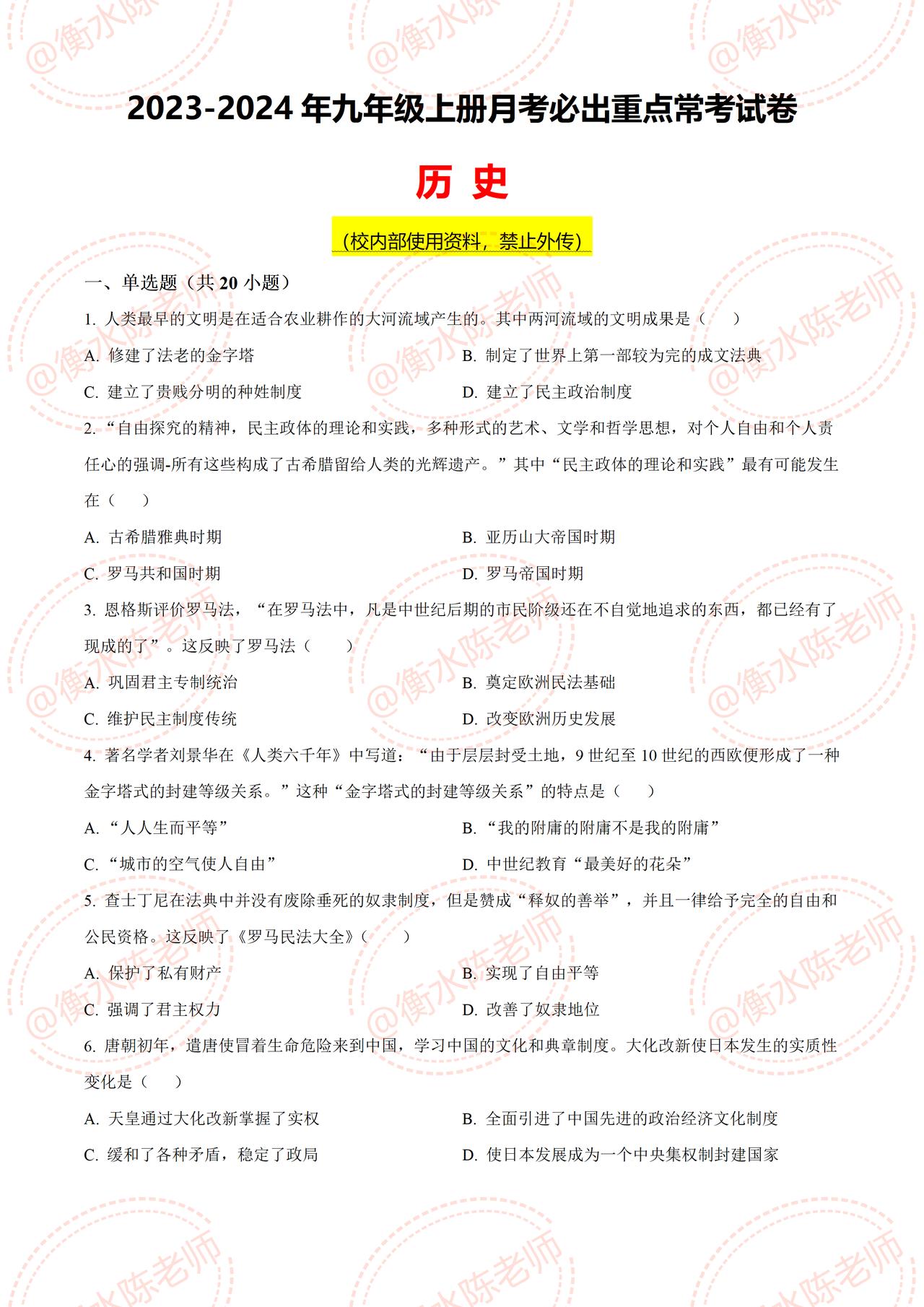 九年级上册历史,根据不同的城市、学校,考试重点编写的月考试卷,考题都是大家平时试卷中易出现的考题,成绩弱,基础差的,认真做一遍哦,让你比平时多考30以上哦,想要获取自己城市、学校月考试卷的,跟我沟通联系哦。