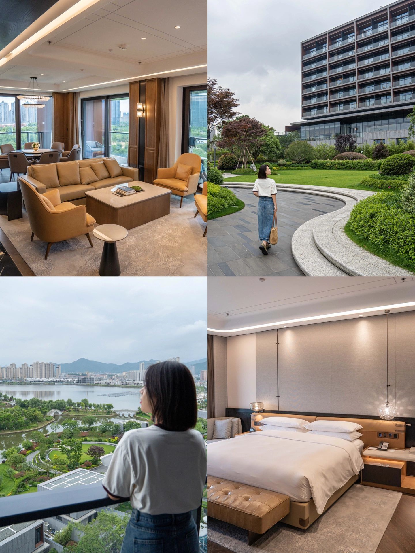1️⃣酒店入门处是精美的园林艺术,进门十几米高的挑空大堂,开阔明亮。穿过大堂便是户外区域,园林湖景映入眼帘