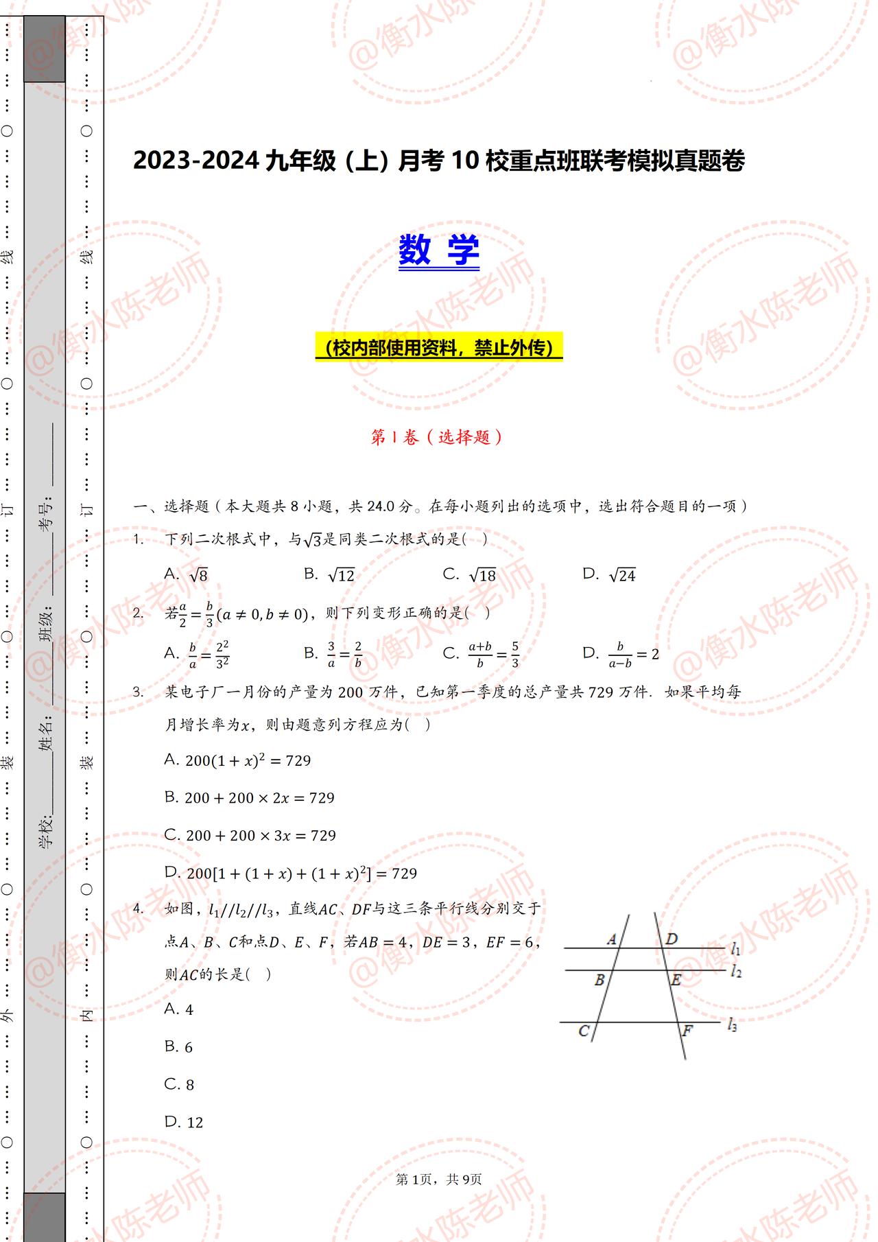 九年级上册数学,10校【尖子班】月考联考真题模拟卷,从暑假到现在学了这么久了,不知道同学们学的怎么样,课堂上有没有认真学习,课下认真预习,月考试卷,根据不同的城市和版本编写而成,初三的学生,这一年非常关键,吃苦也就这一年,咬咬牙就过去了。 初三是人生中重要的一次转折,每一个科目,都不要放弃,趁现在时间宝贵,不要轻易放弃自己,放弃等于毁了自己的将来,今天老师把数学这套月考卷发给大家, 想要考出好成绩,临考前做一遍自己城市和学校的月考试卷,想要获取的,跟我沟通即可。