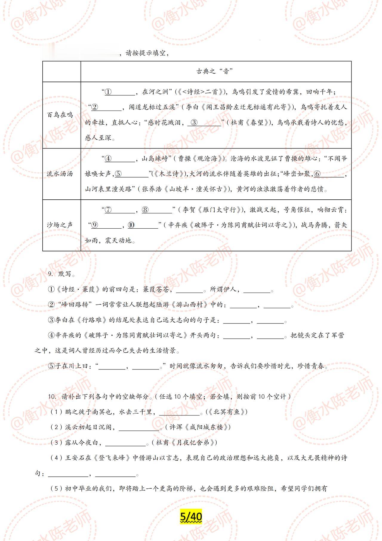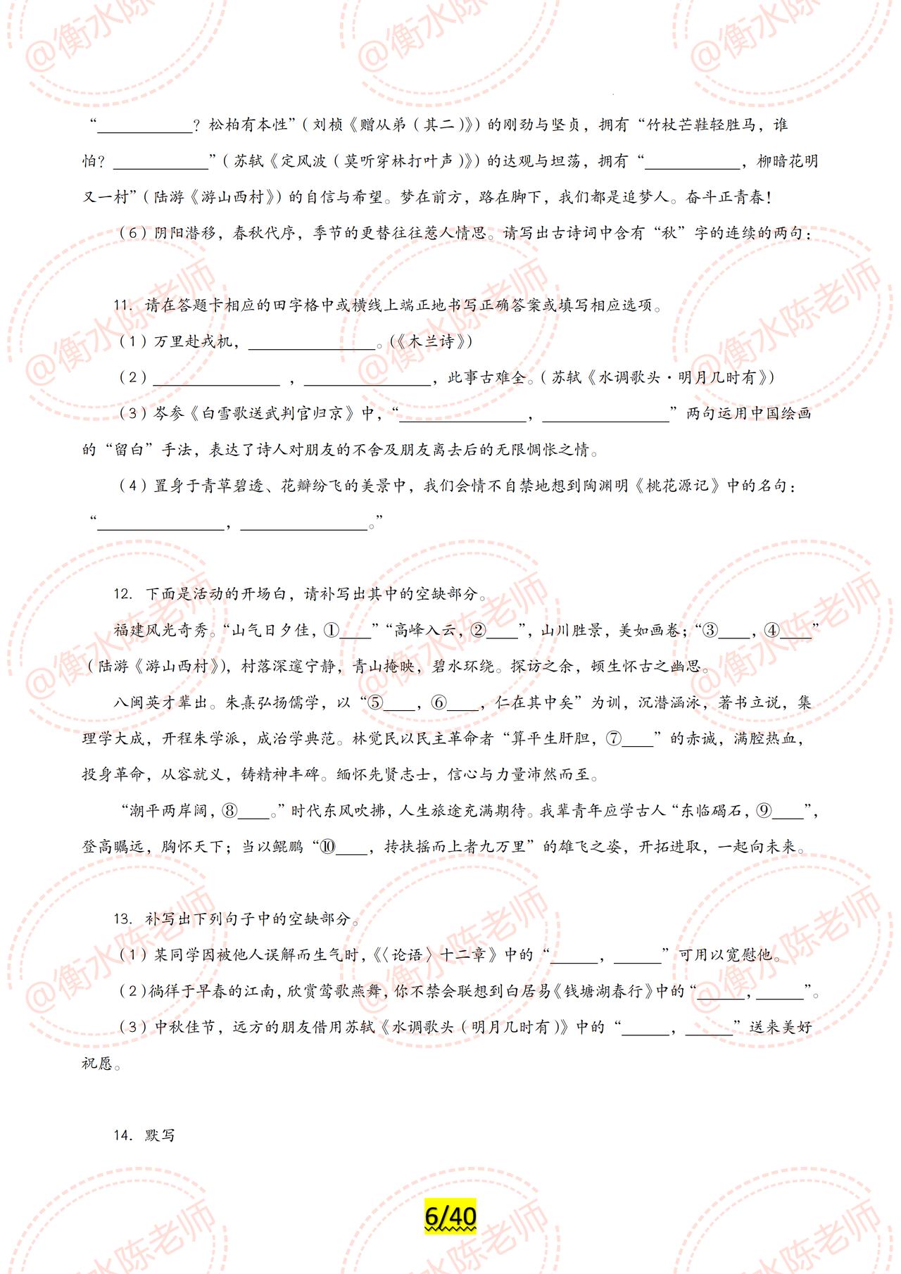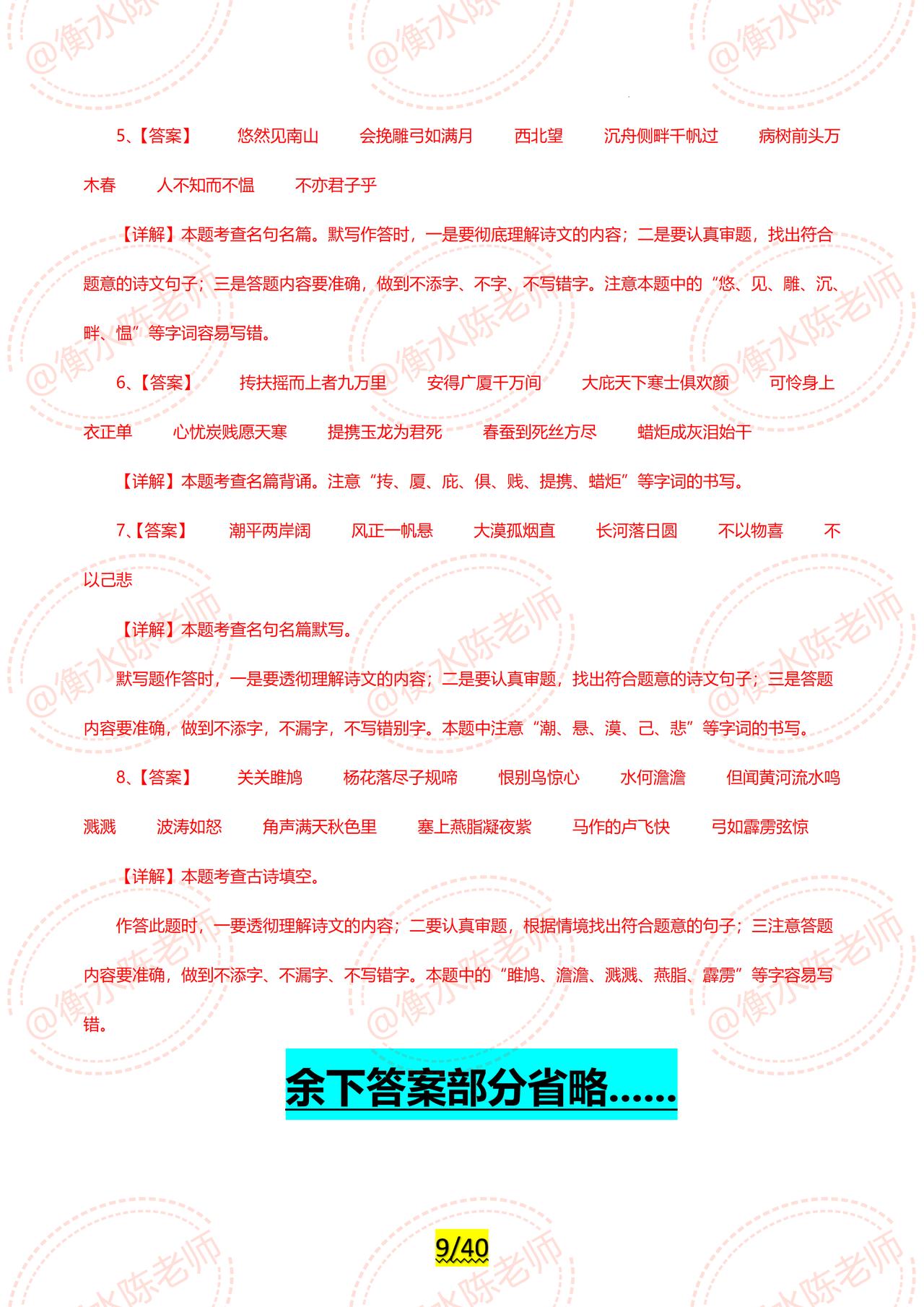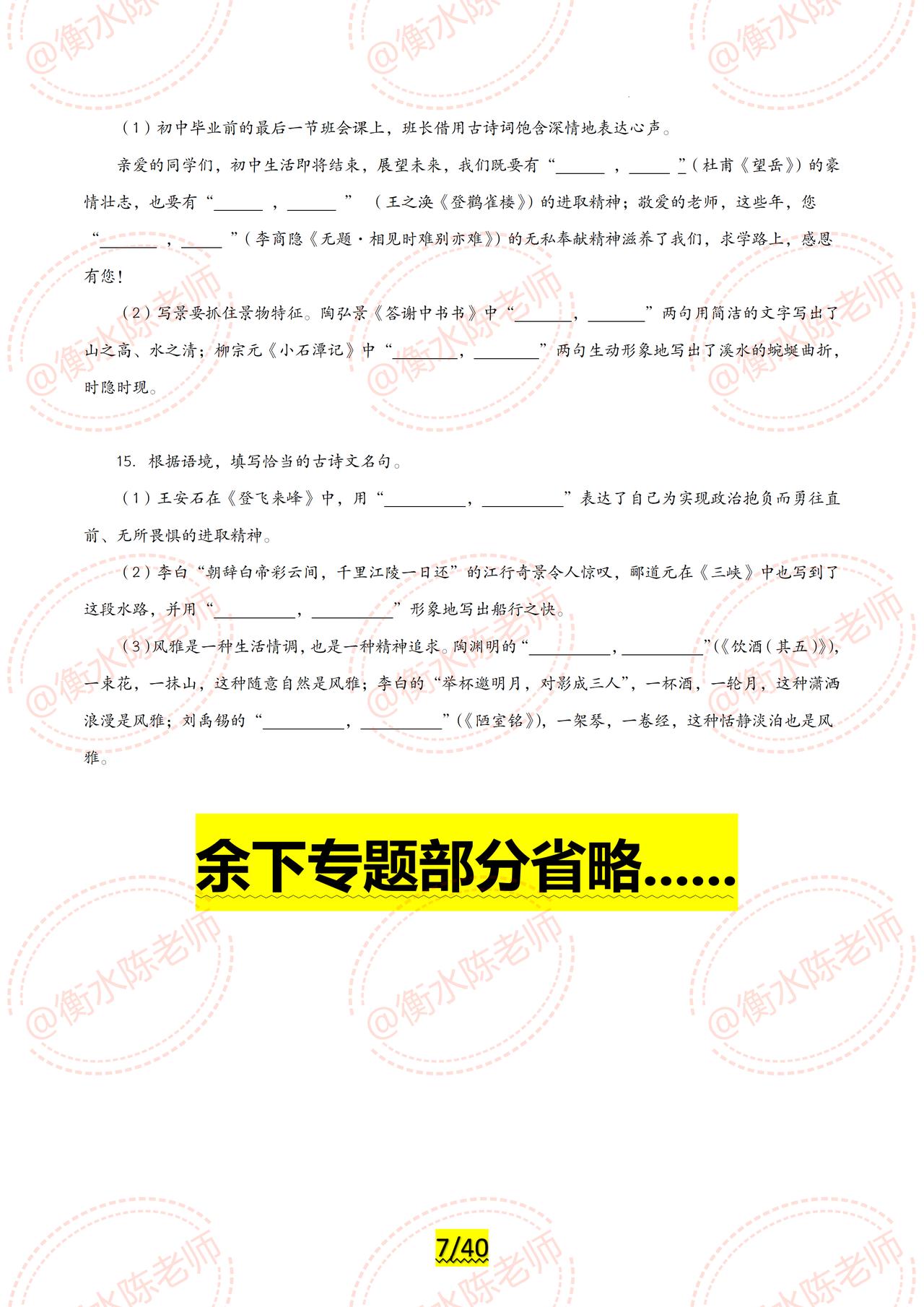 2024年中考已经可以开启倒计时了,同学们适应好了吗? 2024年中考各科目最新专题复习,已经陆续展开编写,全是2024年最新热点资料,联合全国30多个省份名师,按照不同的版本、城市,中考大纲编写而成,今天老师把中考语文【古诗文默写】,试卷中重复3次以上的常考题型发给同学们,希望考试中,不要再犯同样的错误了,由于编写的专题内容比较多,只能发布一部分给大家,需要全部的考生,记得跟我沟通哦。