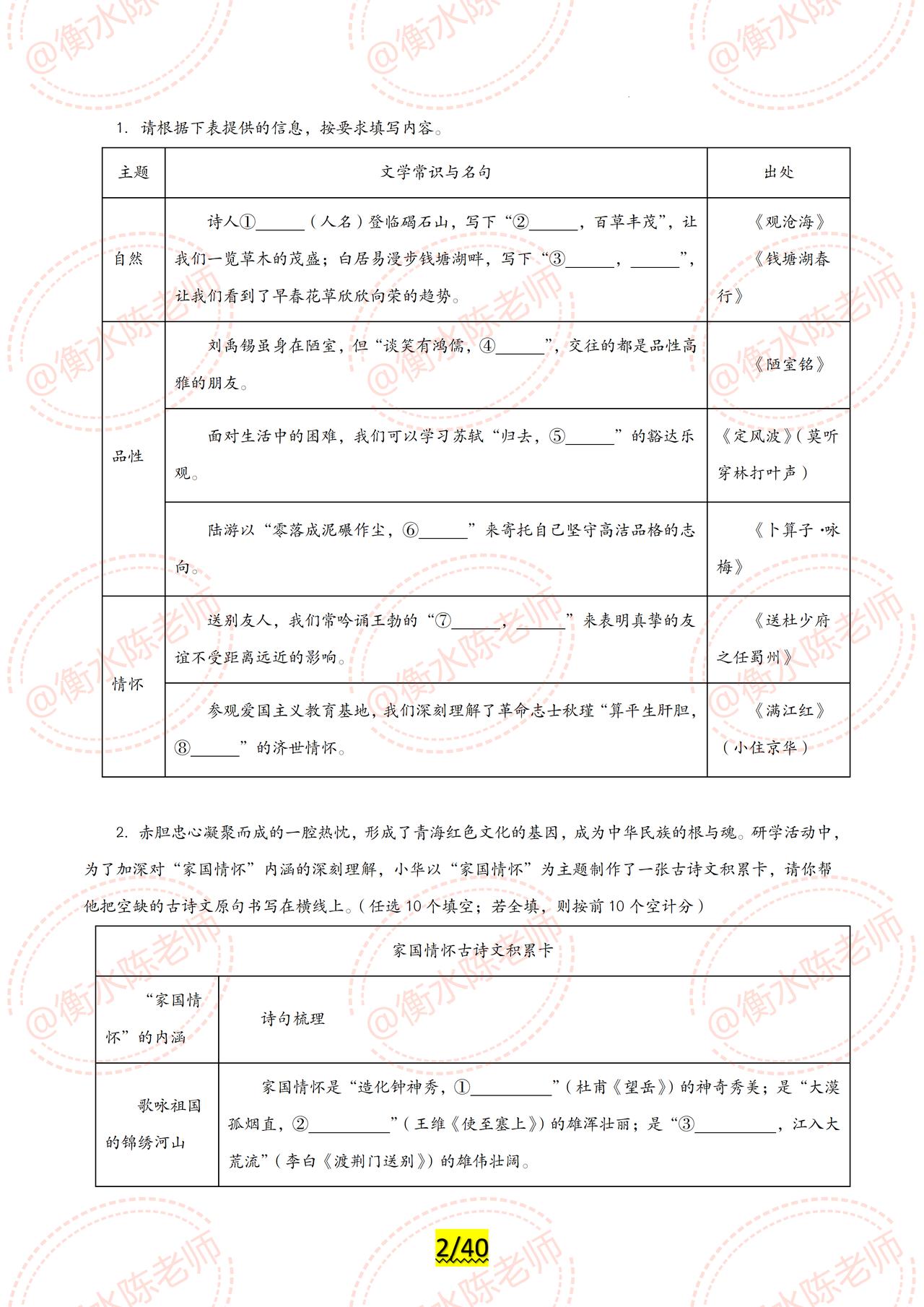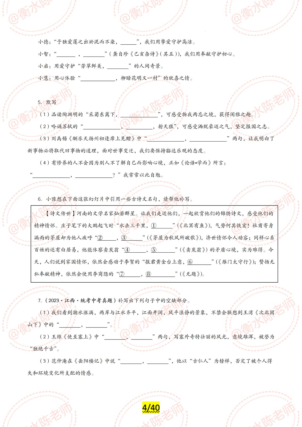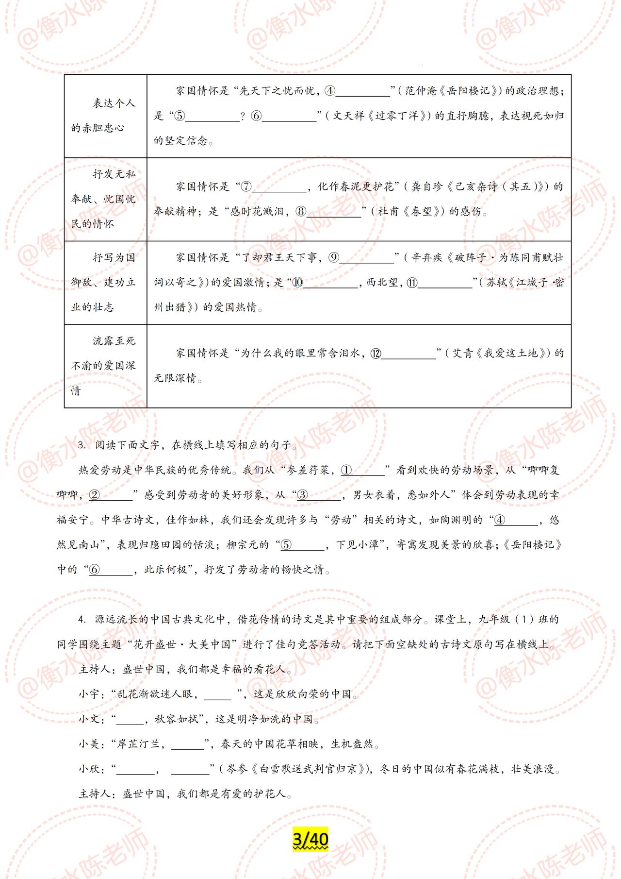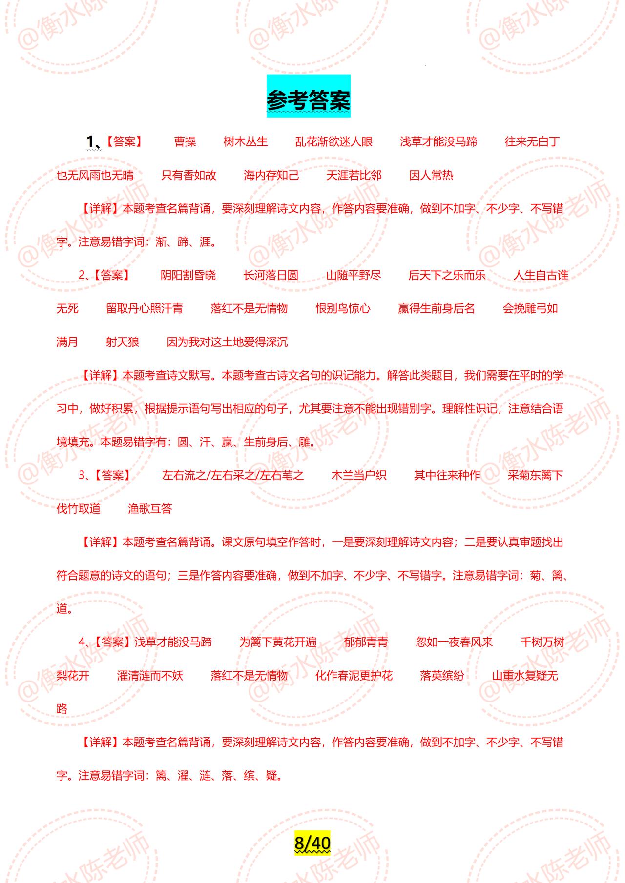 2024年中考已经可以开启倒计时了,同学们适应好了吗? 2024年中考各科目最新专题复习,已经陆续展开编写,全是2024年最新热点资料,联合全国30多个省份名师,按照不同的版本、城市,中考大纲编写而成,今天老师把中考语文【古诗文默写】,试卷中重复3次以上的常考题型发给同学们,希望考试中,不要再犯同样的错误了,由于编写的专题内容比较多,只能发布一部分给大家,需要全部的考生,记得跟我沟通哦。