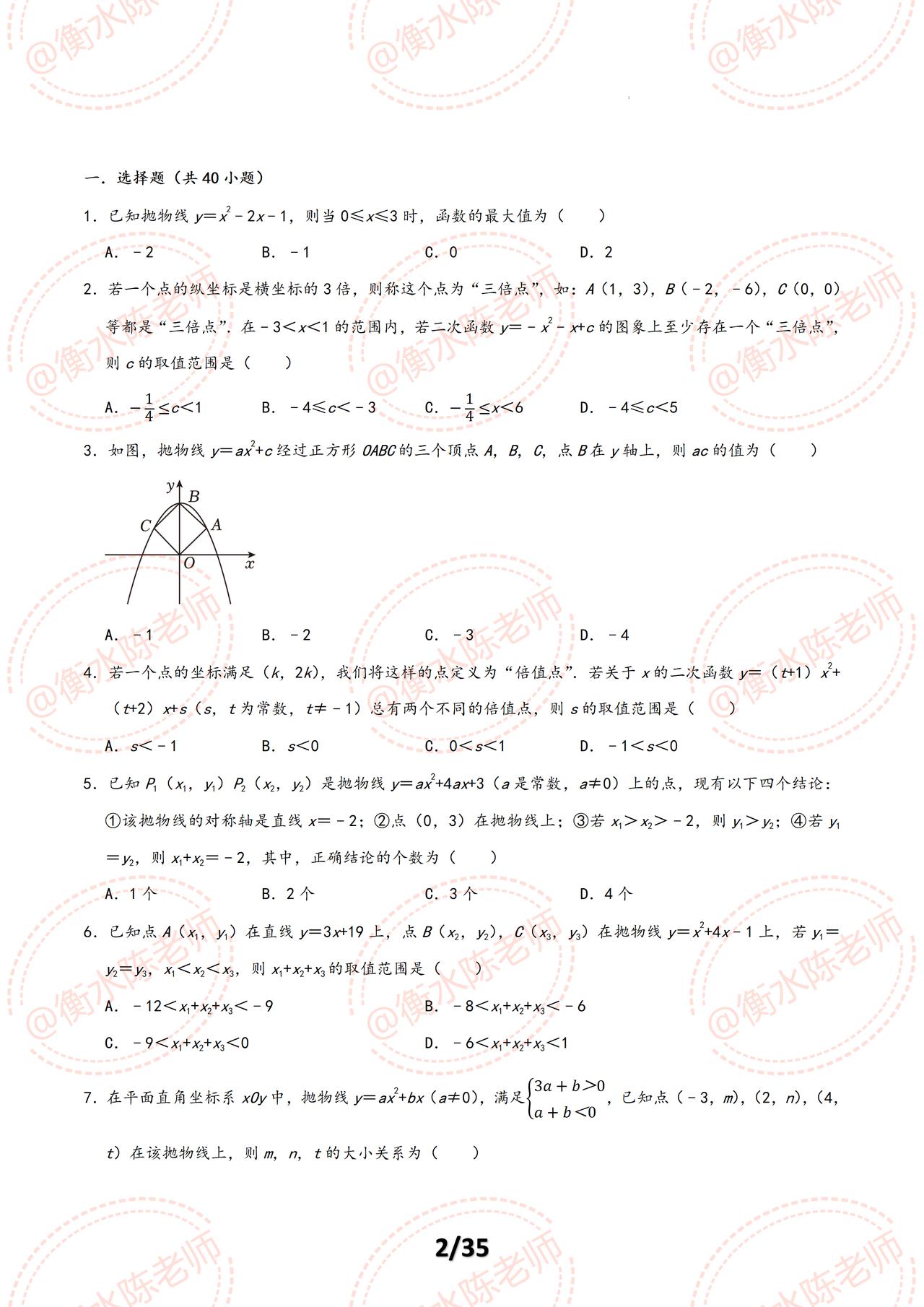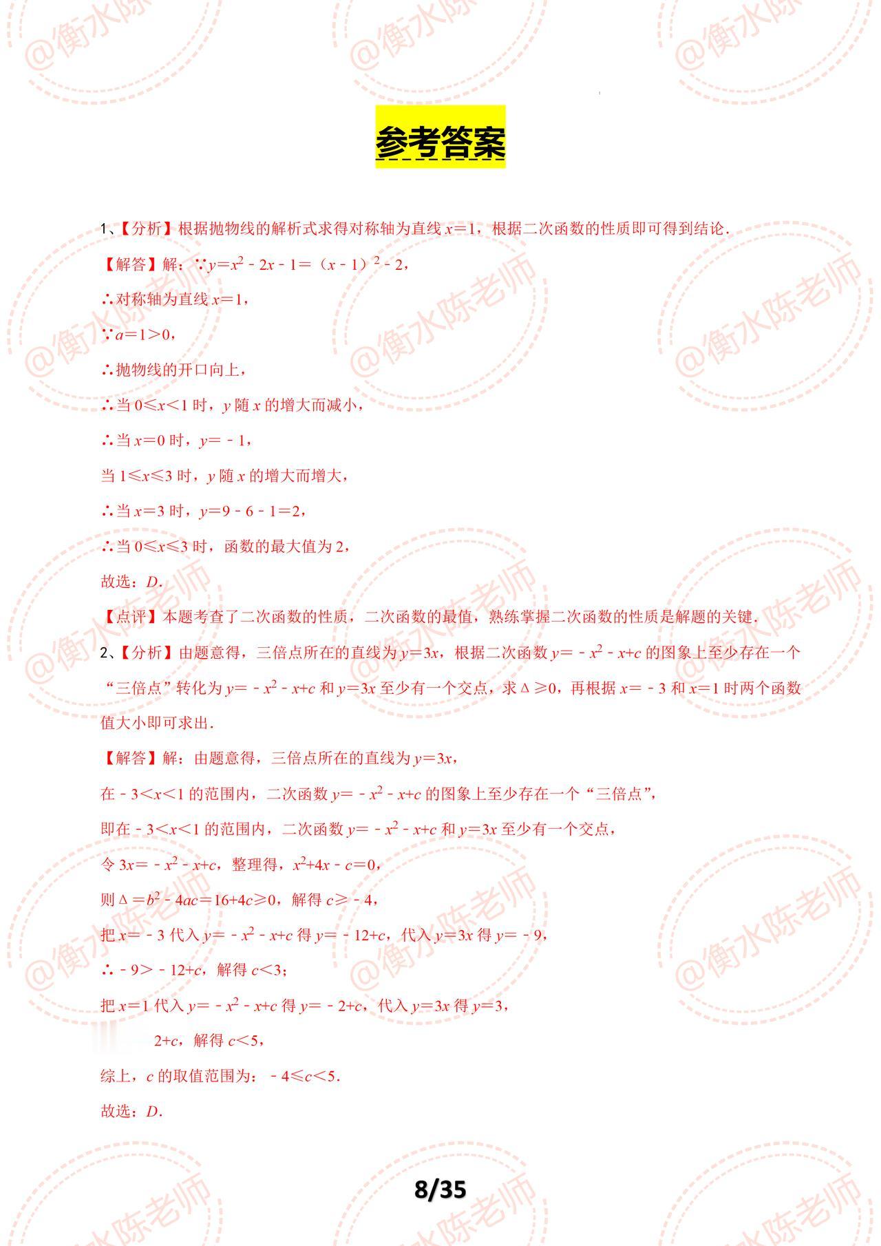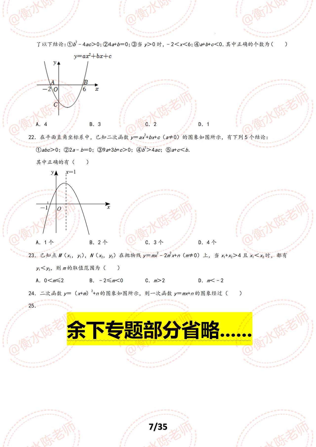 2023年中考数学【二次函数】没有彻底学好的同学,这套专题复习好好做一遍,考题都是大家经常做错的题型,也是中考大纲必出的考题,这方面的比较差的,一定要好好补一下分值占比很大的,同学们课下认真做一遍哦,由于专题比较多,需要全部的,和我沟通哦。
