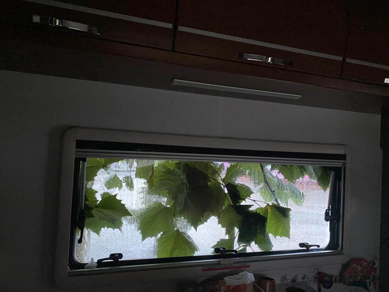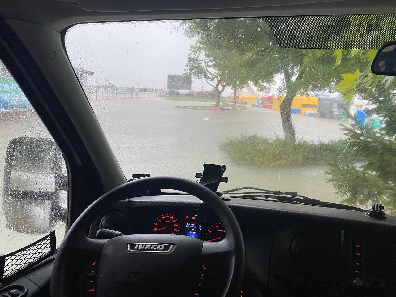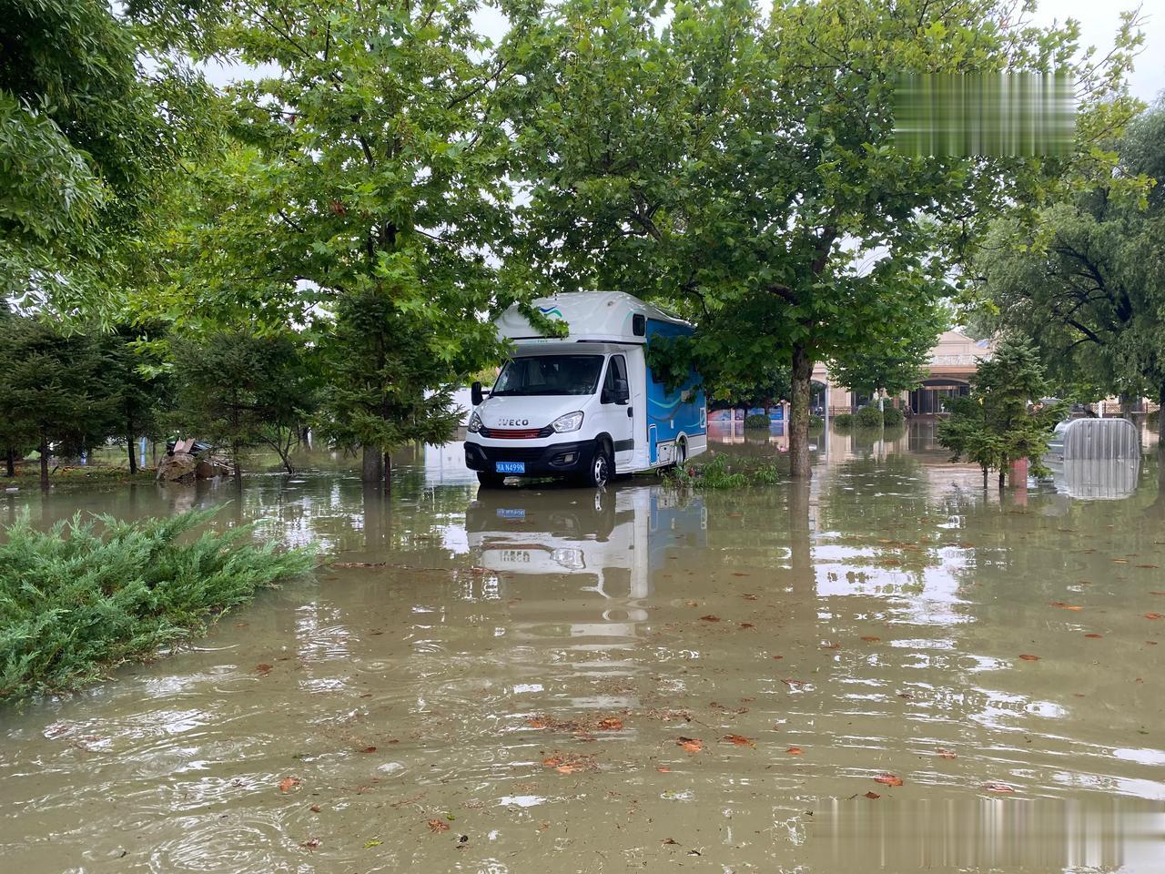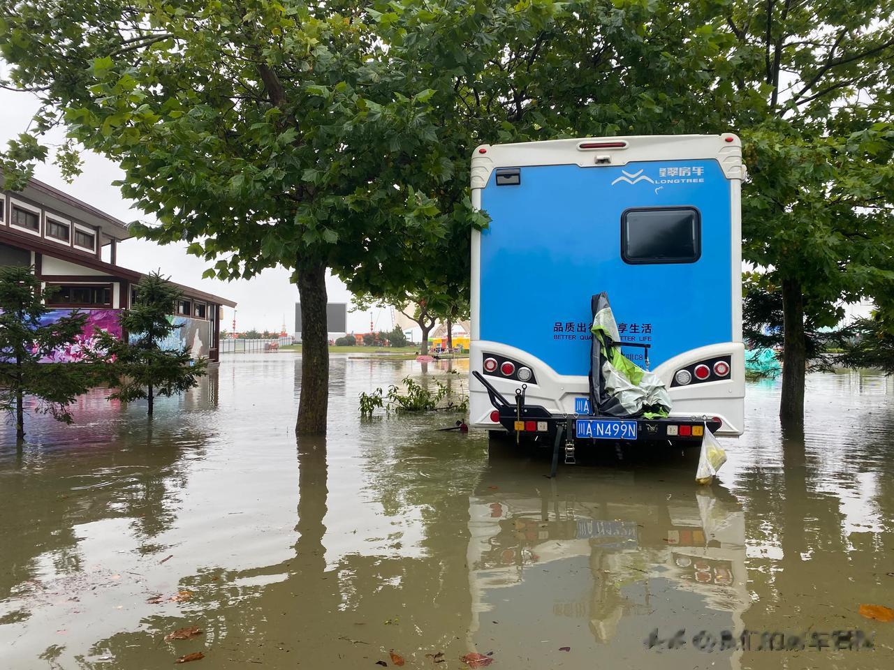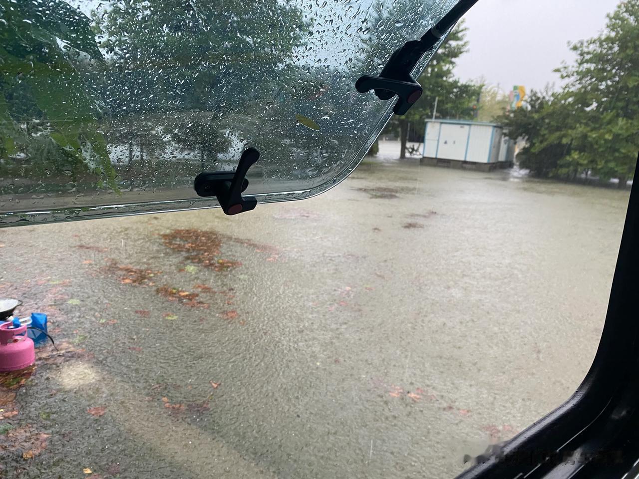 大连这台风今天能过去么?我好怕我这房车撑不住啊! 连续下了2天雨,今天已经第三天了,之前只知道宁波那块台风很大,这边还只是小雨,那边今天台风已过开始风和日丽了,我以为这事就这么过去了,跟我没太大关系的,之前也有关注天气预报说晚上雨就会停,没想到睡了一觉醒来,懵逼了,车都淹到轮胎了。 放眼望去,停车场全被淹了到处都是水,成阳去遛了一圈发现水已经到膝盖了,而且雨下的也非常大,想要把车直接开出去好像不太现实,怕车里进水影响使用,接下来旅行生活就噶屁了。 最后看看绿化带旁边还有一块地方位置较高,暂时没被淹,然后果断一觉油门干上去还能再顶会。但是雨一直下而且越下越大,不到一个小时就到轮胎了,虽然底盘高,但也害怕的很。好在刚刚雨已经停了,周围全部沦陷,只剩我们的房车立在那里。 目前还算安全,现在就祈祷不要再下雨了,也不要有风,不然房车随时都经不住这么折腾,毕竟停在了两棵树中间,只要风大点都害怕,树什么的倒了就得完完。天气预报说3-4点会下雨,下完就算过去了,希望能够撑过去。