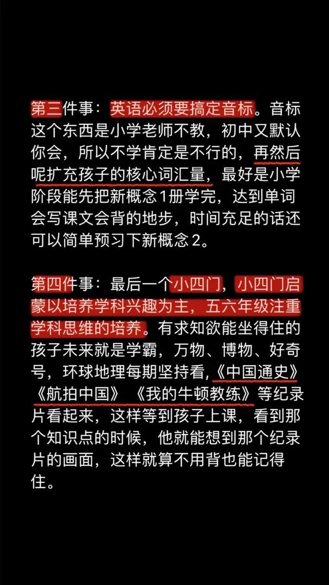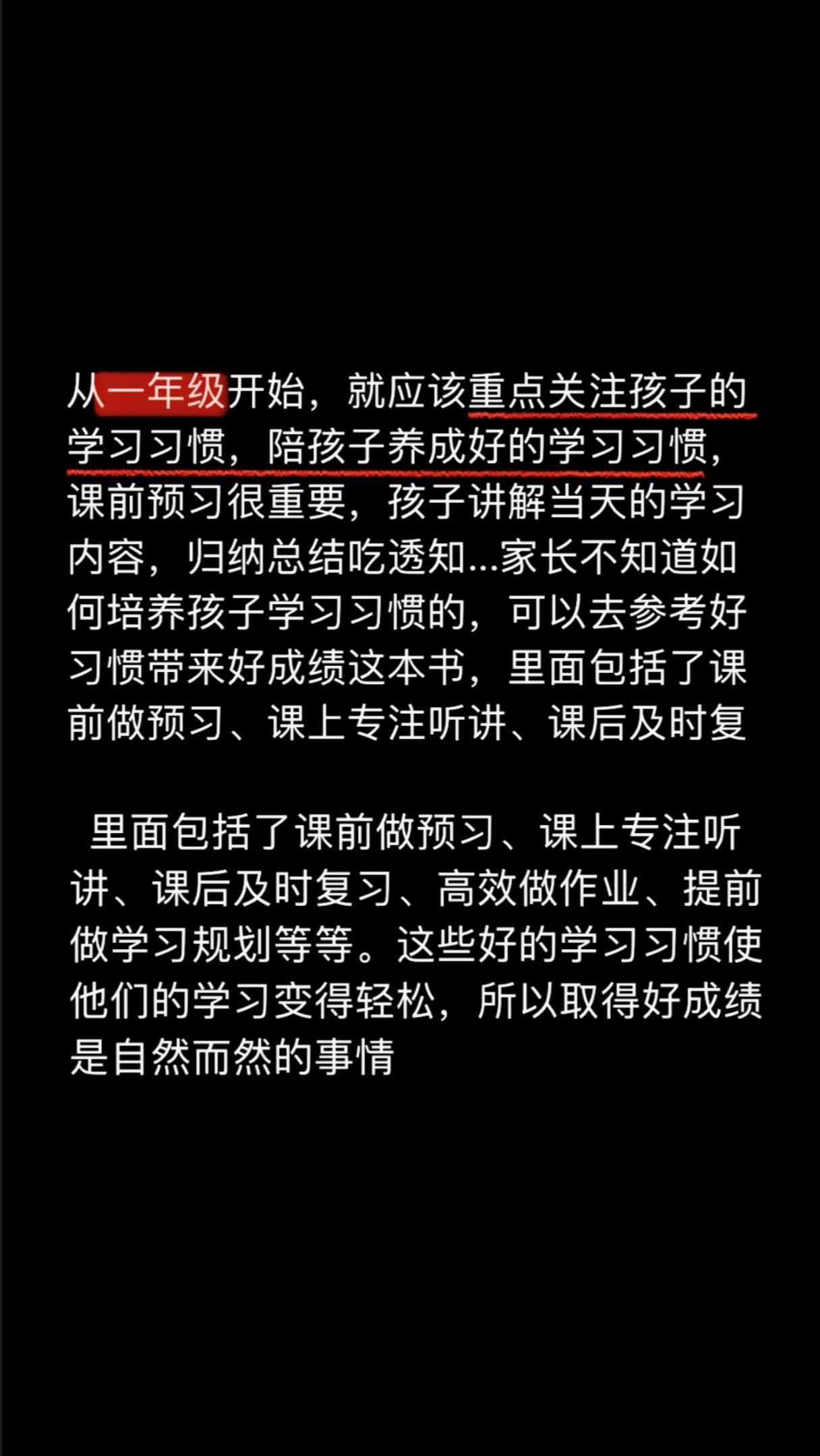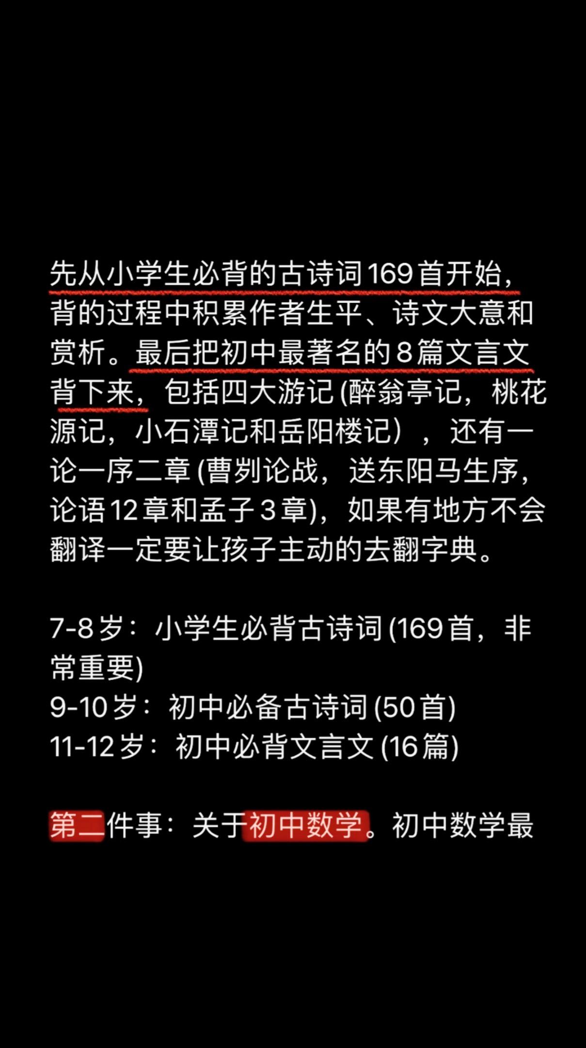 看到这位班主任的回答,我太太太太同意了!小学阶段的课内知识量占比仅3%,却长达六年。初中只有三年,却要学小学3倍的知识量。初中学不好,到了高中赶超的困难更大,而初中学不好往往就是小学一些习惯行为没养成,孩子吃力家长跟着也吃力。 小学阶段最重要的就是培养孩子的自主学习能力和好的学习习惯,要让孩子学会自主安排计划自己的学习和生活,独立完成自己的学习任务,不拖延。不知道该如何引导孩子的可以去看看漫画小学生管理和好习惯带来好成绩这几本书。 小学就规划好五件事,做好这几件事,能让孩子在初中三年有更多的灵活的时间 第一件事:语文上面,该背的务必提前背,记忆是理解之母,先混个脸熟。初高中直接吃老本,孩子会很轻松。先从小学生必备古诗词169首开始入手,最后把初中最著名的8篇文言文背下来 7-8岁:小学生必背古诗词(169首) 9-10岁:初中必备古诗词(50首) 11-12岁:初中必背文言文(16篇) ..... 家长如果懂全局统筹规划,提前为孩子规划优势学科,早早领先了同龄人,就能牢牢地把主动权掌握在自己手里 #孩子教育 #学习方法 #家长必读 #好习惯养成 #图文掘金计划