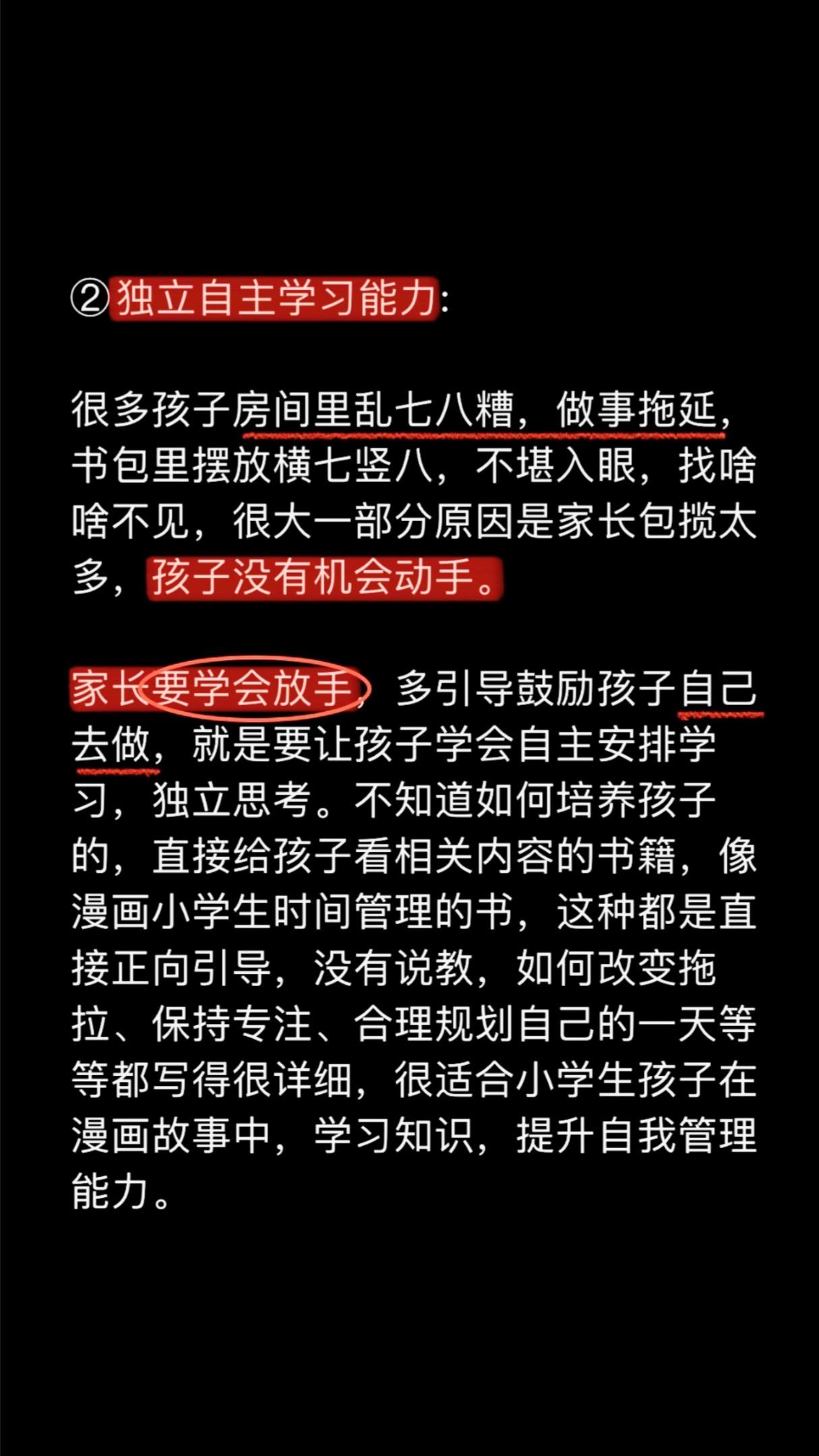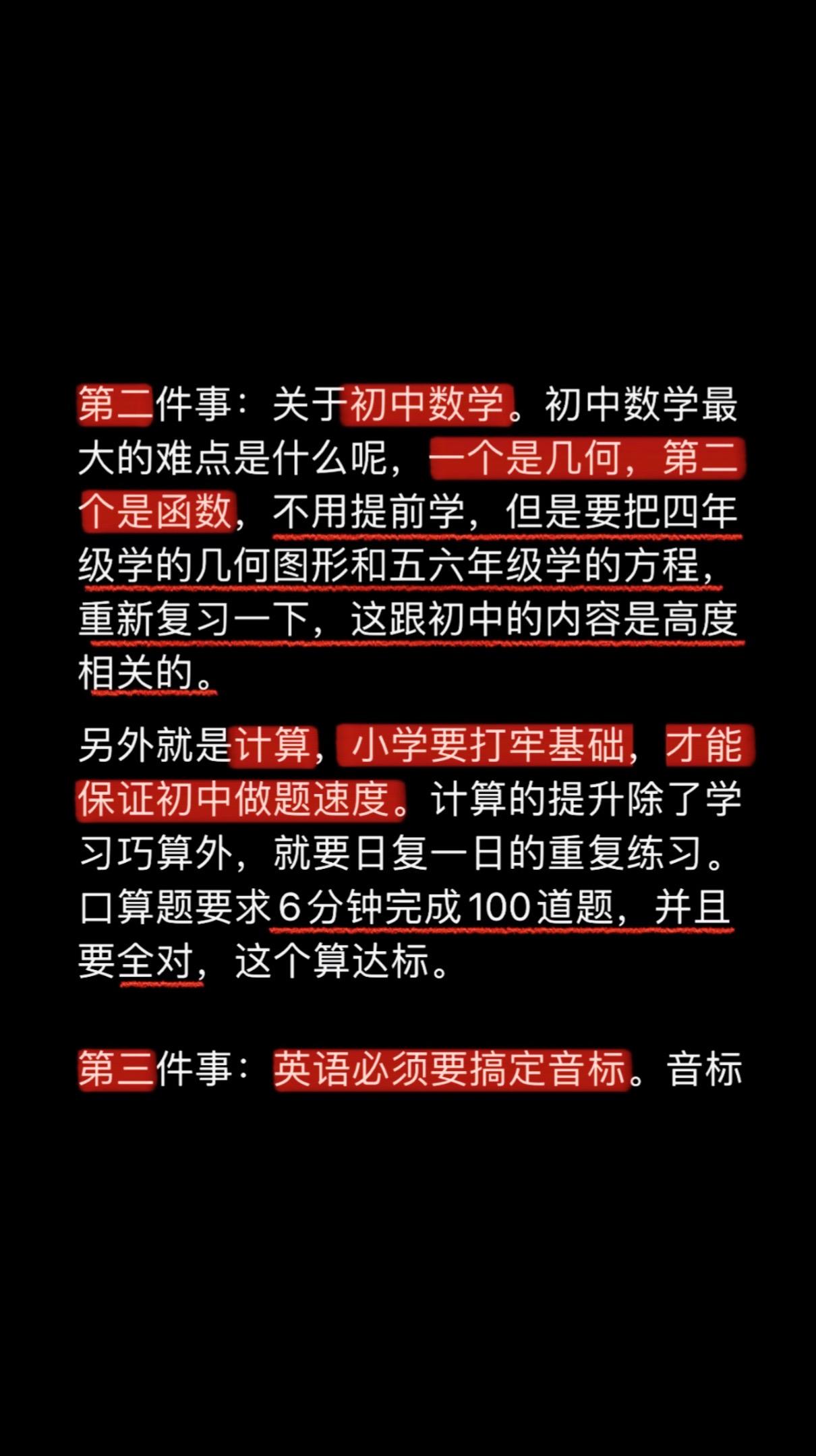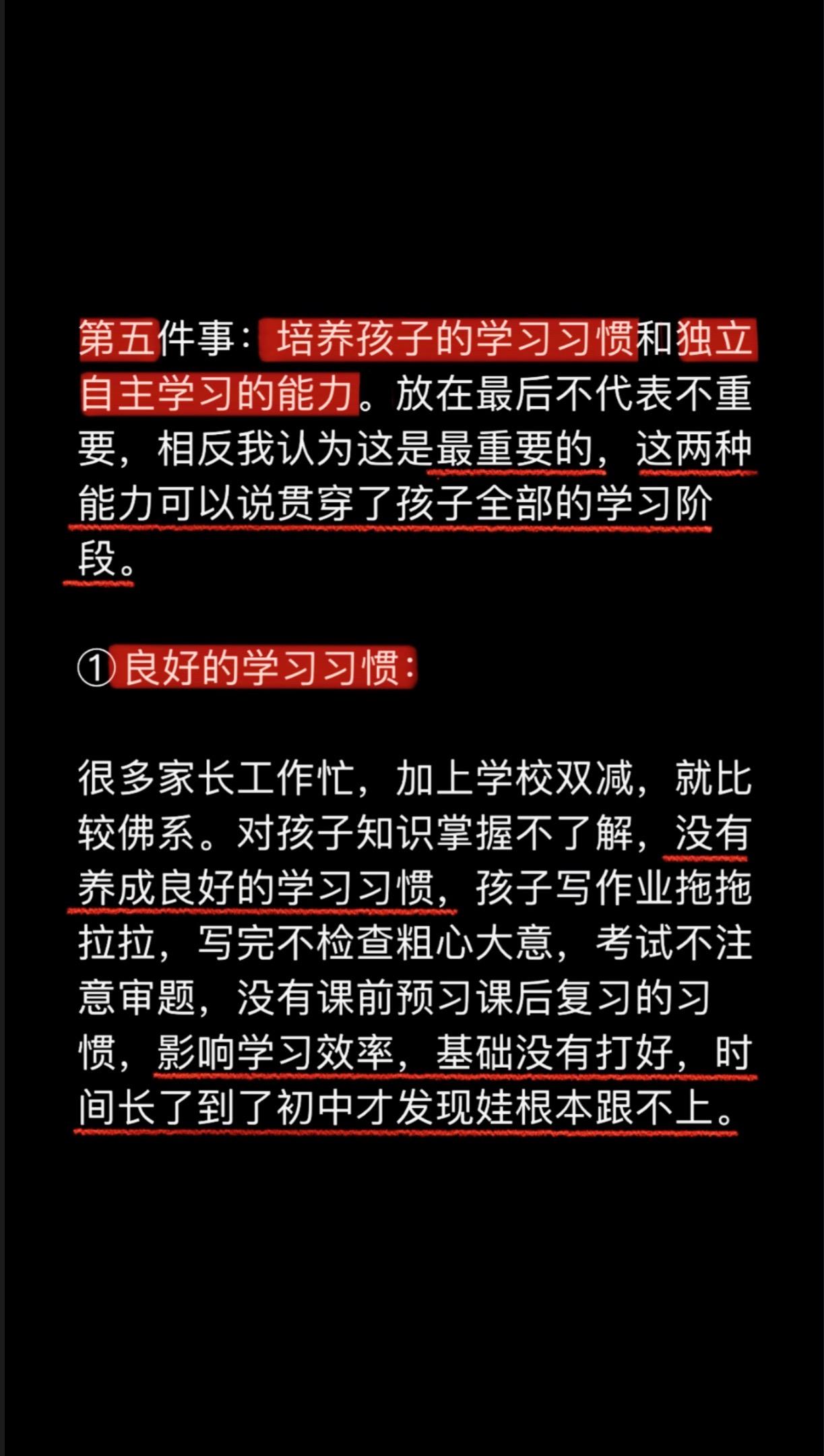 看到这位班主任的回答,我太太太太同意了!小学阶段的课内知识量占比仅3%,却长达六年。初中只有三年,却要学小学3倍的知识量。初中学不好,到了高中赶超的困难更大,而初中学不好往往就是小学一些习惯行为没养成,孩子吃力家长跟着也吃力。 小学阶段最重要的就是培养孩子的自主学习能力和好的学习习惯,要让孩子学会自主安排计划自己的学习和生活,独立完成自己的学习任务,不拖延。不知道该如何引导孩子的可以去看看漫画小学生管理和好习惯带来好成绩这几本书。 小学就规划好五件事,做好这几件事,能让孩子在初中三年有更多的灵活的时间 第一件事:语文上面,该背的务必提前背,记忆是理解之母,先混个脸熟。初高中直接吃老本,孩子会很轻松。先从小学生必备古诗词169首开始入手,最后把初中最著名的8篇文言文背下来 7-8岁:小学生必背古诗词(169首) 9-10岁:初中必备古诗词(50首) 11-12岁:初中必背文言文(16篇) ..... 家长如果懂全局统筹规划,提前为孩子规划优势学科,早早领先了同龄人,就能牢牢地把主动权掌握在自己手里 #孩子教育 #学习方法 #家长必读 #好习惯养成 #图文掘金计划