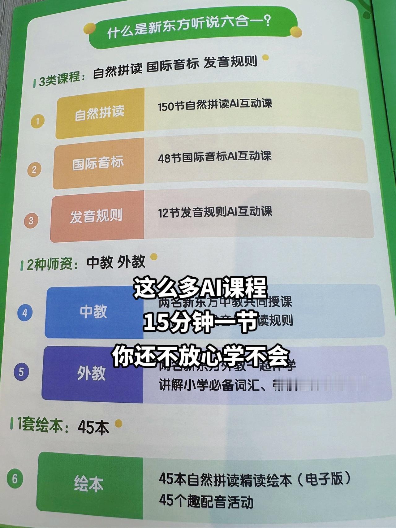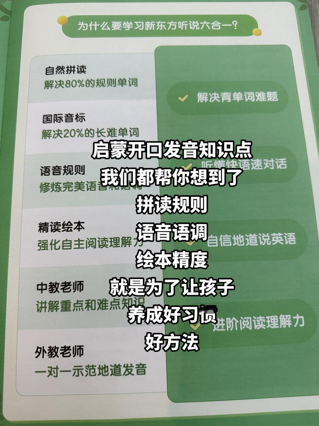 英语零起点启蒙到底怎么学?如果孩子英语零起点,基础不好。无非是兴趣和方法。 兴趣的前提其实不是孩子喜欢,而且孩子在学习过程中的自驱力,说白了就是自信,成就感。英语学习能够让孩子达成成就感的就是发音和能自我阅读。所以在启蒙环节你逃离不了,对于自然拼读和语音语调的学习。当孩子发音好了,他就可以自我欣赏,自信,自驱力也随之而来。我带的发音好的孩子,英语基本都不差。而且学习习惯会更好。 方法就是自然拼读和语音语调。不然咱们孩子天天泛听也是一个寂寞。掌握自然拼读和语音语调就是英语听力的解码。 新东方这次推出的六合一,把自然拼读,音标学习,语音语调进行系统化组合,原来独立分离甚至不适合零基础孩子的内容,通过专业的教学团队整合,将核心词汇,口语句型和绘本精度结合在一起,210节有课前课后的中教系统AI学习,配合500节外教纠音小KE,真正帮助零起点的学生开口建立英语自信。还有21天陪跑营。价格太亲民。真的,学英语,还得相信新东方。自然拼读 音标