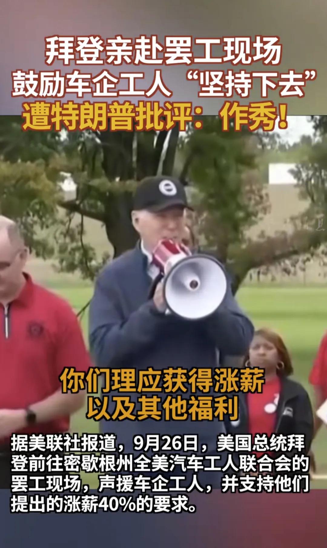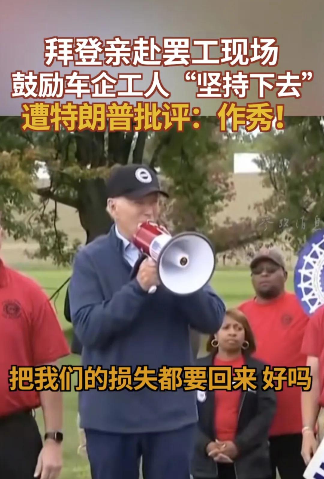 拜登26日加入到工会游行队之中,拜登支持车企工人们罢工,支持工人要求涨薪40%的要求,拜登让工人们坚持下去,把损失的都要回来。不过外界指出拜登之所以来密歇根州支持工人,那是因为该州是明年大选的关键州。对此特朗普表示,拜登这是在“作秀”,并抨击拜登的政策摧毁了美国汽车工业,才导致大量工人失业。据悉,特朗普27日也将启程前往密歇根州,参与对该州的“争夺”。